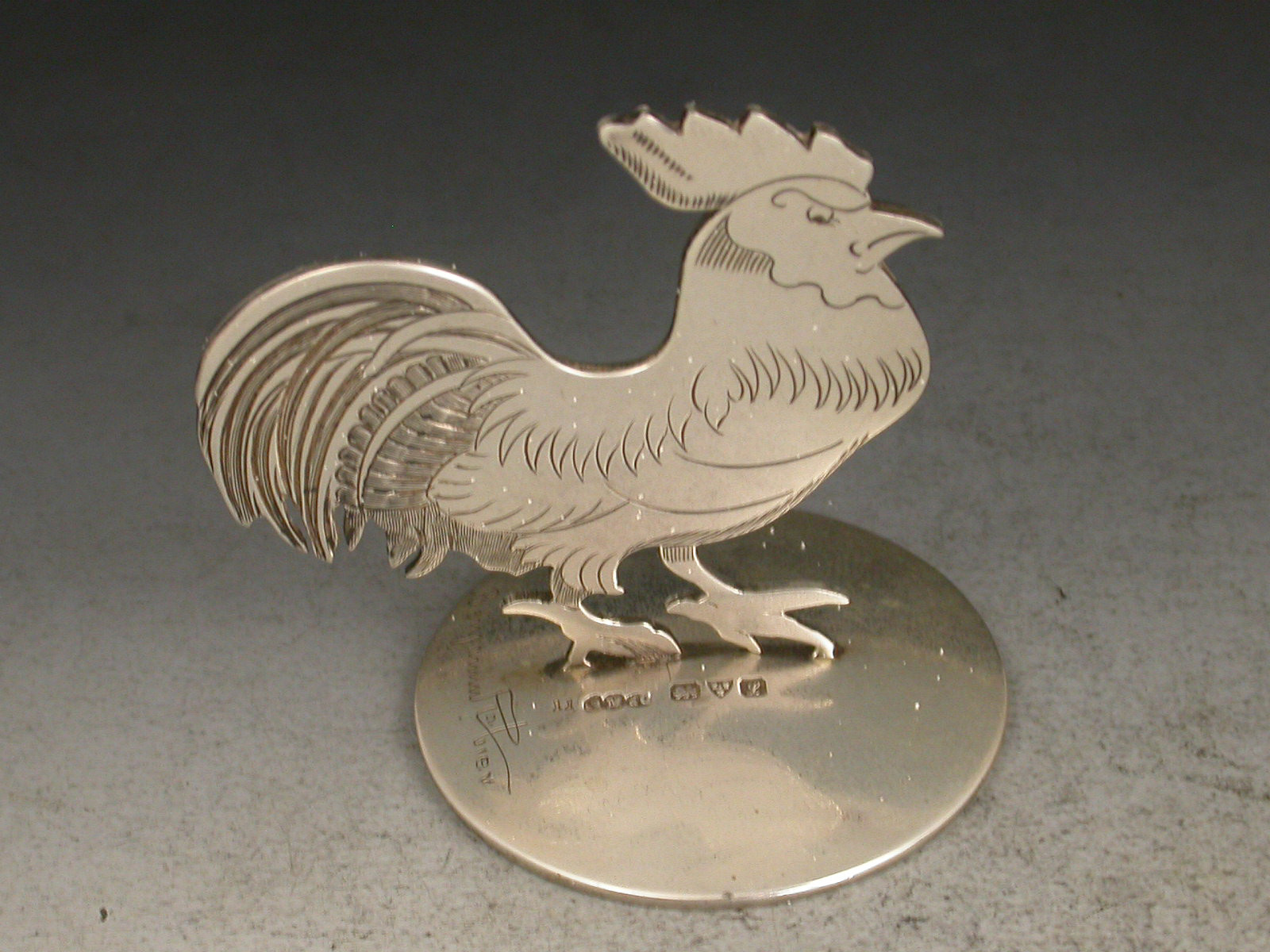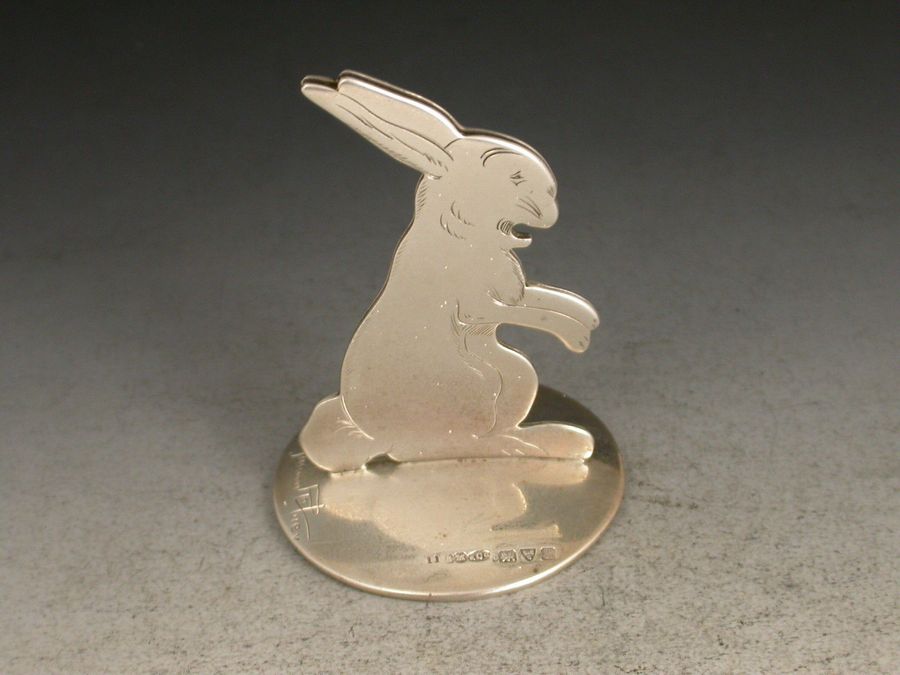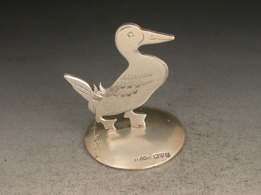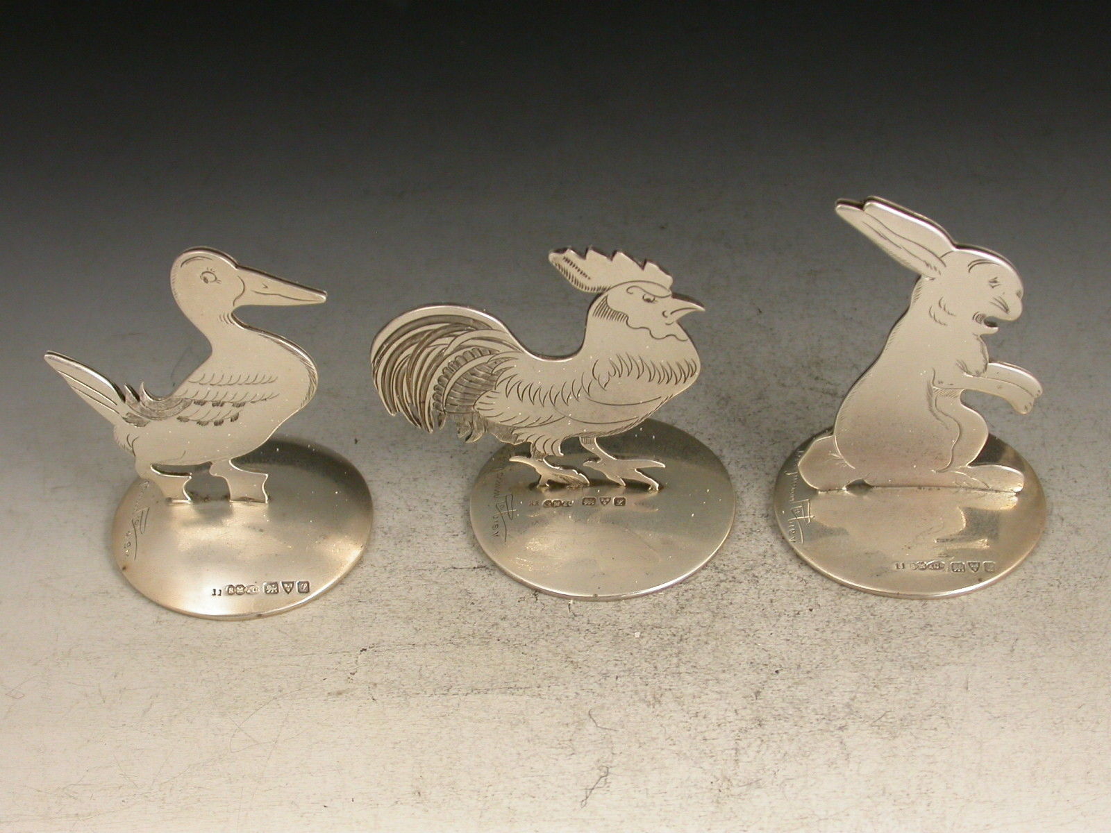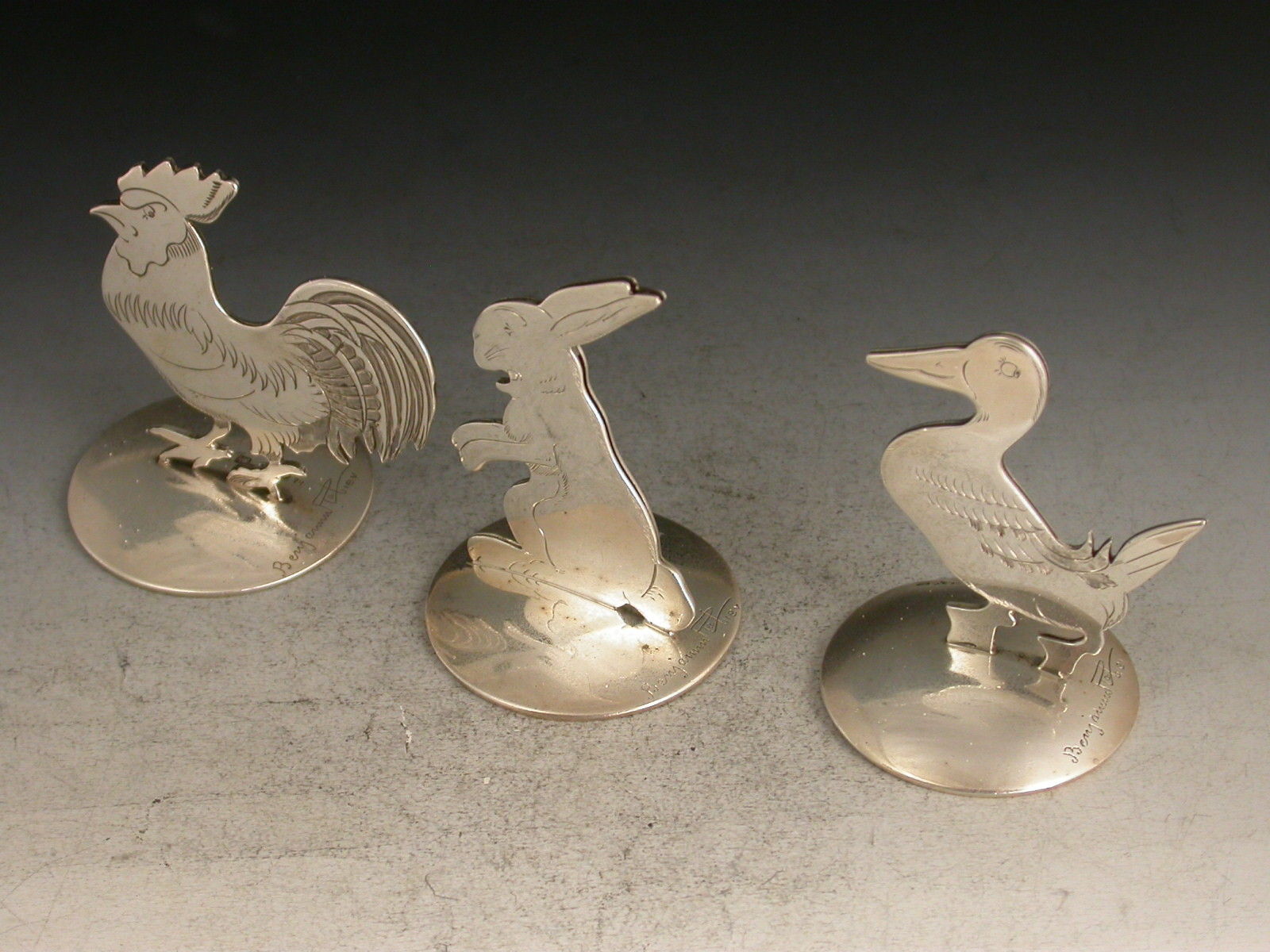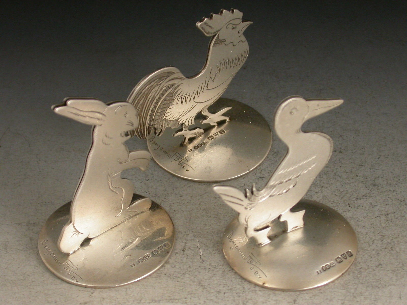 A fine set of three Edwardian novelty silver Menu Holders formed as comical farmyard animals: a cockerel, a duck and a rabbit, standing on domed circular bases. Designed and signed by Benjamin Rabier.