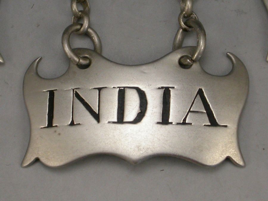 An extremely rare set of three late George II silver Sauce Labels of irregular rectangular or escutcheon form, incised and niello filled for Soye, India and Tarragon.