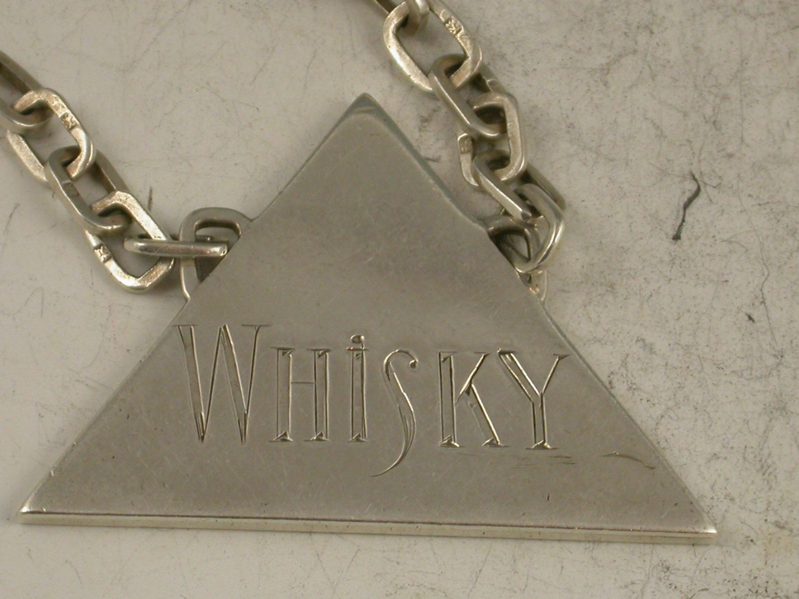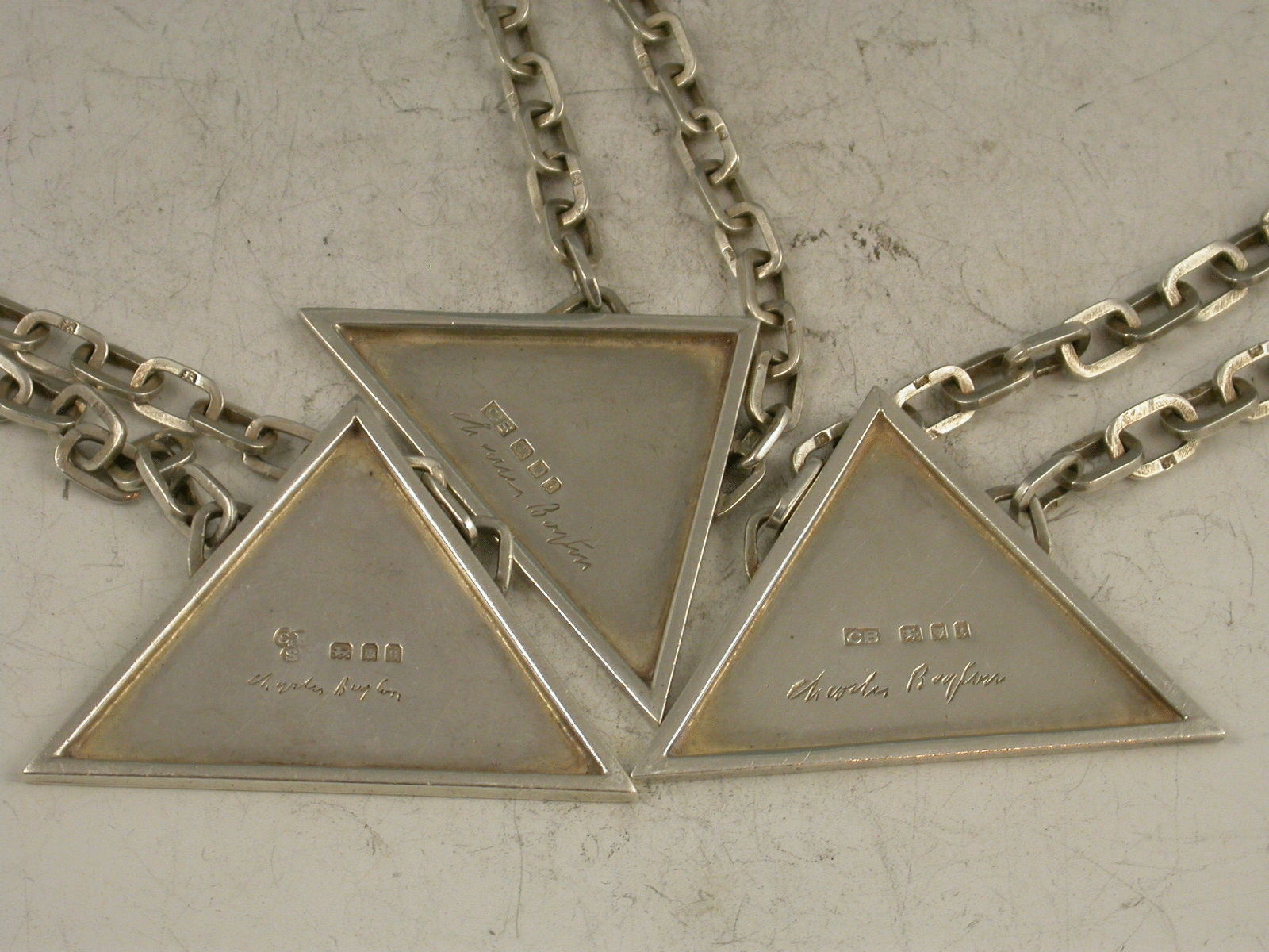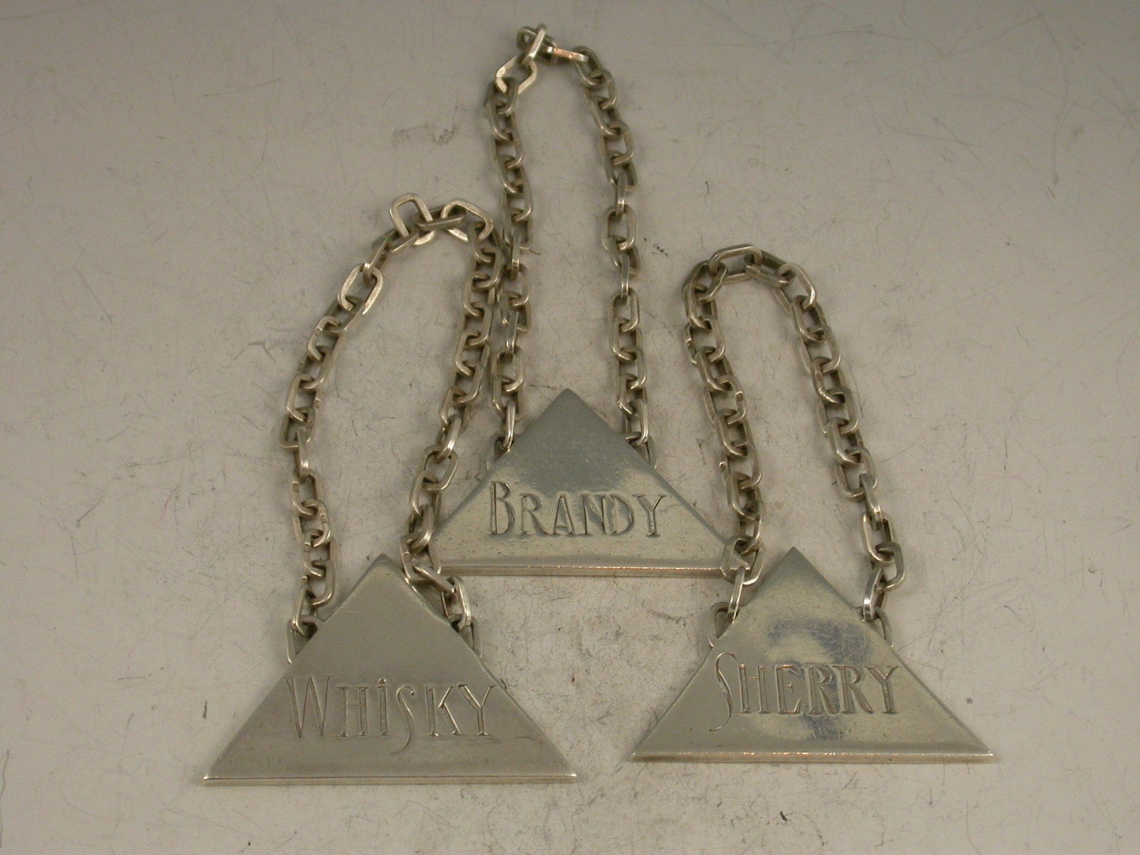 A unusual and very stylish set of three Art Deco silver Wine Labels of plain triangular form with distinctive suspension chains with rectangular links, incised for Whisky, Sherry and Brandy. Signed by Charles Boyton.