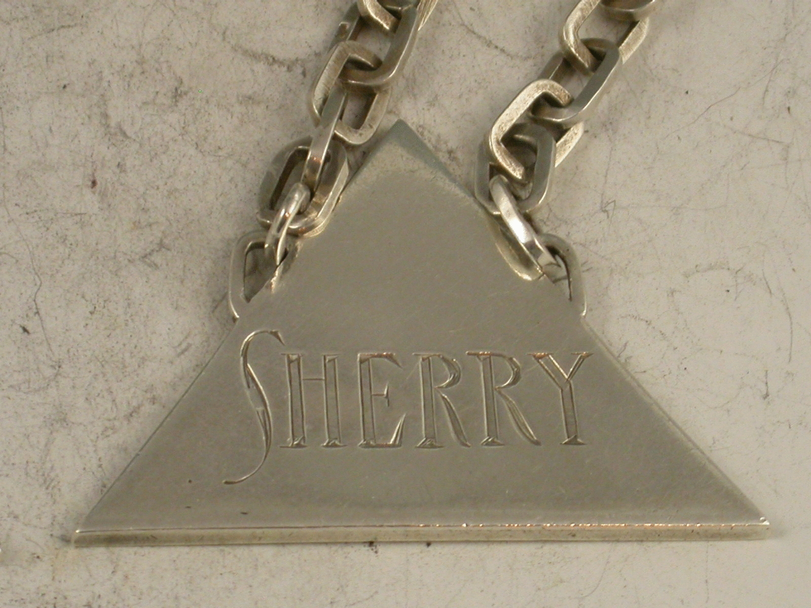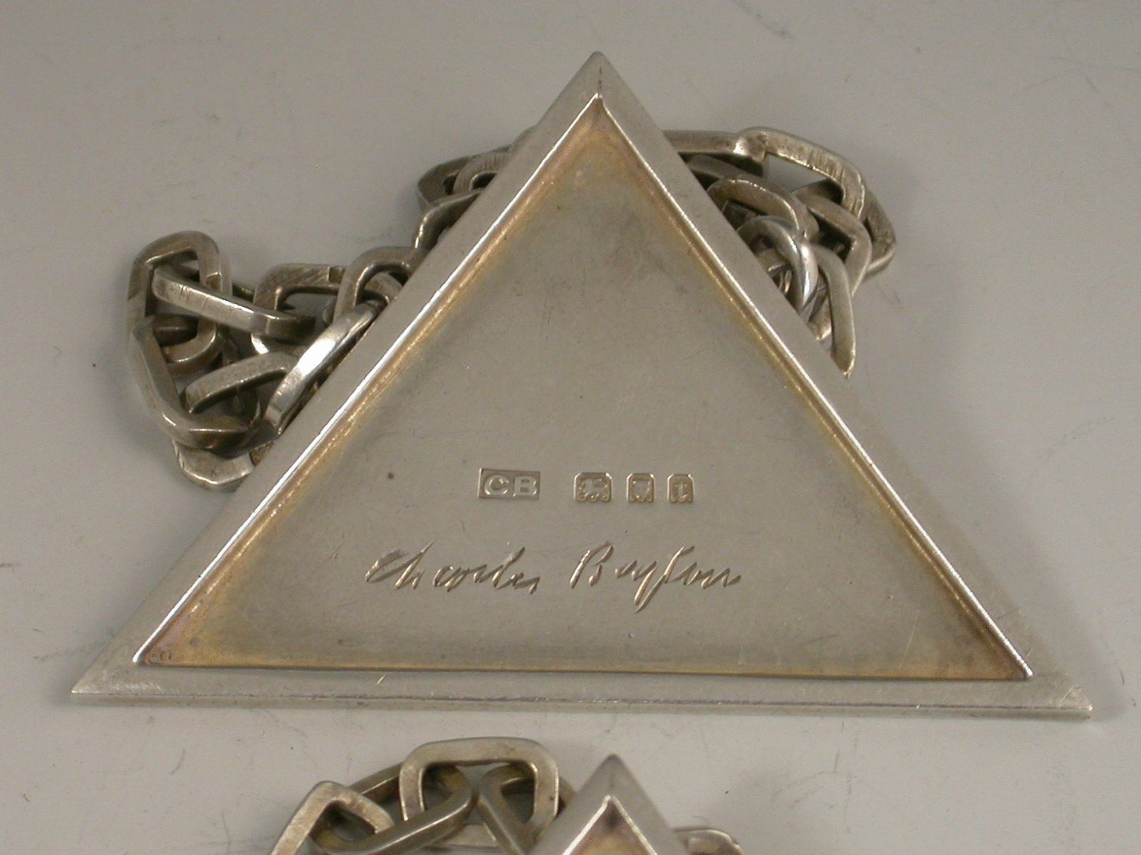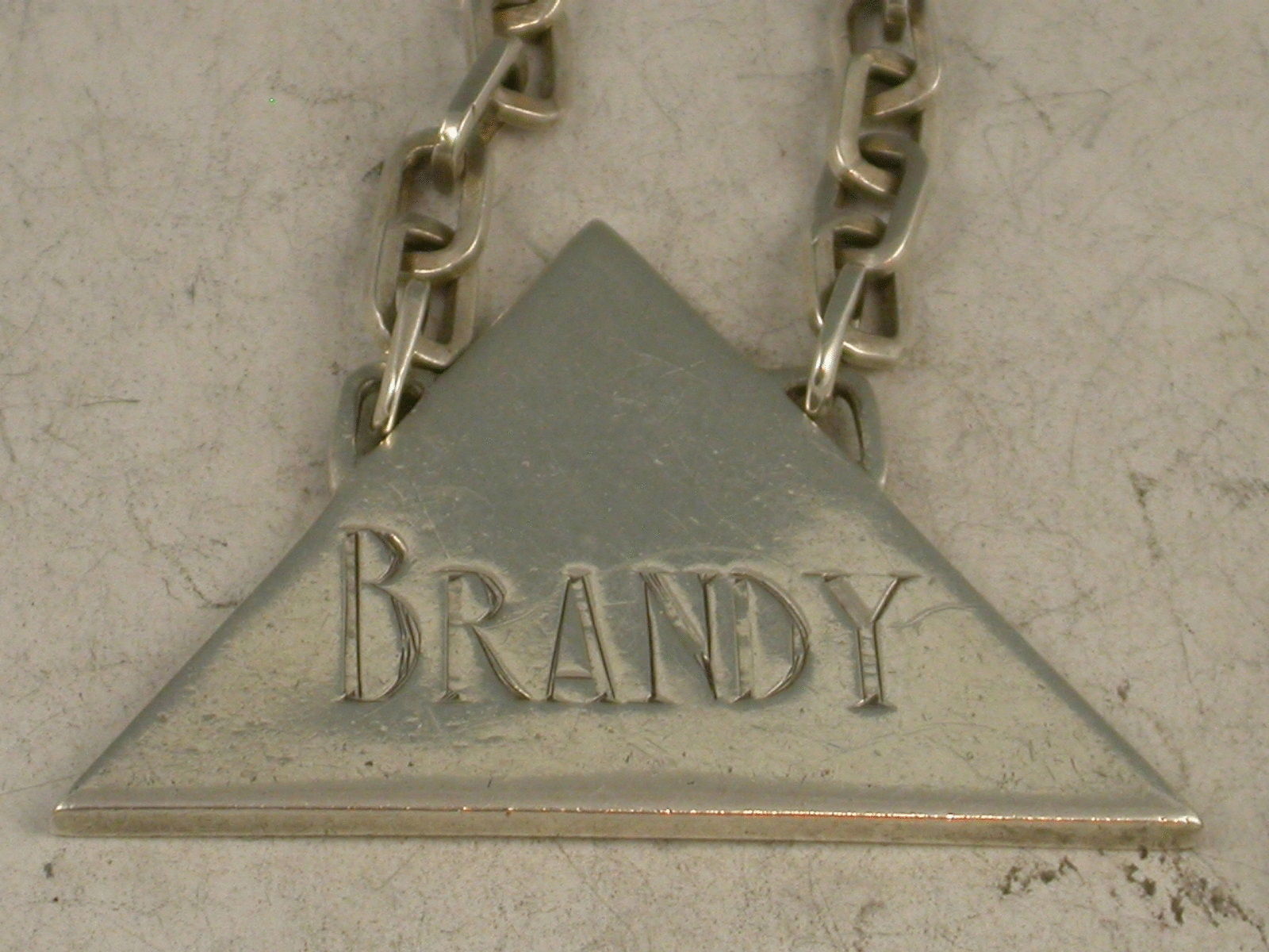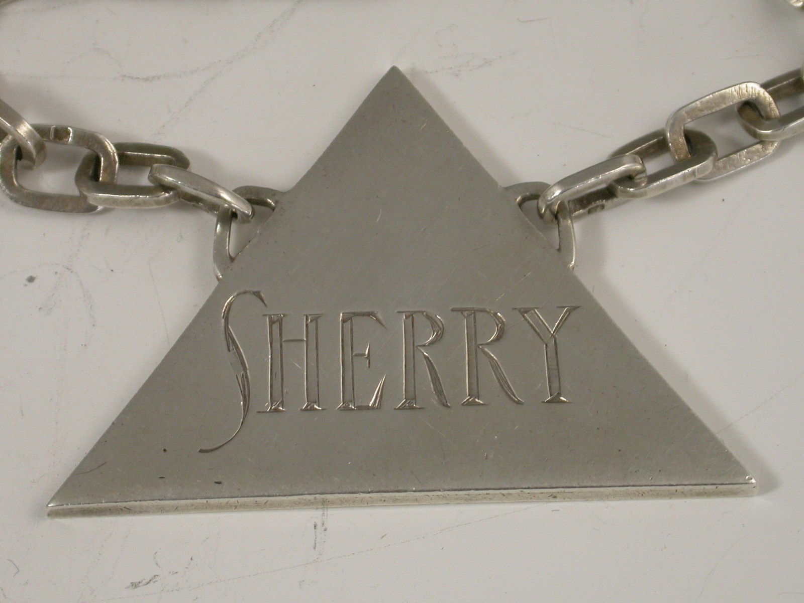 A unusual and very stylish set of three Art Deco silver Wine Labels of plain triangular form with distinctive suspension chains with rectangular links, incised for Whisky, Sherry and Brandy. Signed by Charles Boyton.