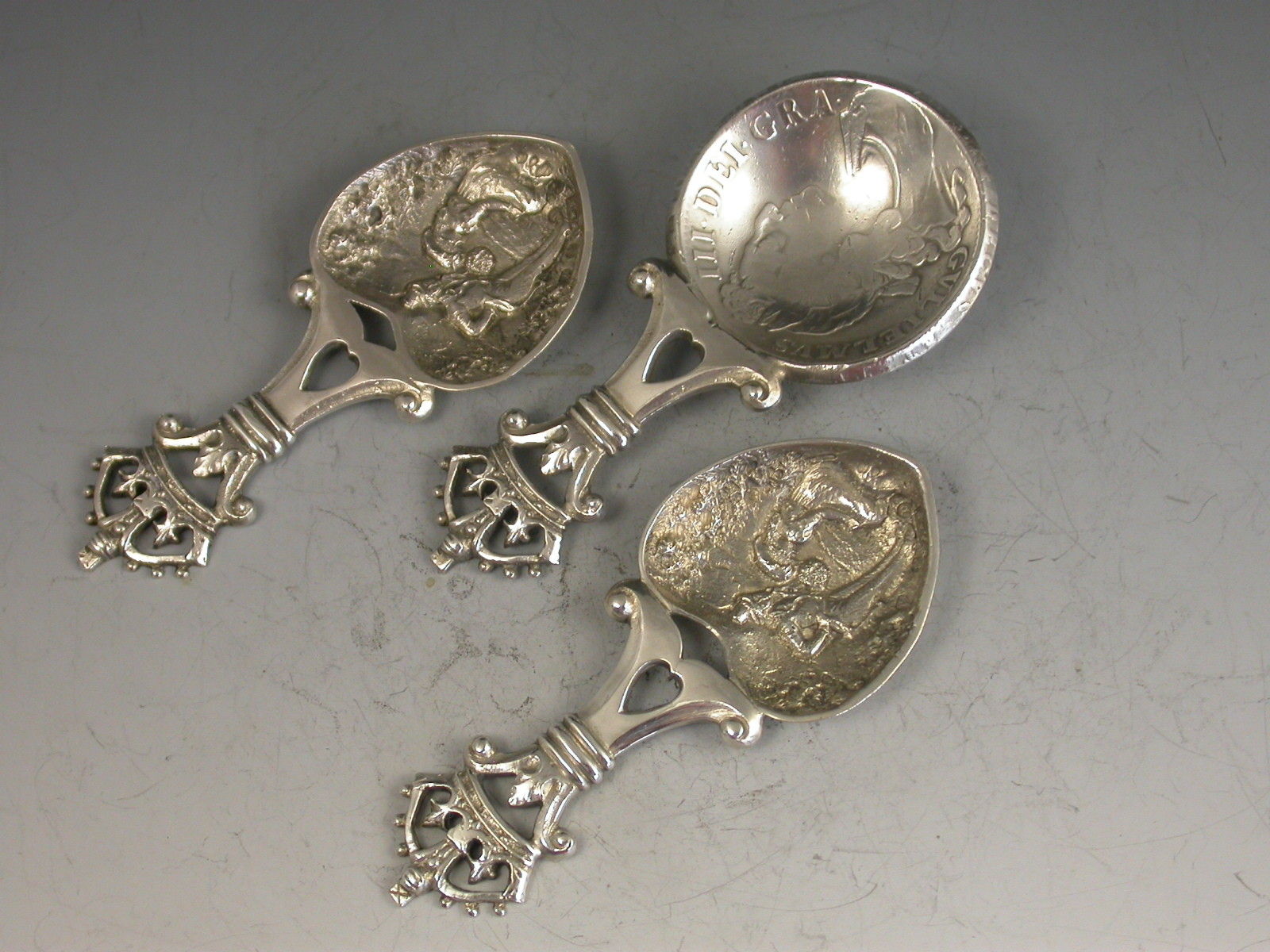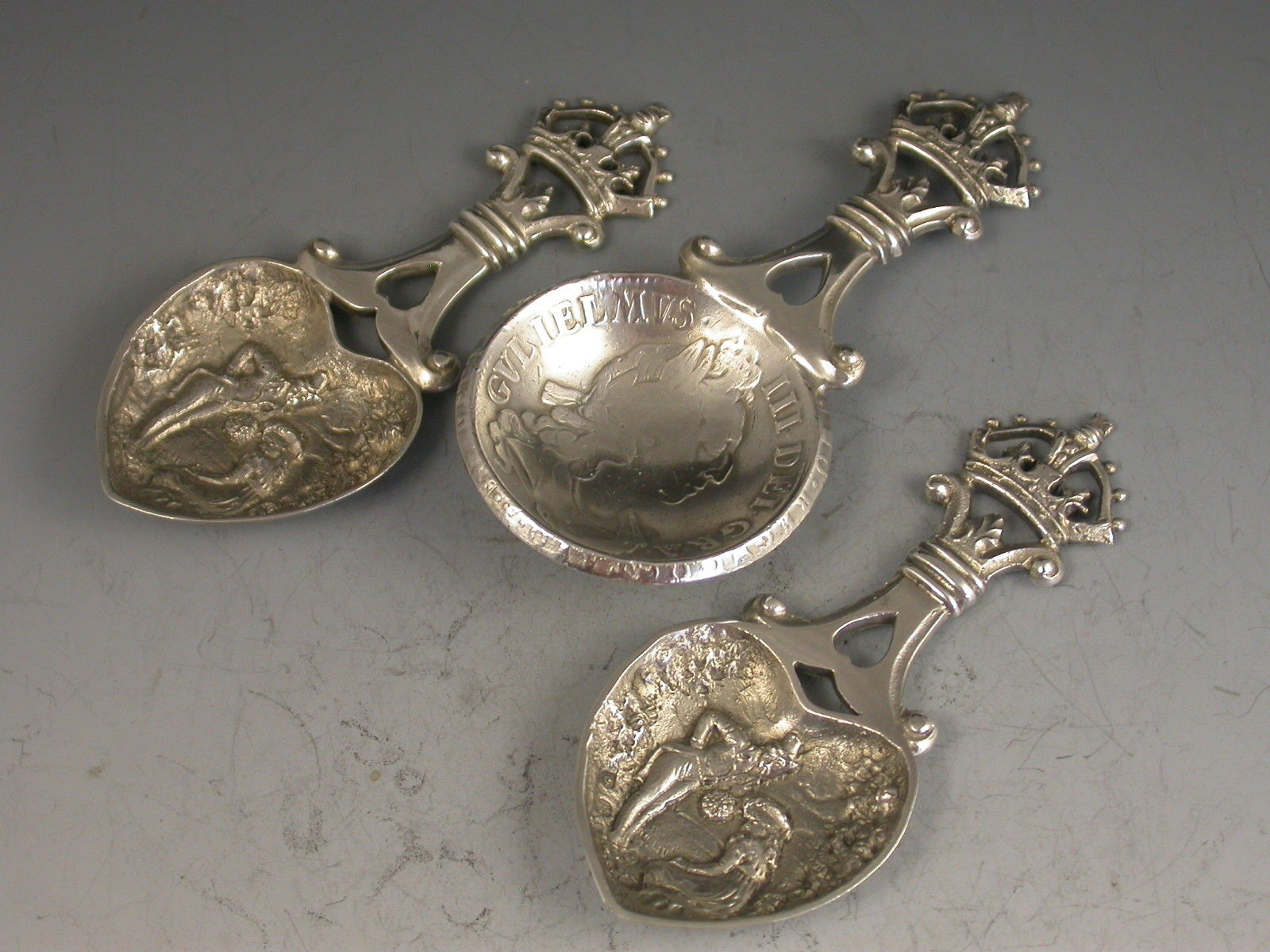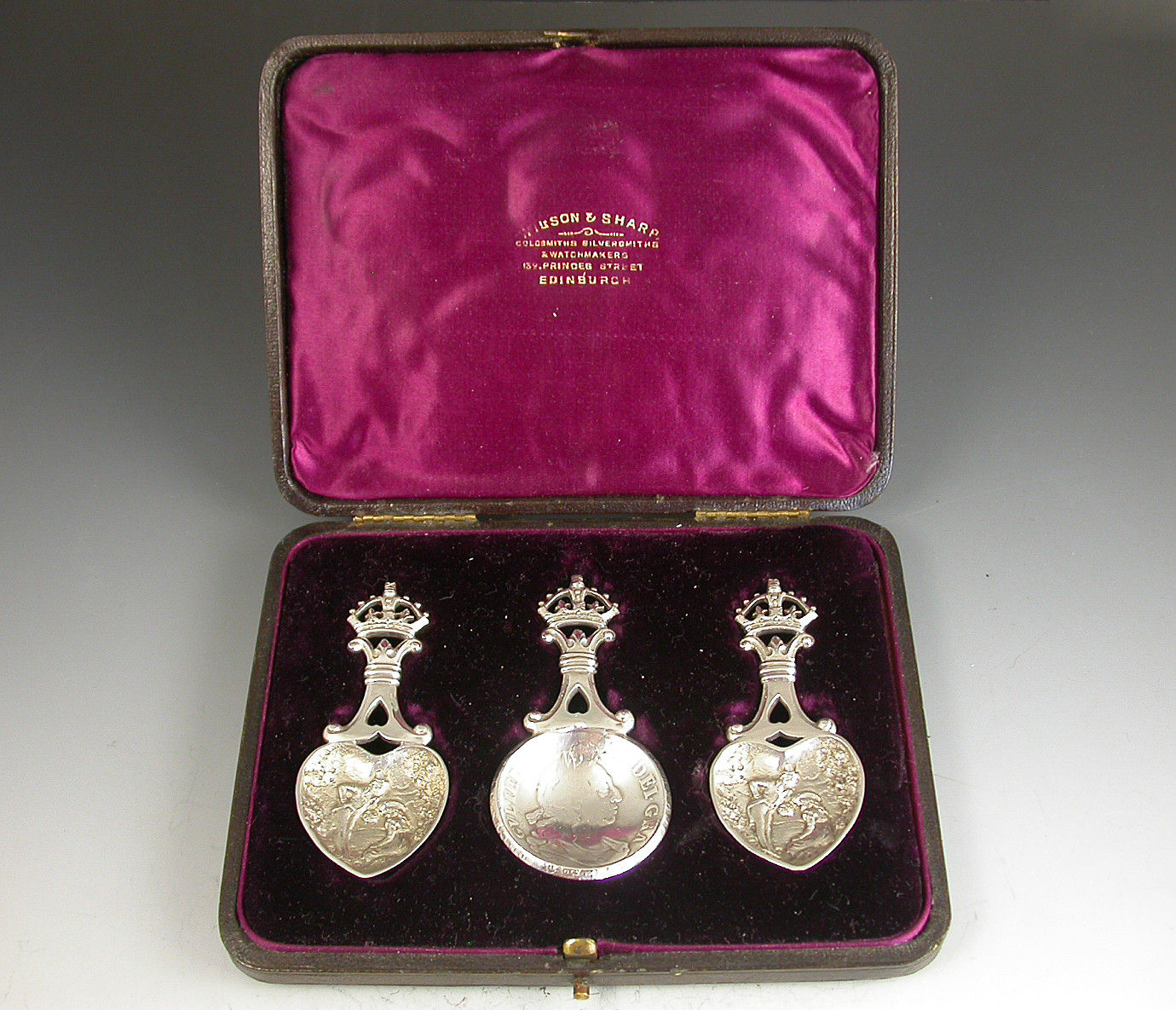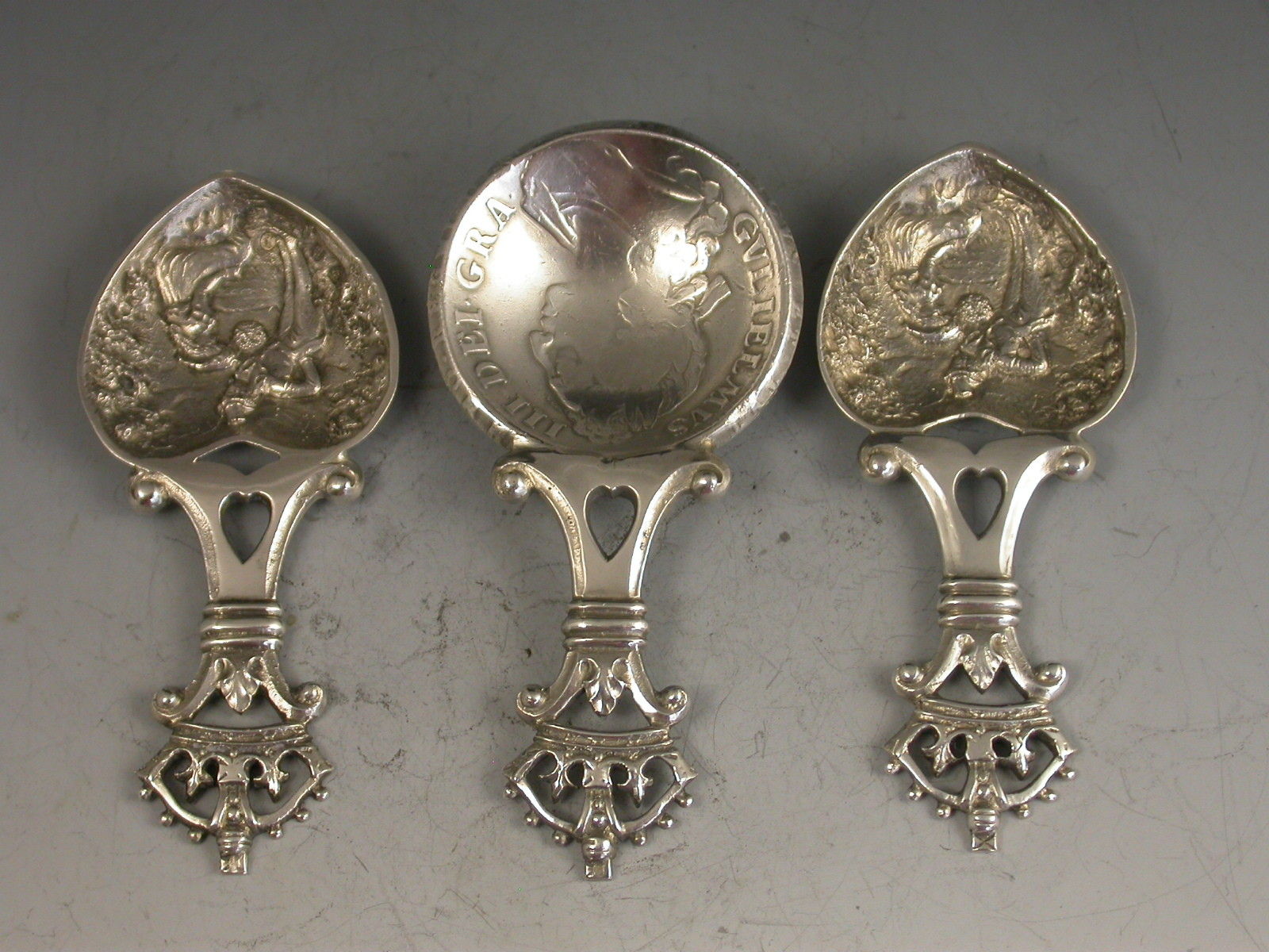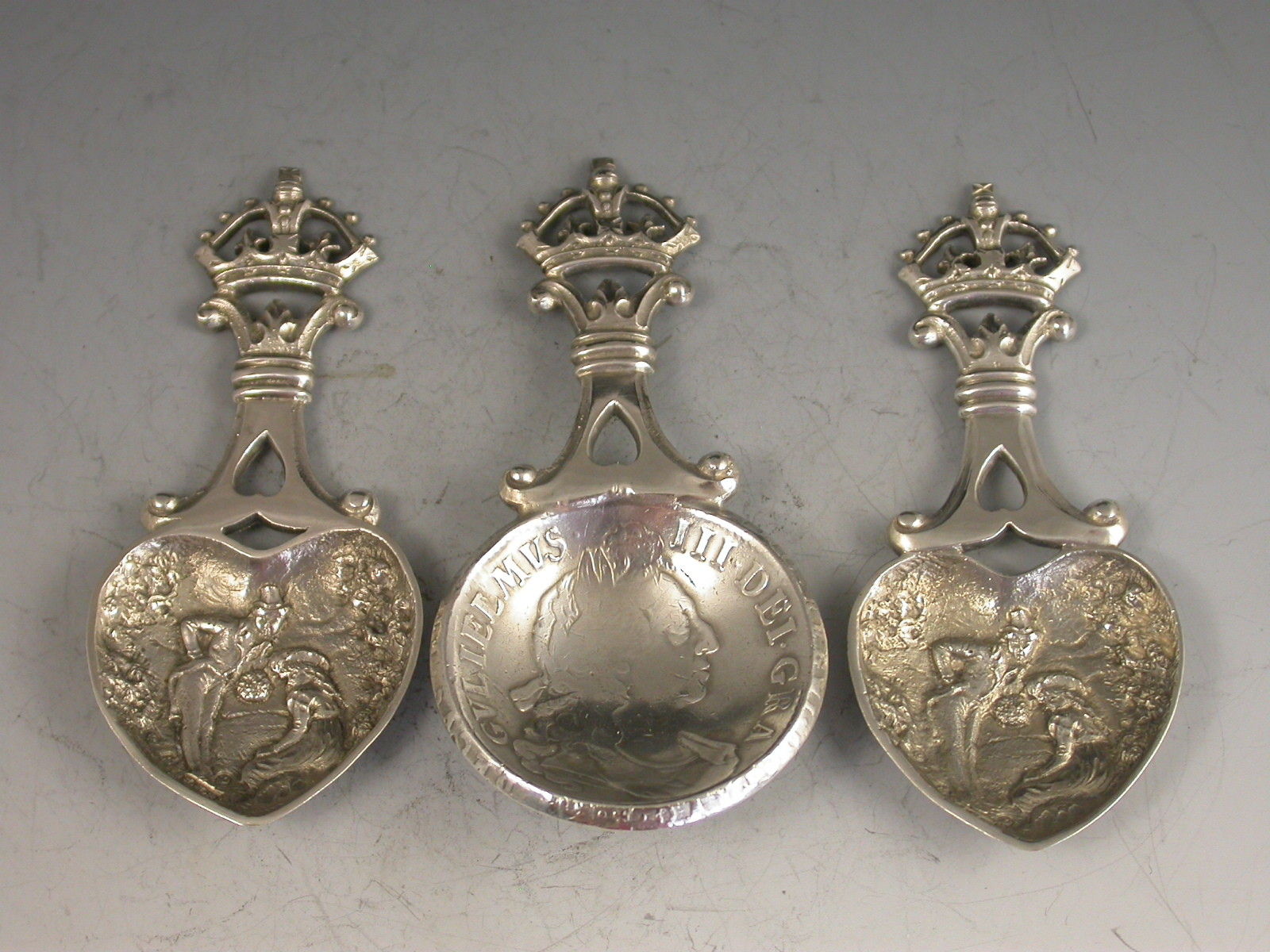 An unusual cased set of three Victorian Scottish silver Caddy Spoons, two by John Maitland Talbot of Edinburgh 1896 with die-stamped heart shaped bowls depicting a gentleman offering a lady a bouquet of flowers and with pierced handles with crown finials, the third unmarked spoon with a similar handle and a bowl formed from a William III 1696 Crown.