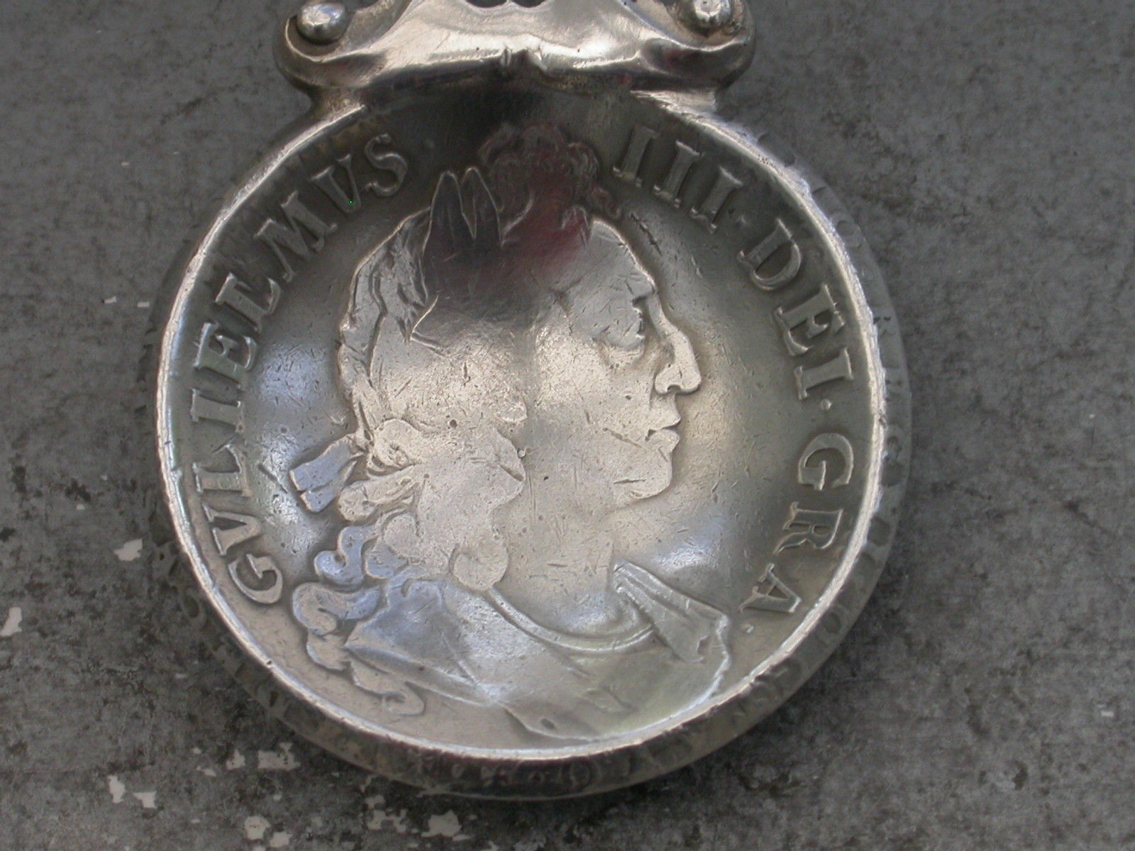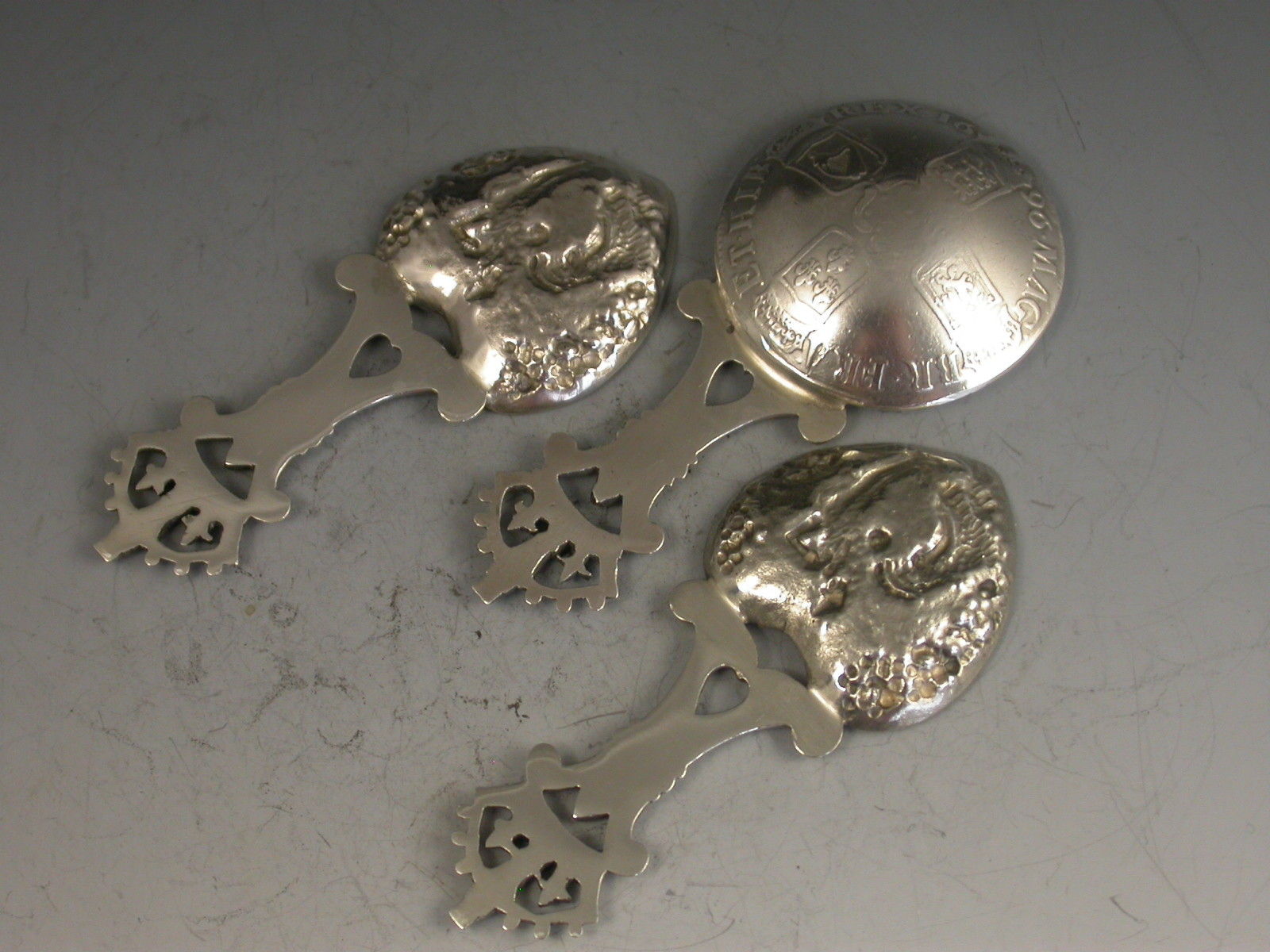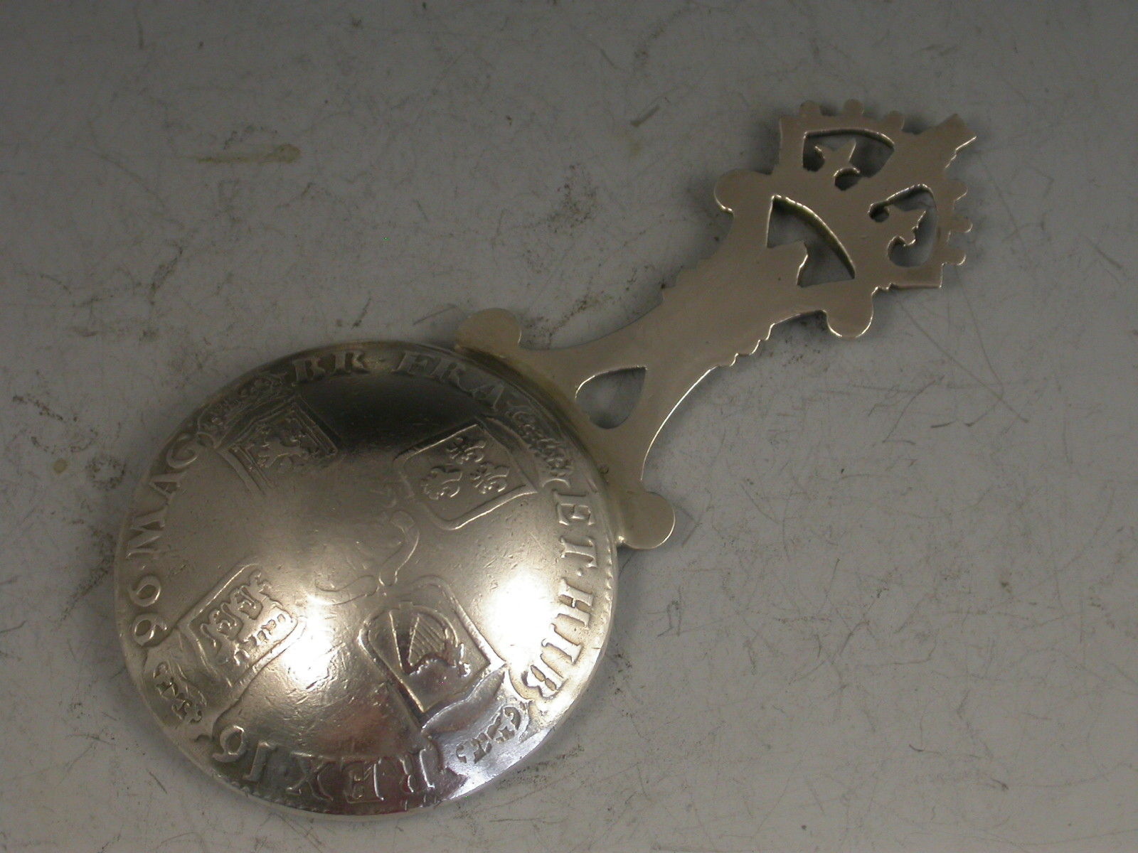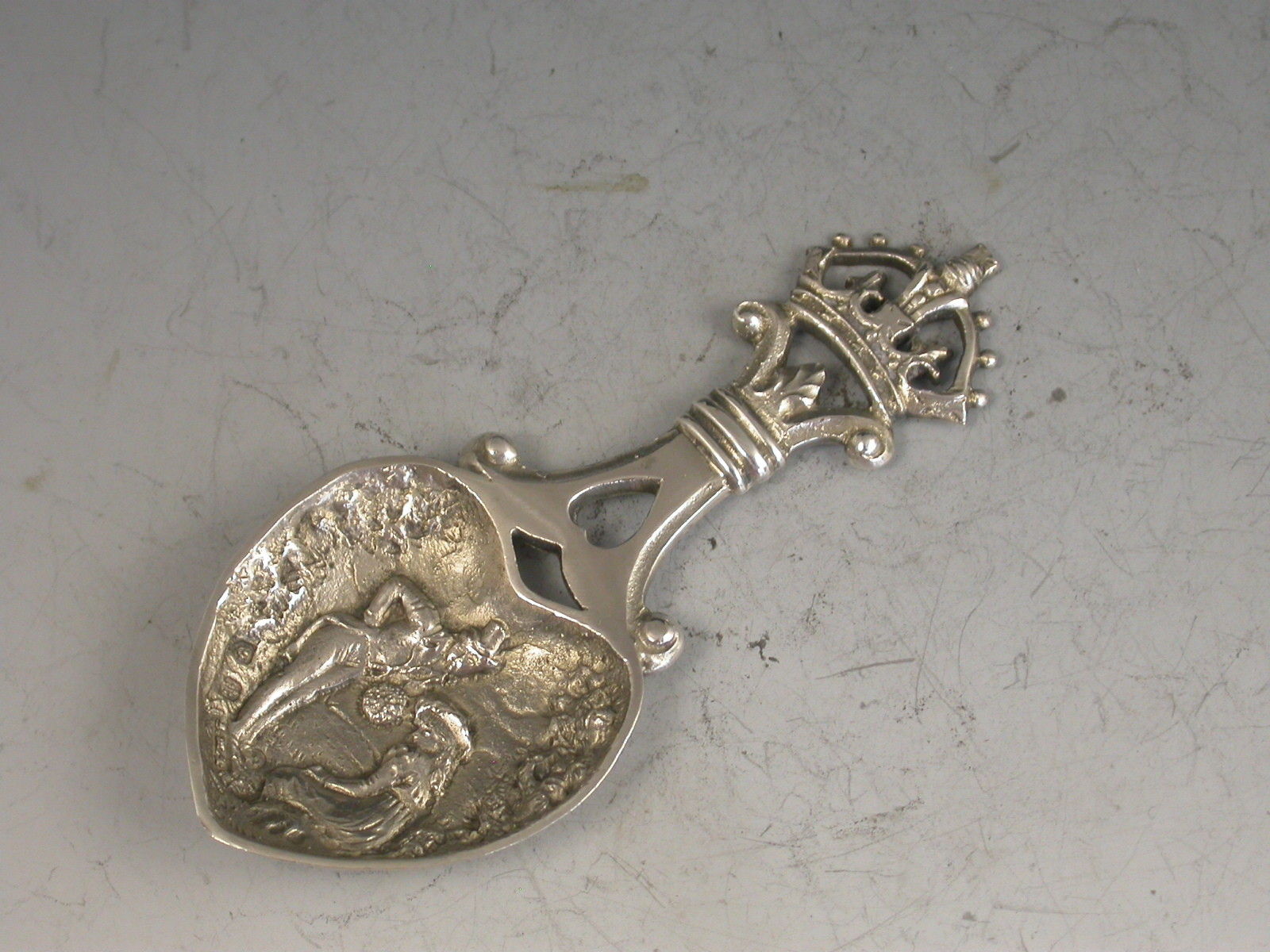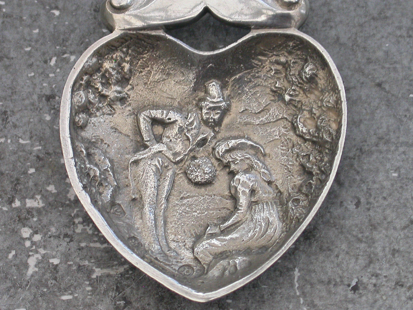 An unusual cased set of three Victorian Scottish silver Caddy Spoons, two by John Maitland Talbot of Edinburgh 1896 with die-stamped heart shaped bowls depicting a gentleman offering a lady a bouquet of flowers and with pierced handles with crown finials, the third unmarked spoon with a similar handle and a bowl formed from a William III 1696 Crown.