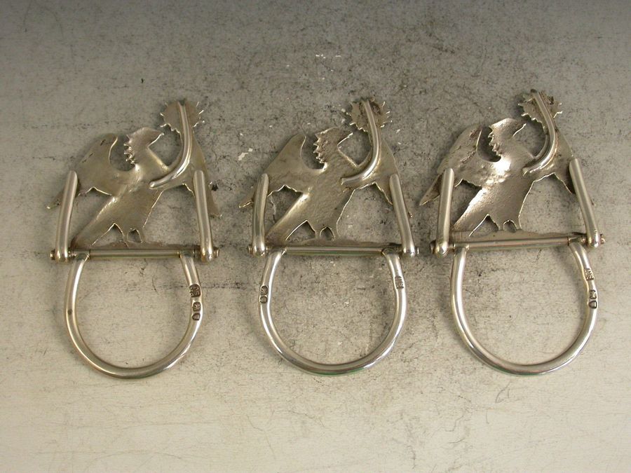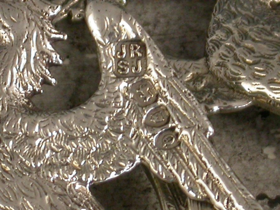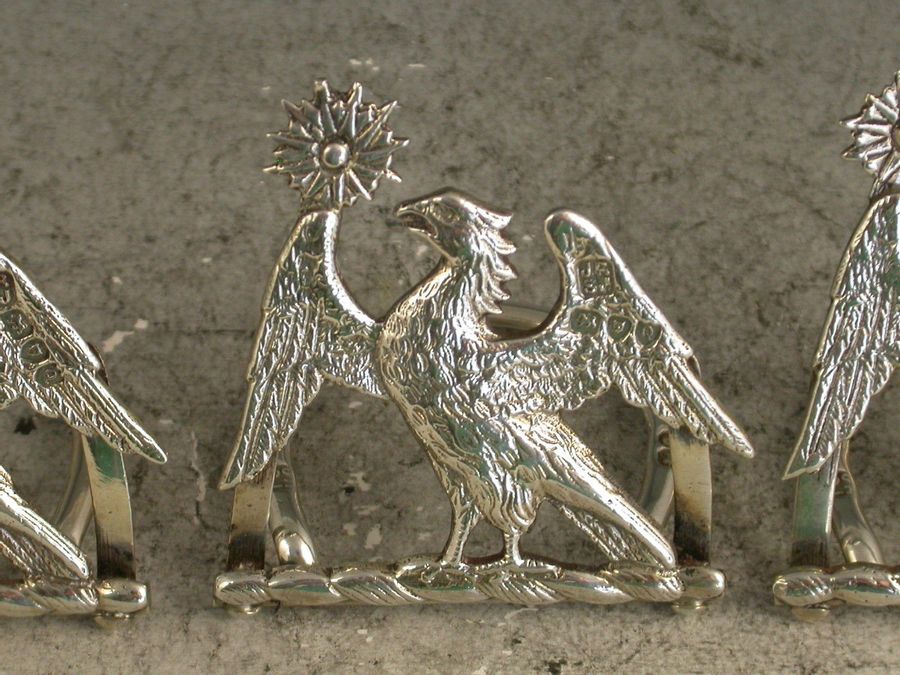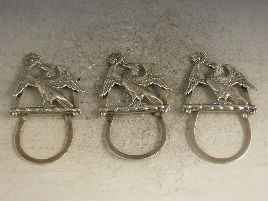 A set of three Victorian cast silver Menu Holders depicting Armorial Crests of eagles rising looking at the sun ppr, possibly for Stevens of Edinburgh.