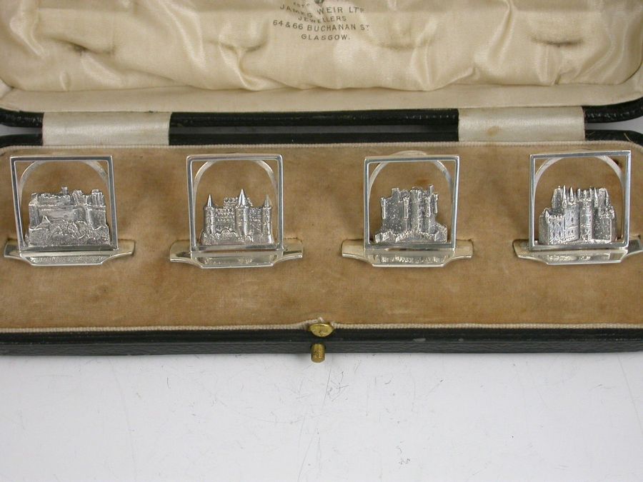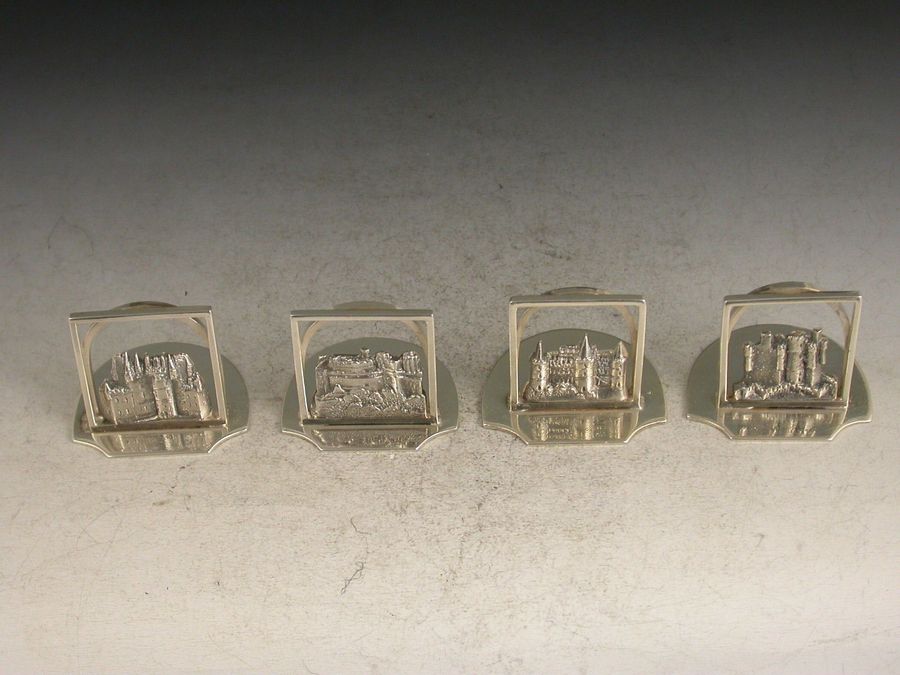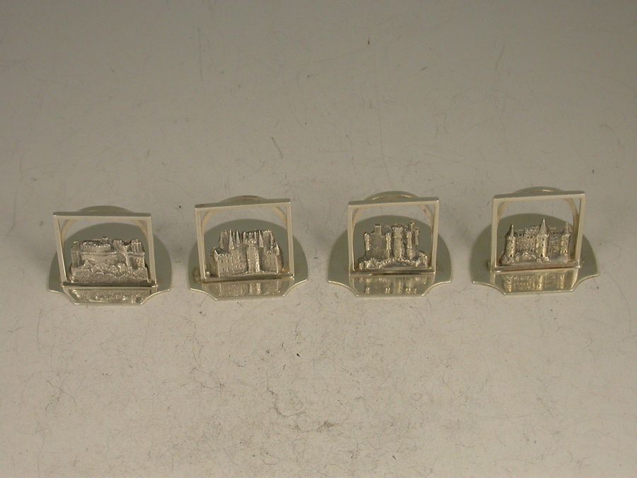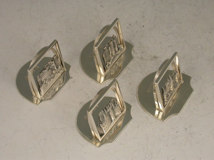 A rare cased set of four George VI Scottish silver Menu Holders, each depicting a different Scottish Castle in high relief within a square picture frame border, on flat semi circular bases. Engraved: Braemar, Edinburgh, Glamis and Inveraray to the reverse.