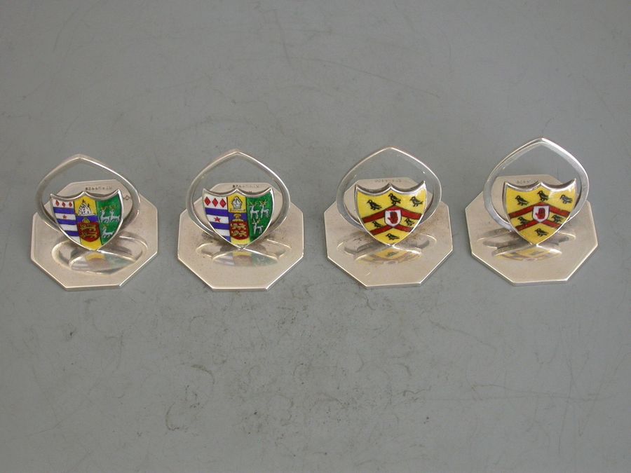 A fine set of four Edwardian cased silver and enamel Menu Holders, the shield shaped stands on octagonal bases, enamelled with the Coats of Arms of Worcester and Lincoln Colleges, Oxford University. Complete with original silk and velvet lined leather case.