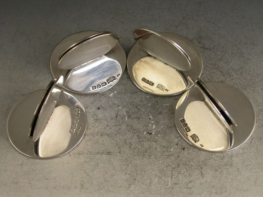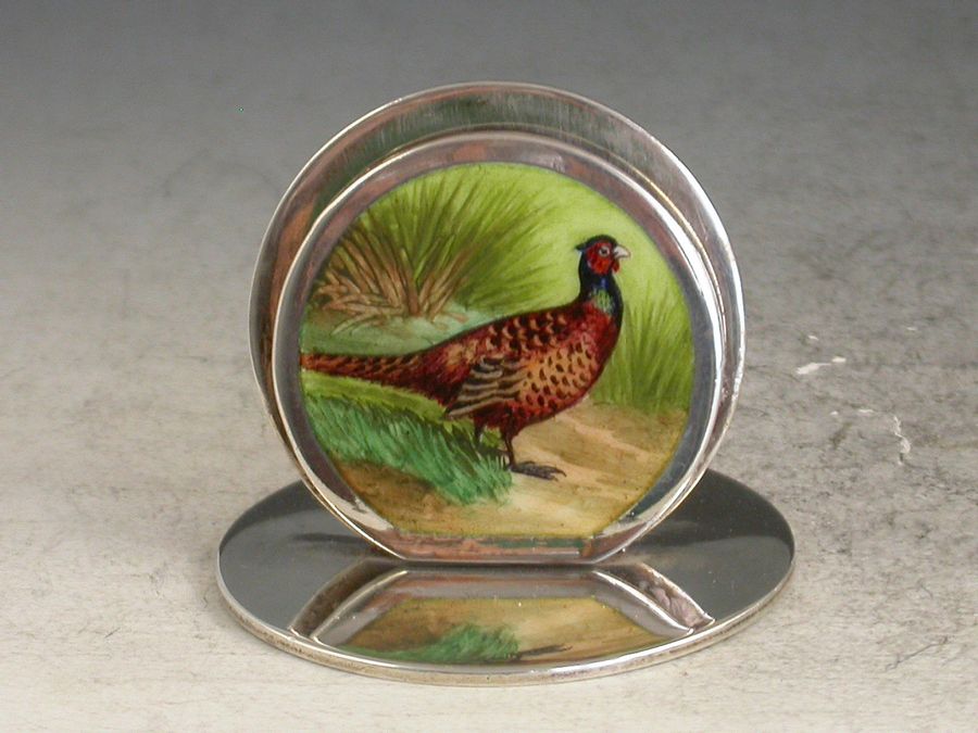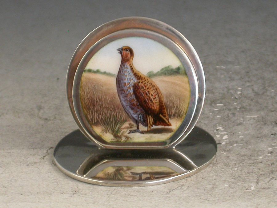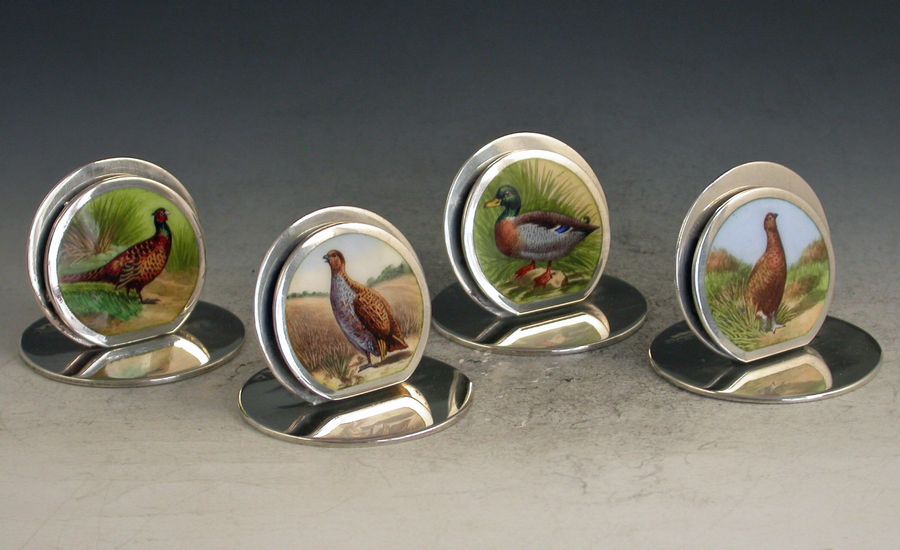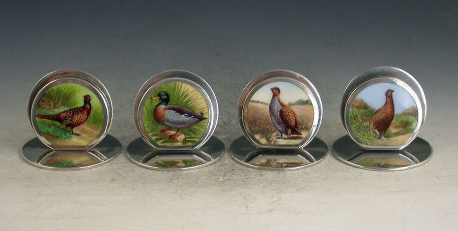 A very fine set of four Edwardian silver and enamel Game Bird Menu Holders of sprung double-disc form on flat circular bases. The faces finely enamelled with portraits of a cock pheasant, a drake mallard, an English partridge and a red grouse, in landscape scenes.