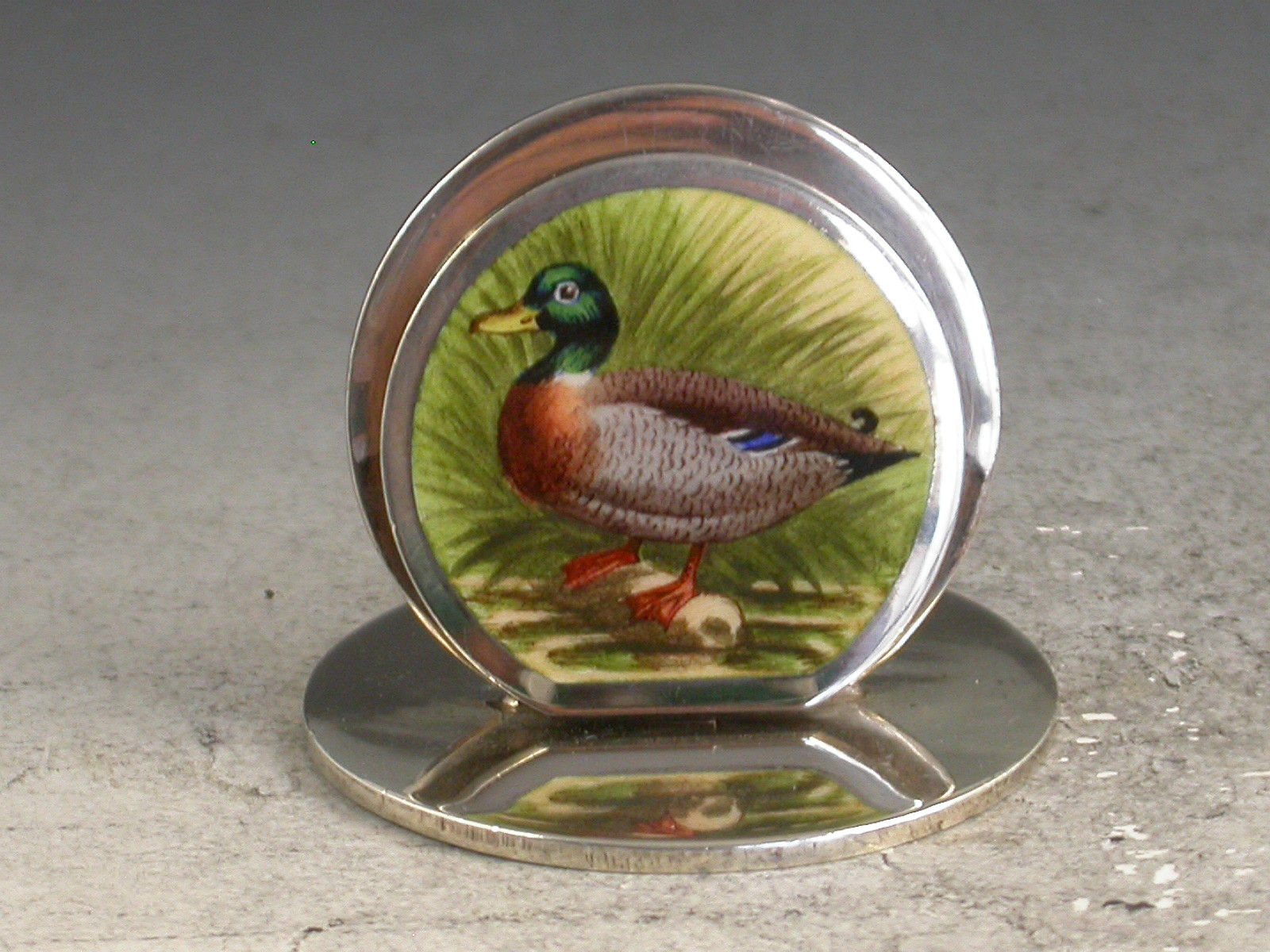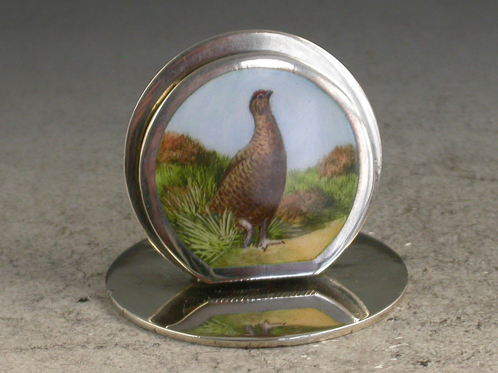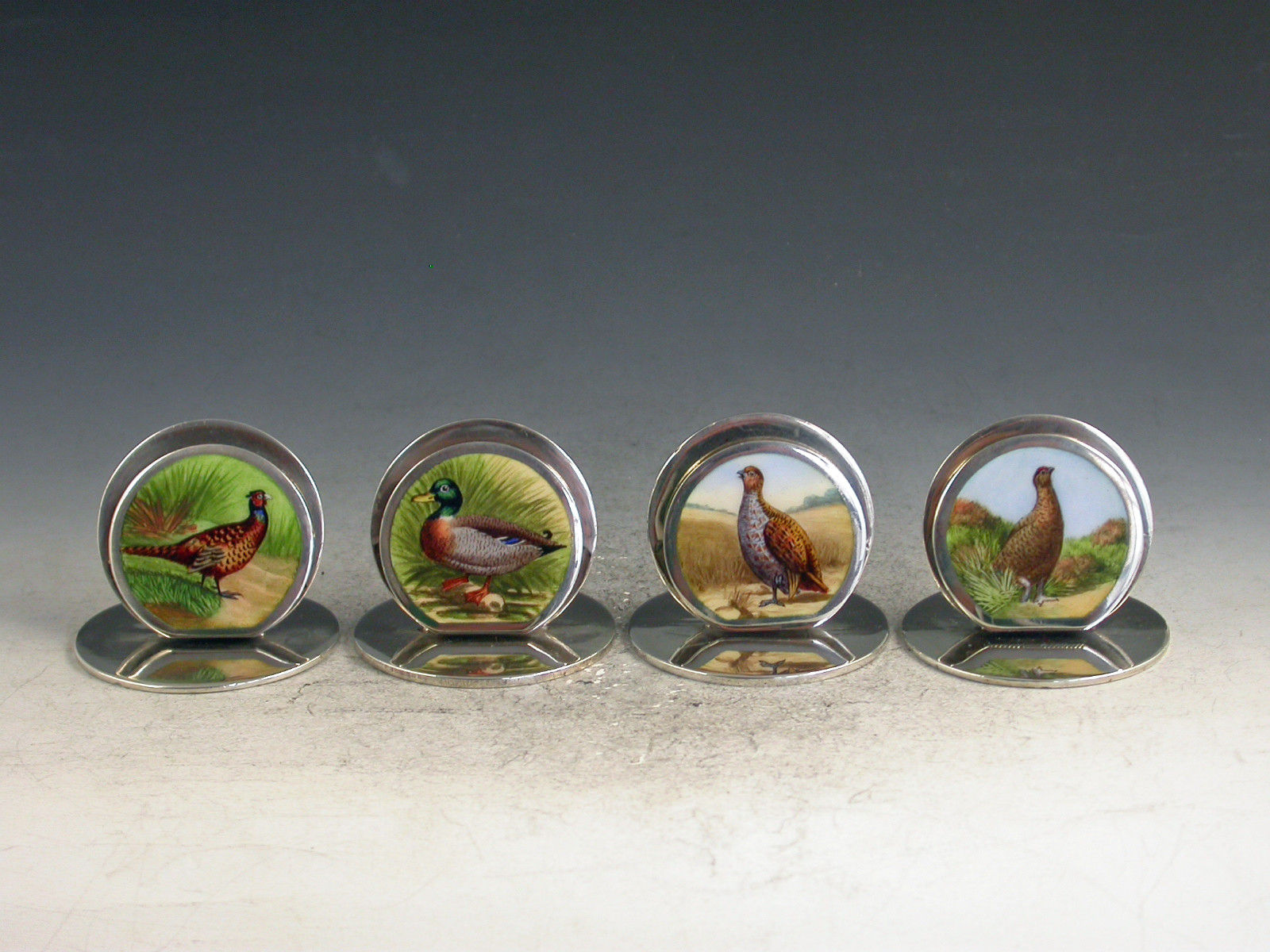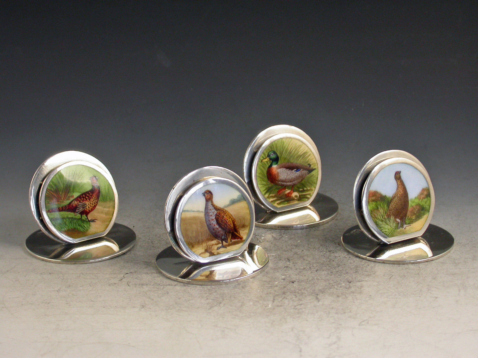 A very fine set of four Edwardian silver and enamel Game Bird Menu Holders of sprung double-disc form on flat circular bases. The faces finely enamelled with portraits of a cock pheasant, a drake mallard, an English partridge and a red grouse in landscape scenes.