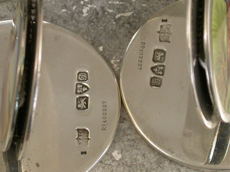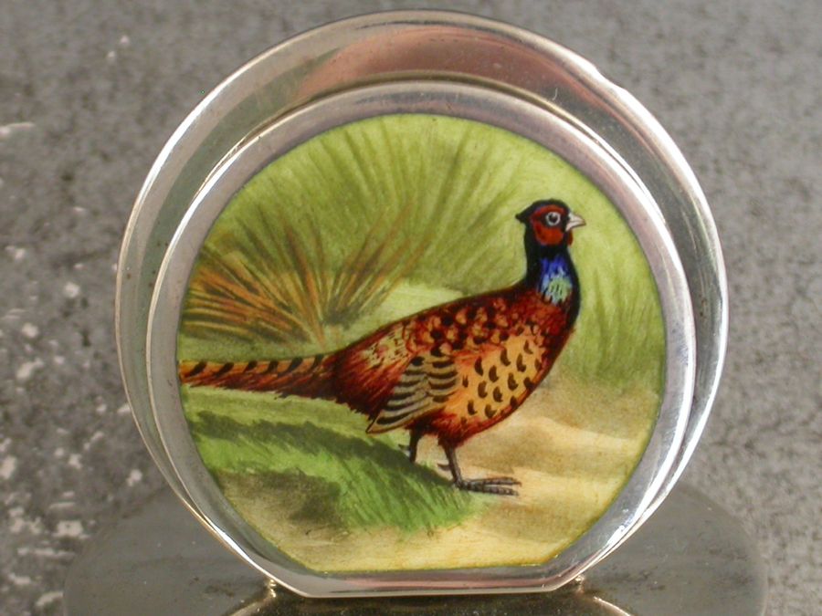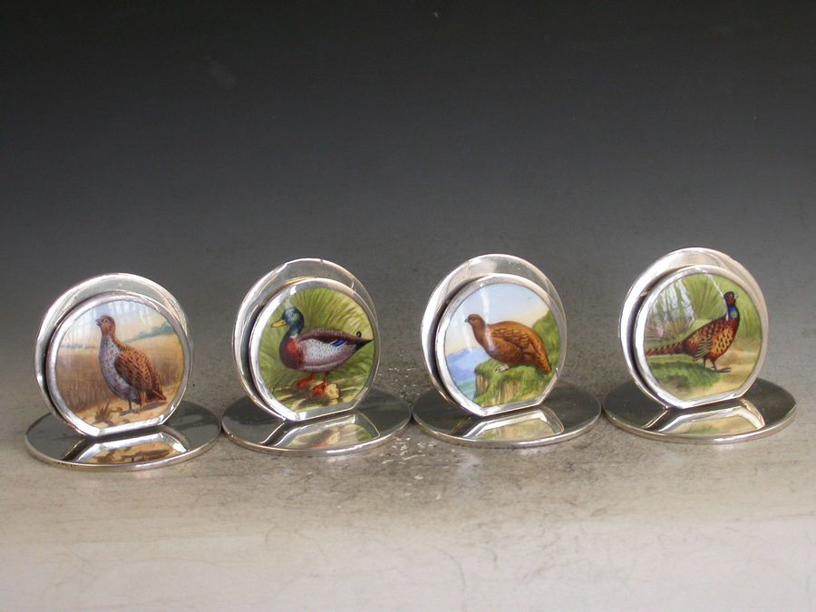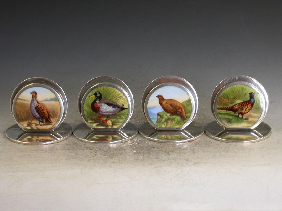 A very fine and rare set of four Edwardian silver and enamel Game Bird Menu holders of sprung double-disc form on flat circular bases. The faces finely enamelled with portraits of a cock Pheasant, a drake Mallard, an English Partridge and a Red Grouse. All in landscape scenes.