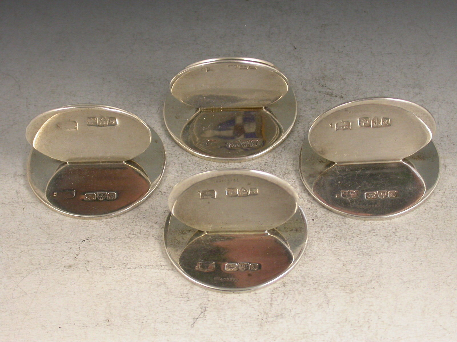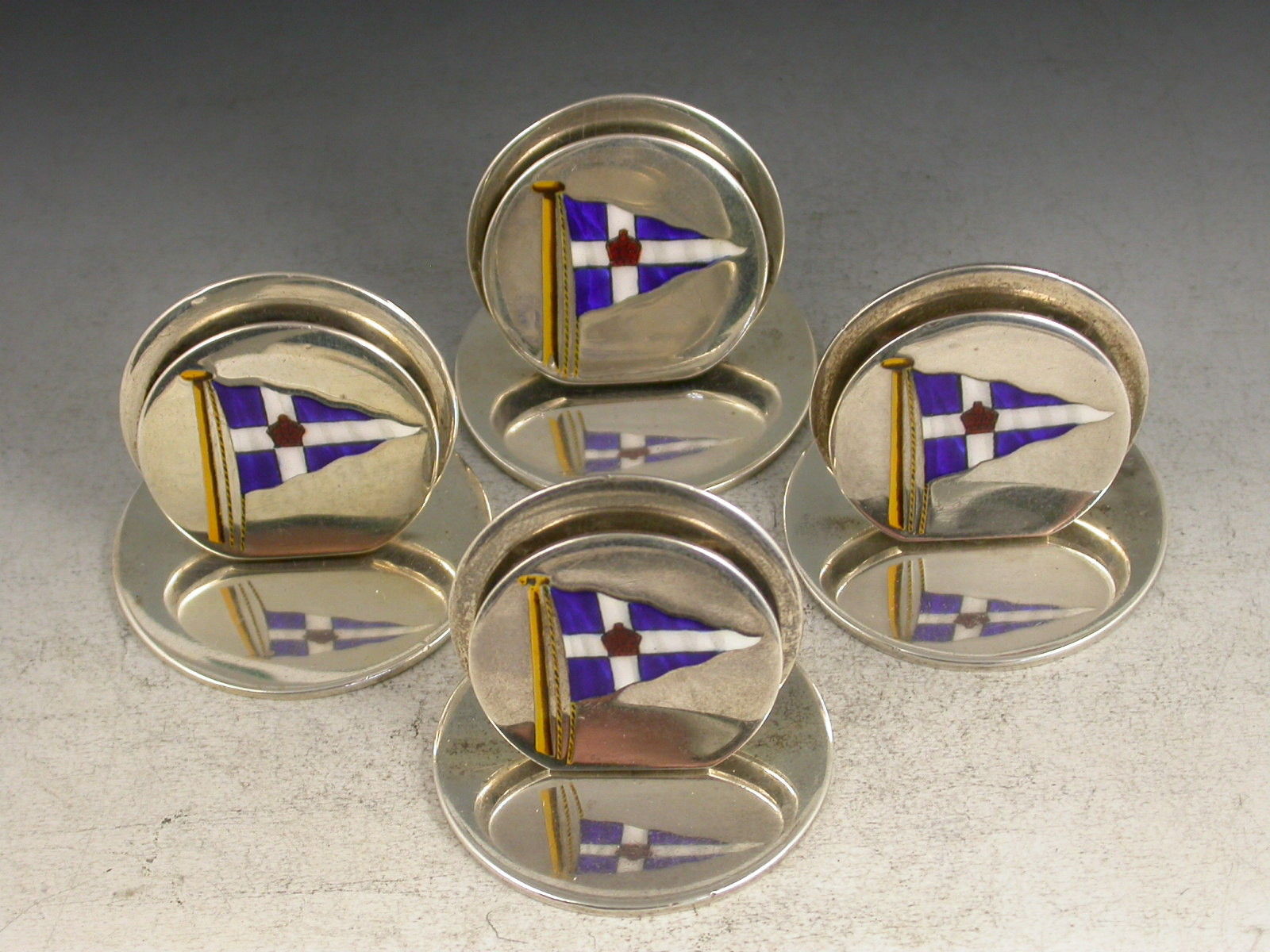 A fine qulaity set of four Edwardian silver and enamel Menu holders of sprung double disc form on flat circular bases, the faces enamelled with the Burgee Yacht Club.