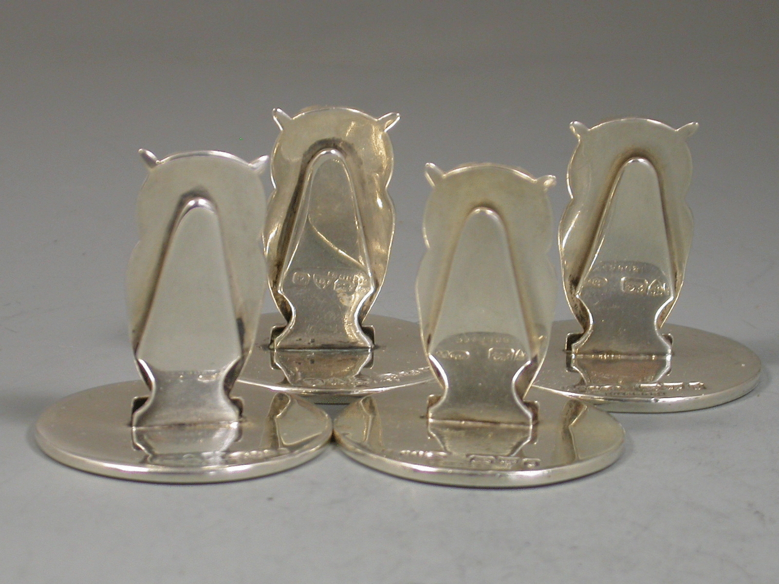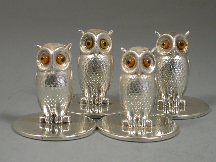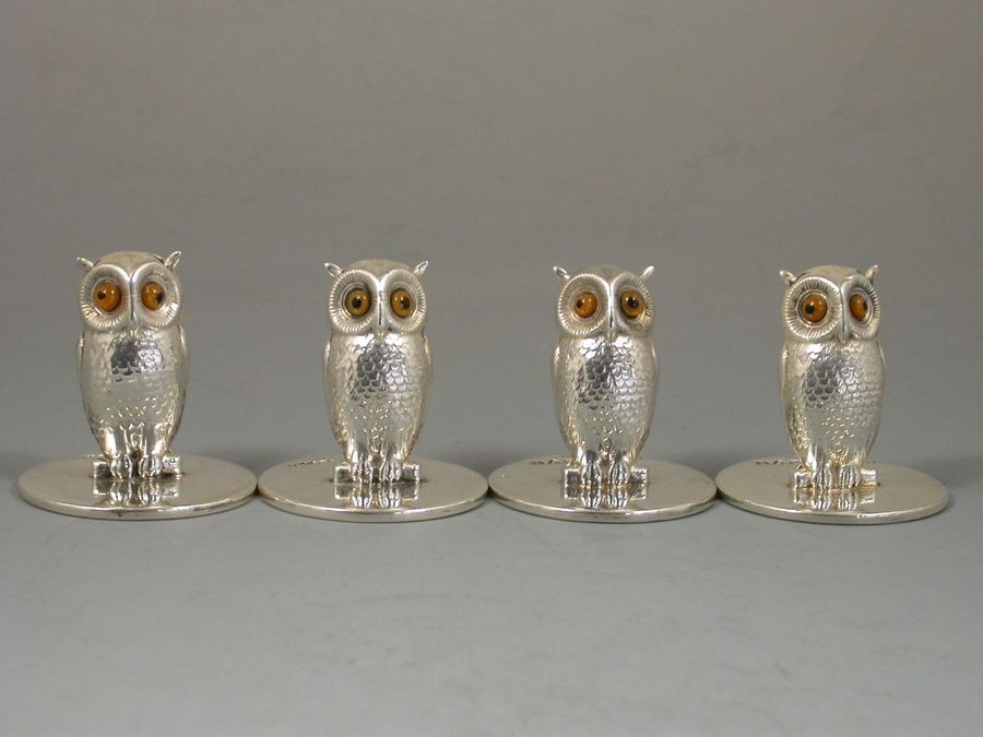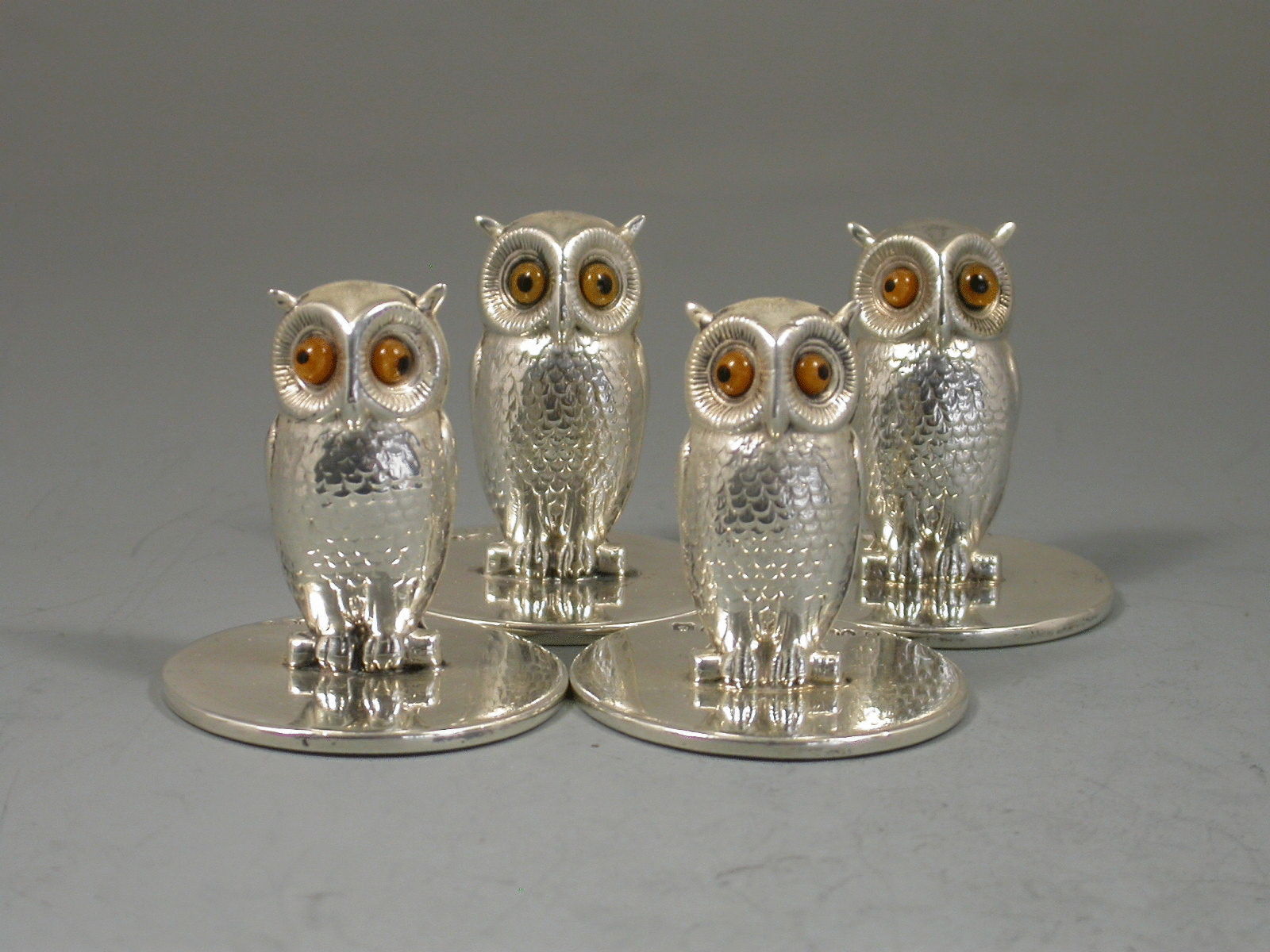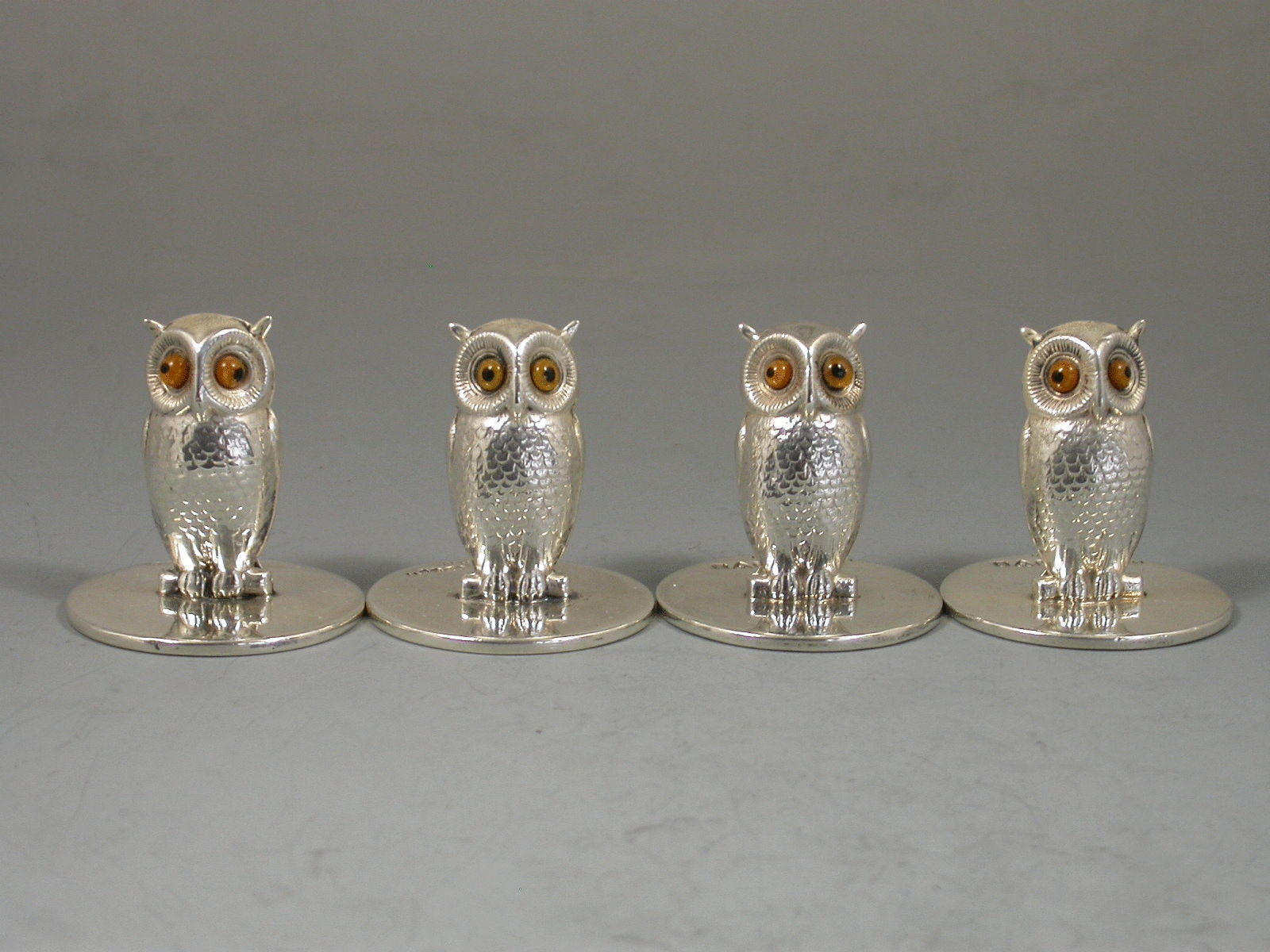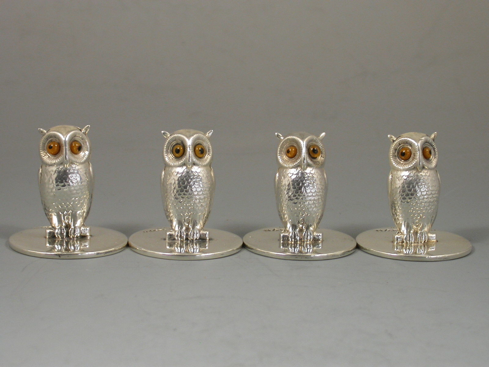 A set of four early 20th century Edwardian silver Menu Holders formed as Owls standing on perches with amber glass eyes, circular bases.