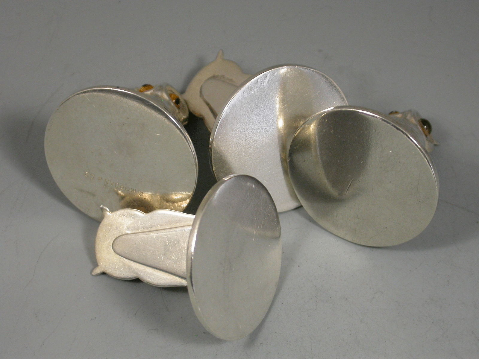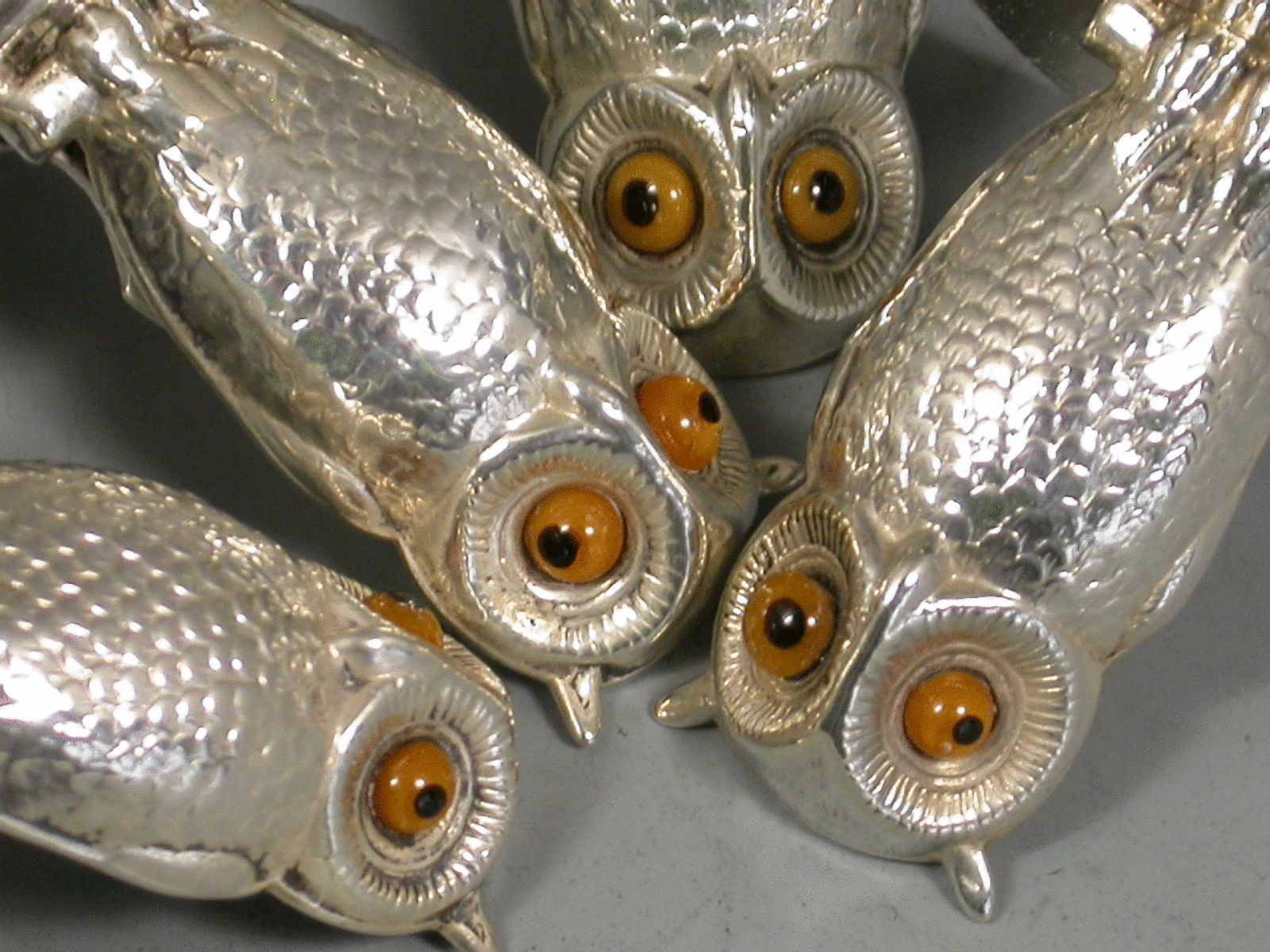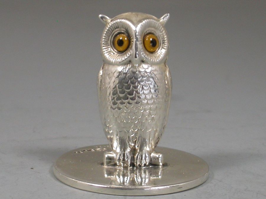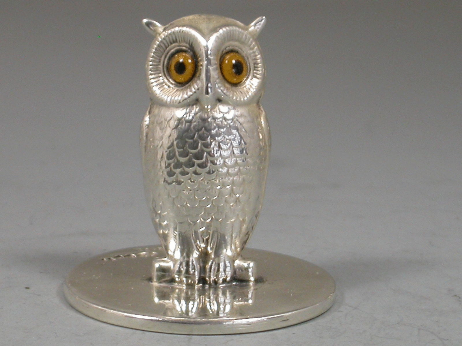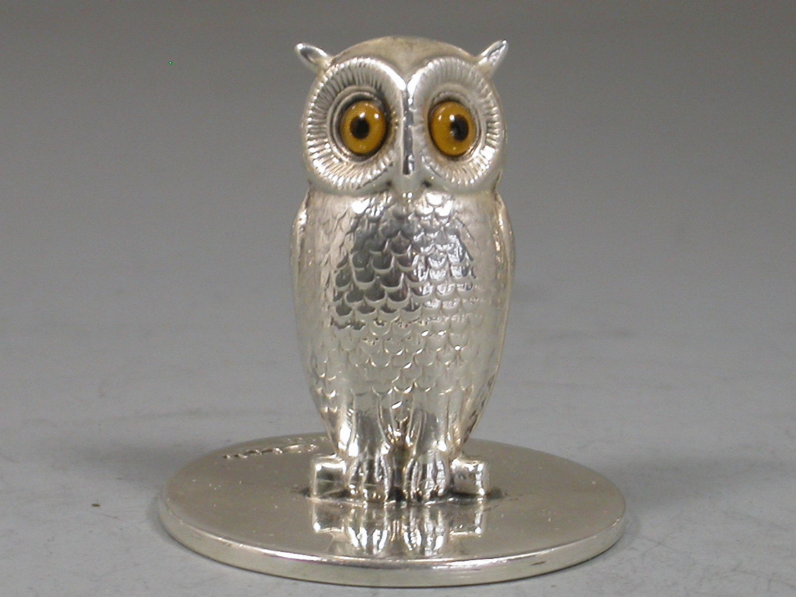 A set of four early 20th century Edwardian silver Menu Holders formed as Owls standing on perches with amber glass eyes, circular bases.