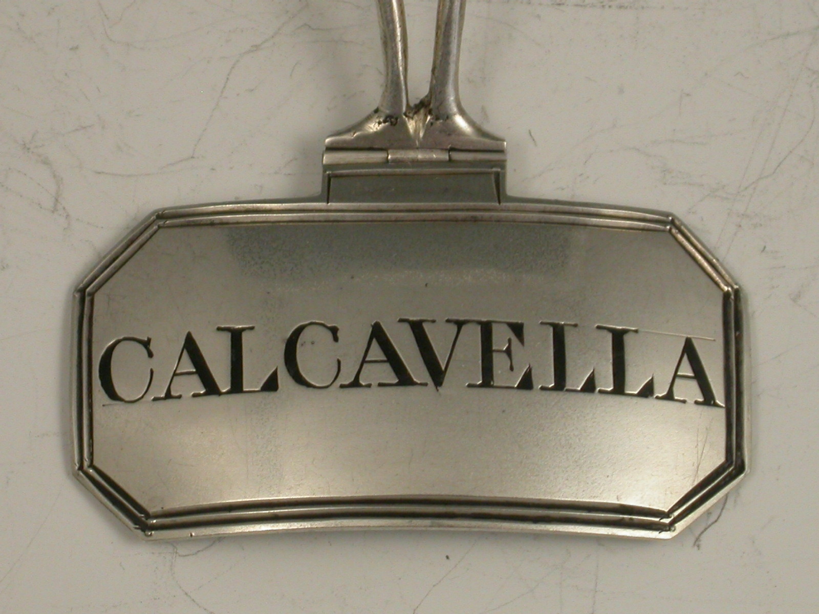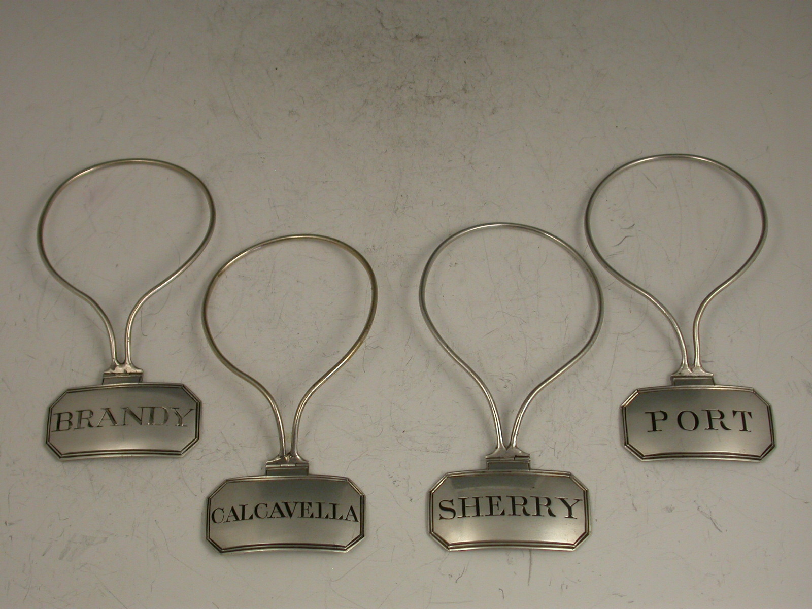 A good set of four George III silver Wine Labels of cut-cornered rectangular form with hinged neck-ring wire supports, engraved and niello filled for Brandy, Port, Calcavella and Sherry.
