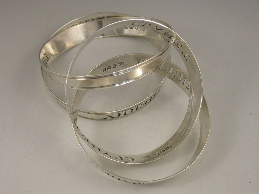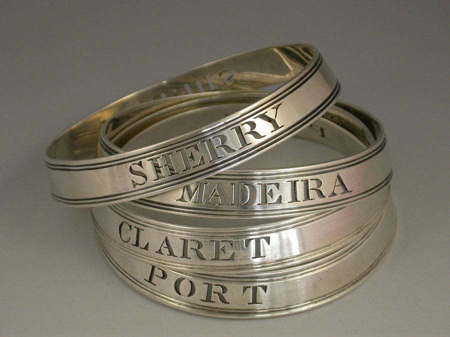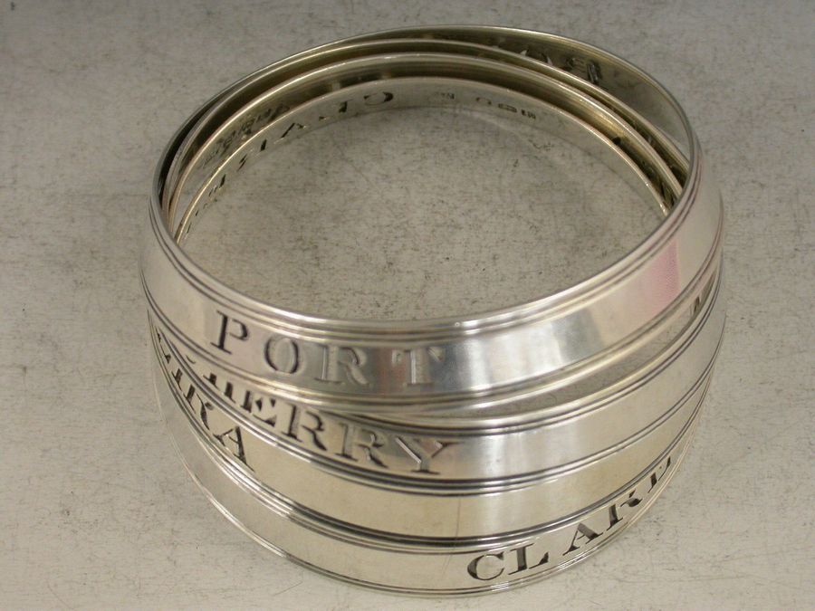 A fine set of four George III silver Wine Labels of plain flared collar form with reeded border, each pierced twice for Port, Claret, Madeira and Sherry.