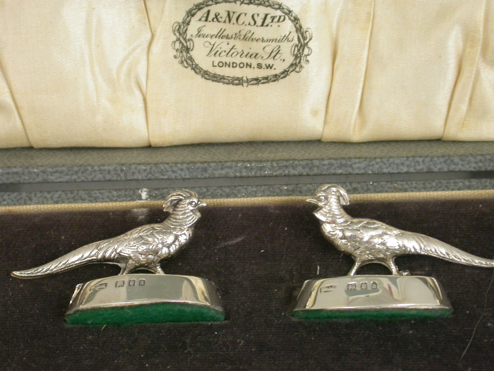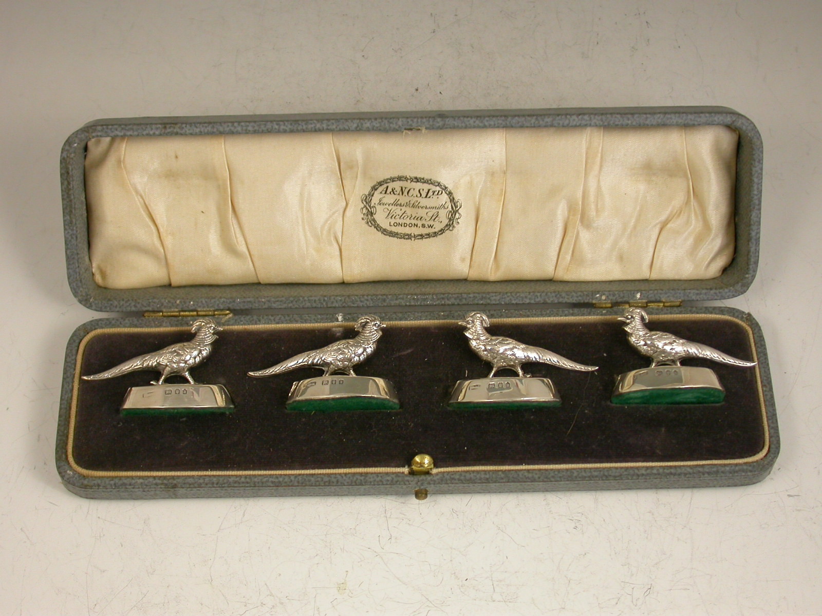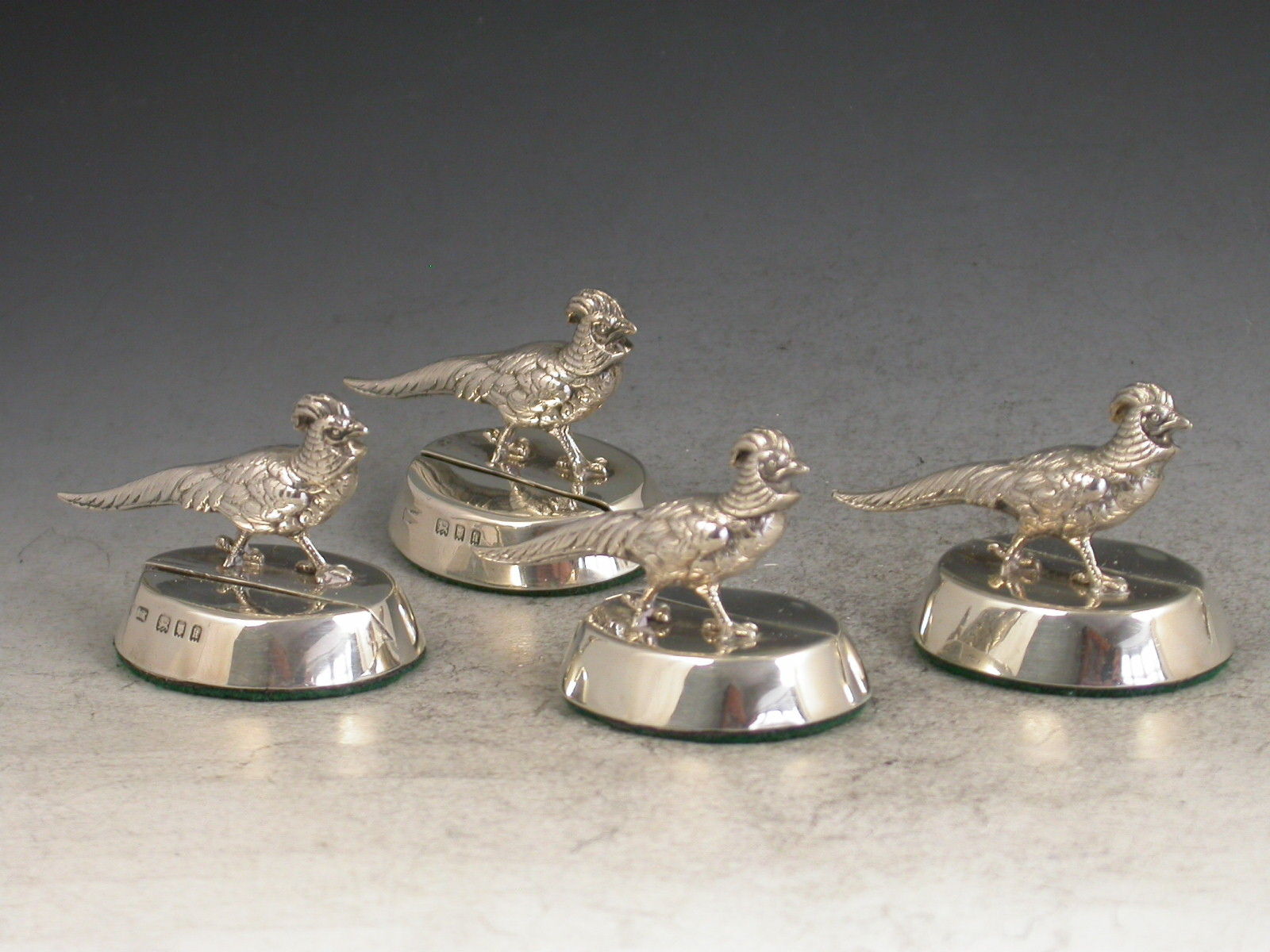 A set of four early 20th century cased silver Menu Holders depicting golden pheasants on filled oval bases, two facing in one direction and two the other. Complete with original silk and velvet lined leather case.