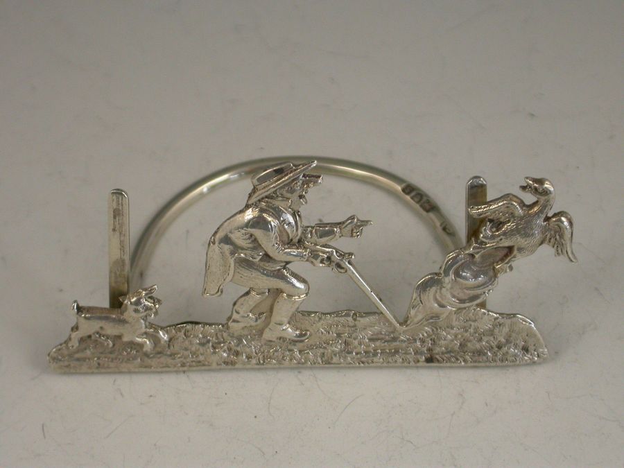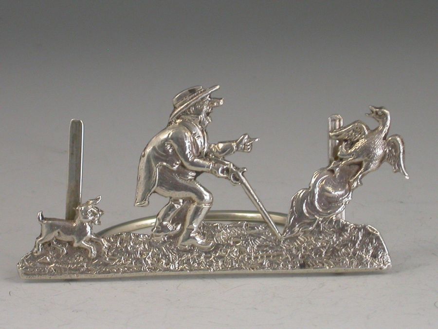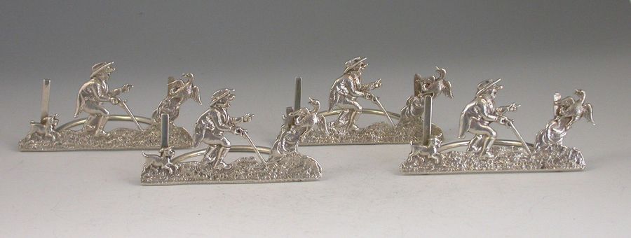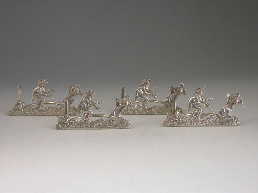 A rare set of four George V silver Menu Holders depicting a comical Game Keeper and his dog flushing a pheasant or a duck from cover.