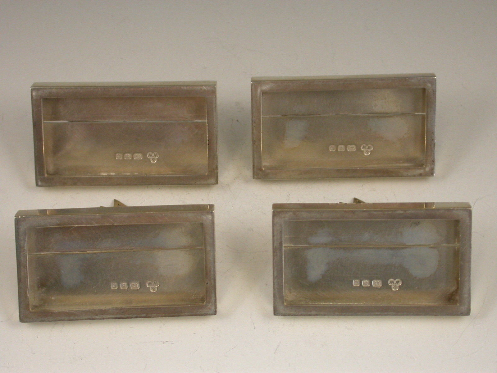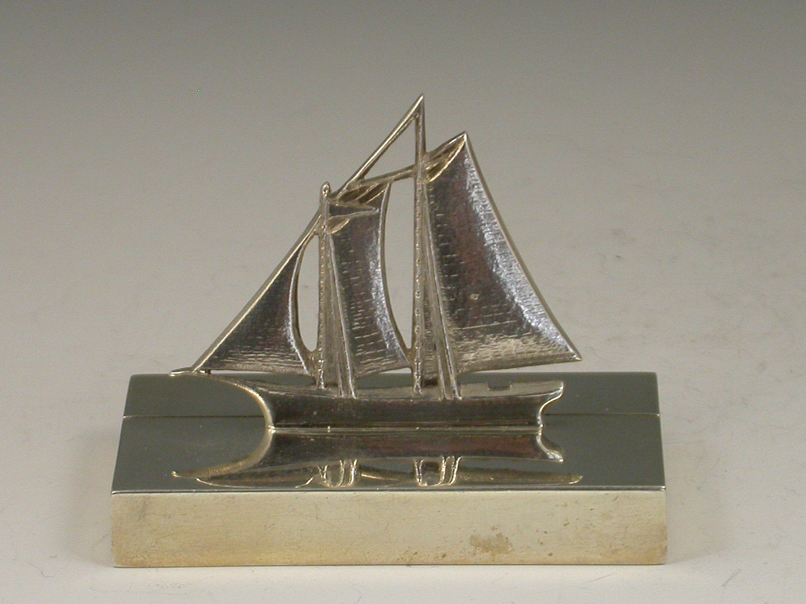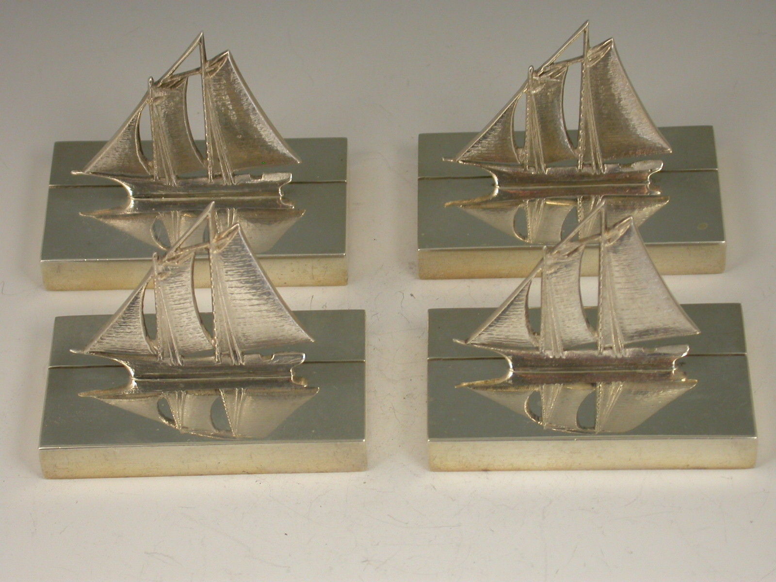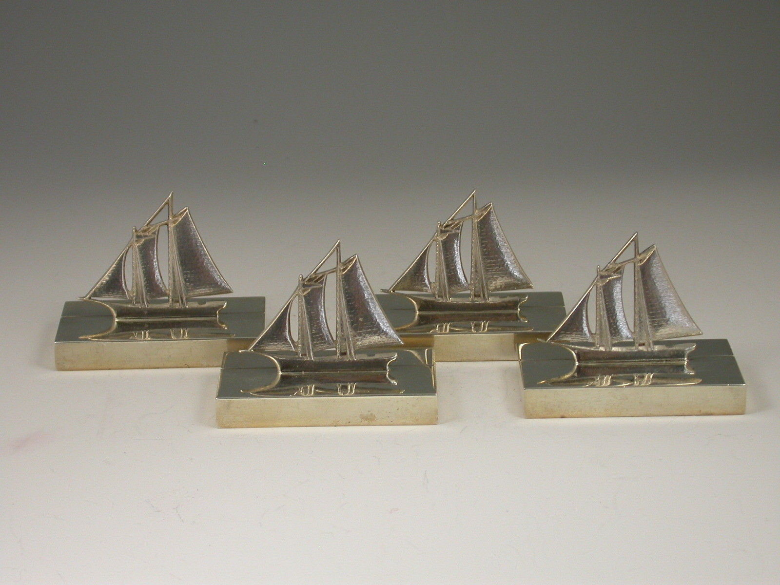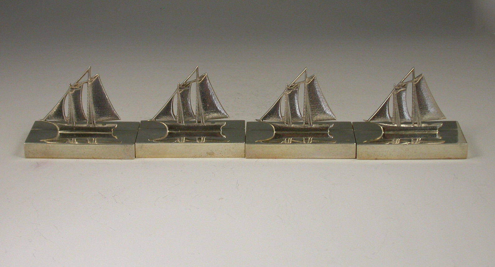 A rare set of early 20th century silver Menu Holders modelled as Sailing Boats, on plain rectangular bases.