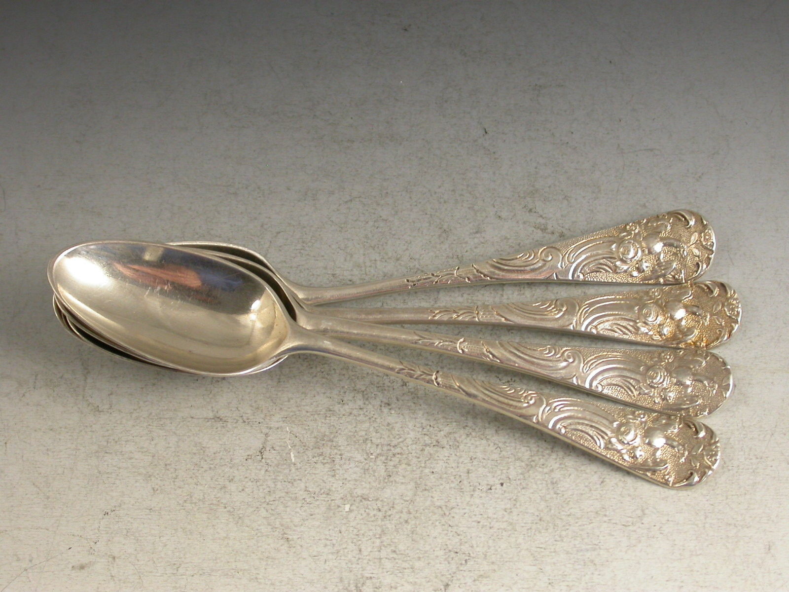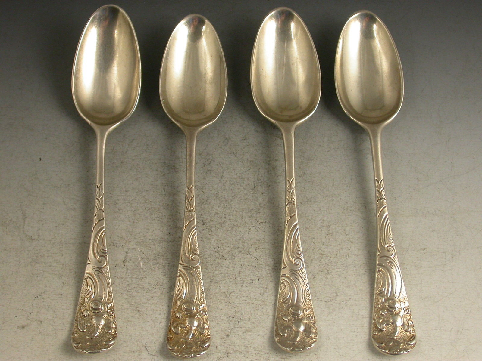 A very fine set of four mid 18th century Hanoverian pattern ""Picture-Back"" Teaspoons with conforming picture-fronts, the backs of the bowls with chased scenes depicting a hen and chicks in a farmyard setting, the fronts with rococo scroll decoration and an eagle displayed holding a rose in its beak.