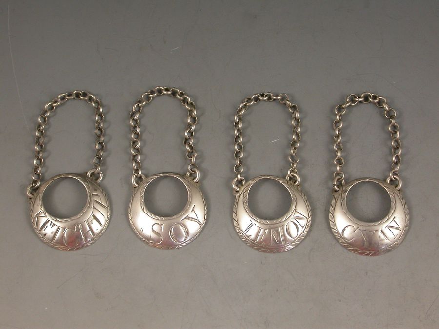Set 4 Mid 18th Century Silver Sauce Labels Soy - Ketchup - Lemon - Cyan