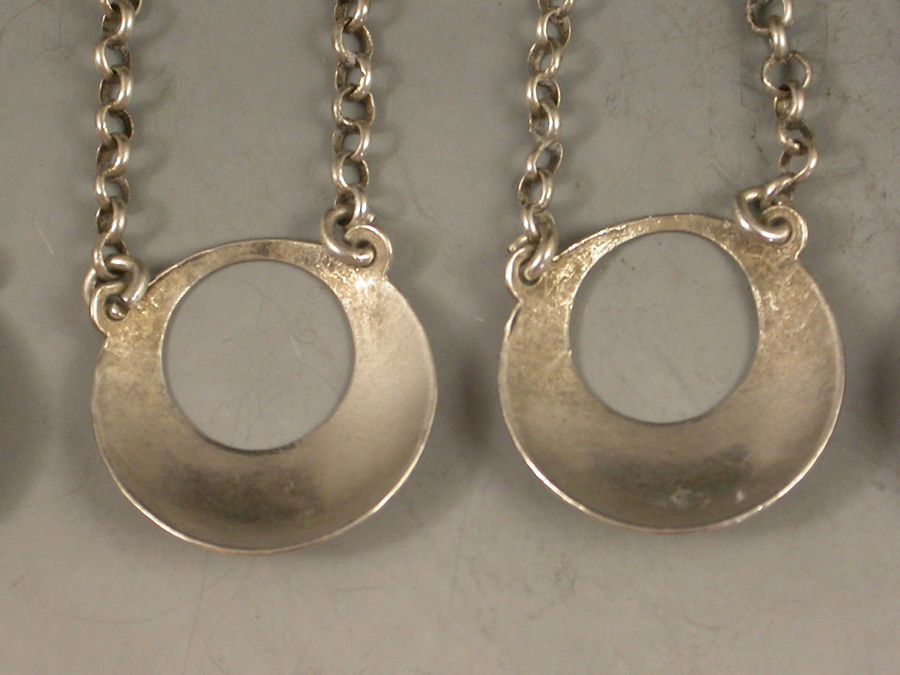 A rare set of four early George III silver Sauce Labels of enclosed crescent form with raised eyelets and feather edge borders.