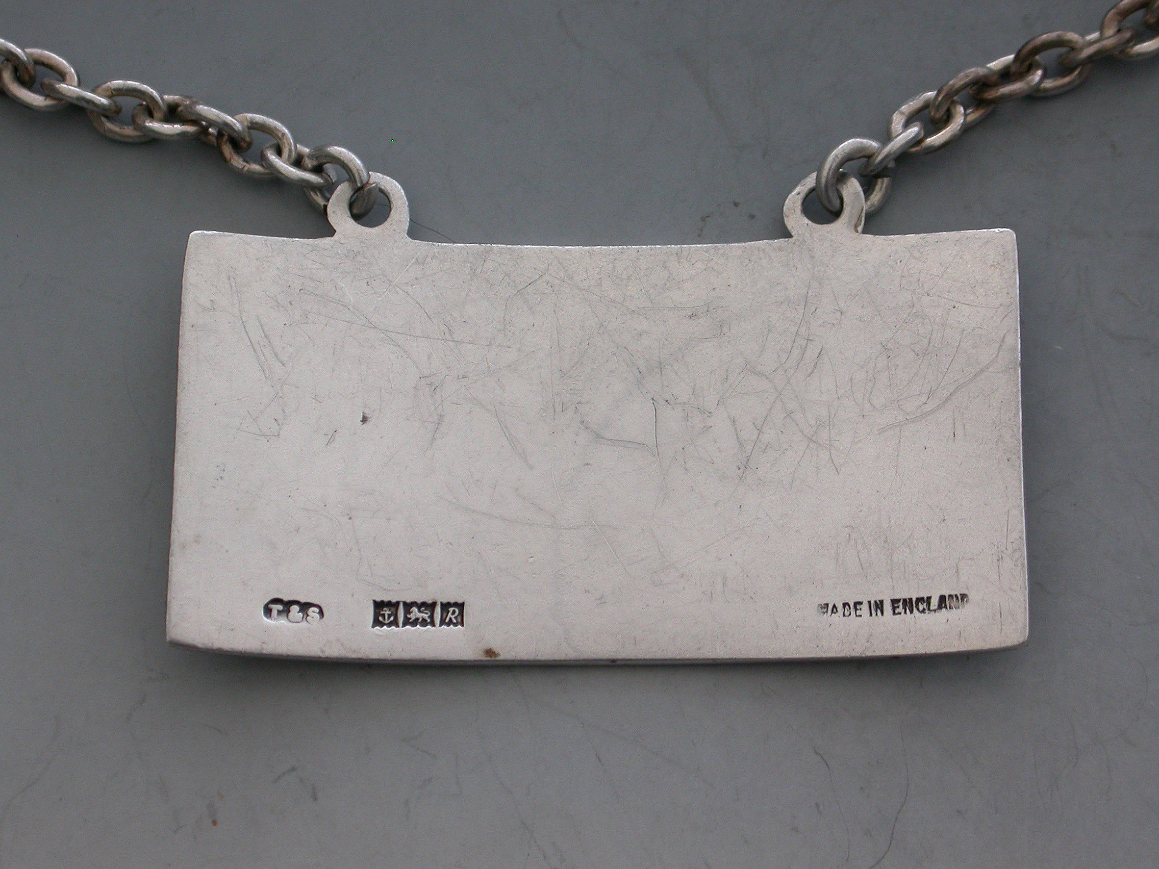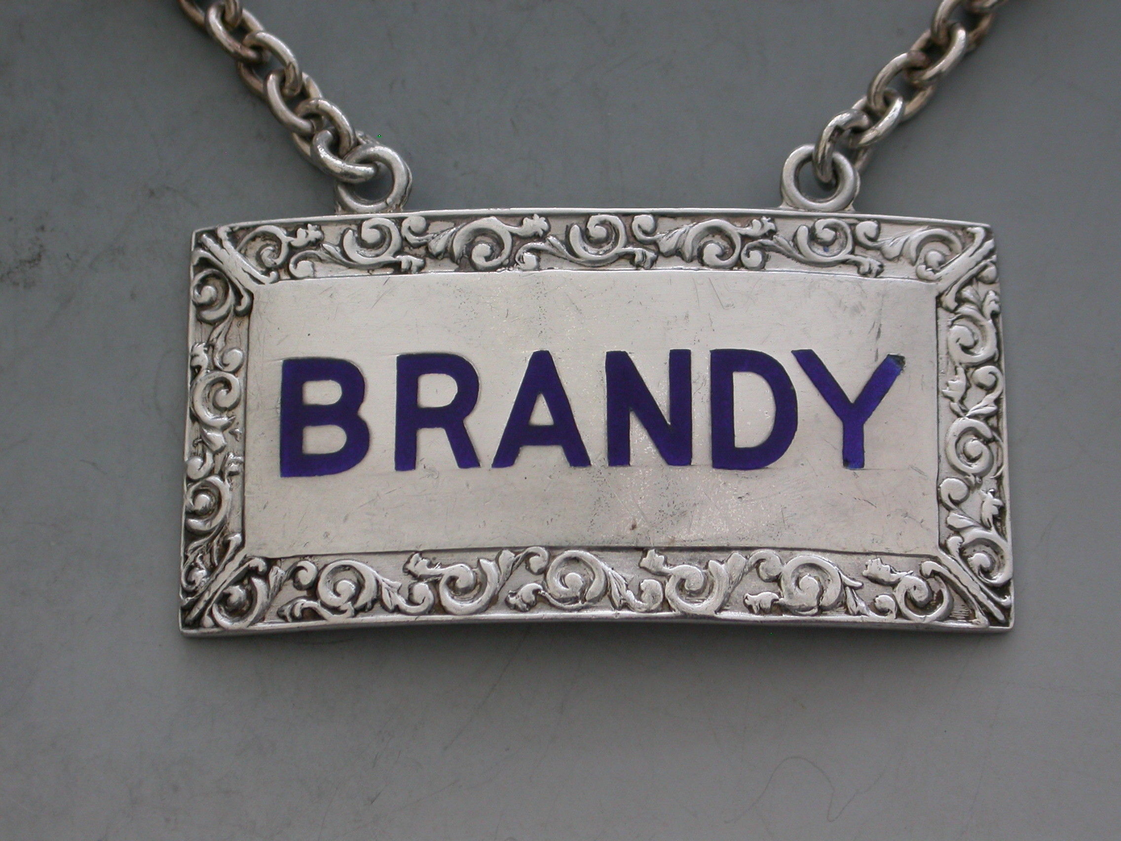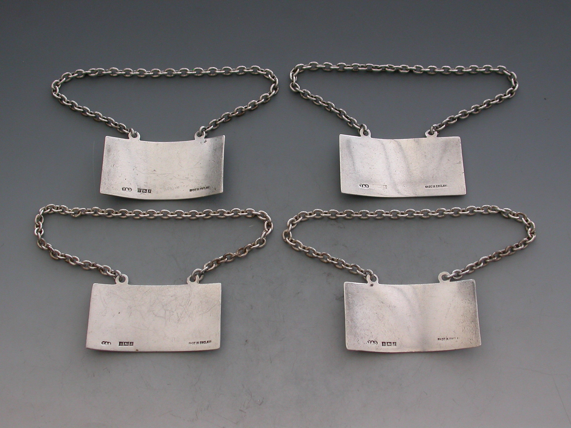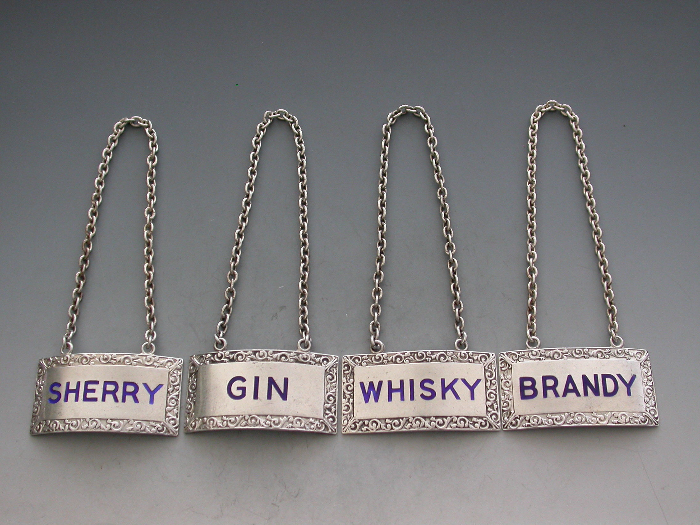 Set 4 Mid 20th Century Cast Silver & Enamel Wine Labels 'Gin, Brandy, Sherry & Whisky'