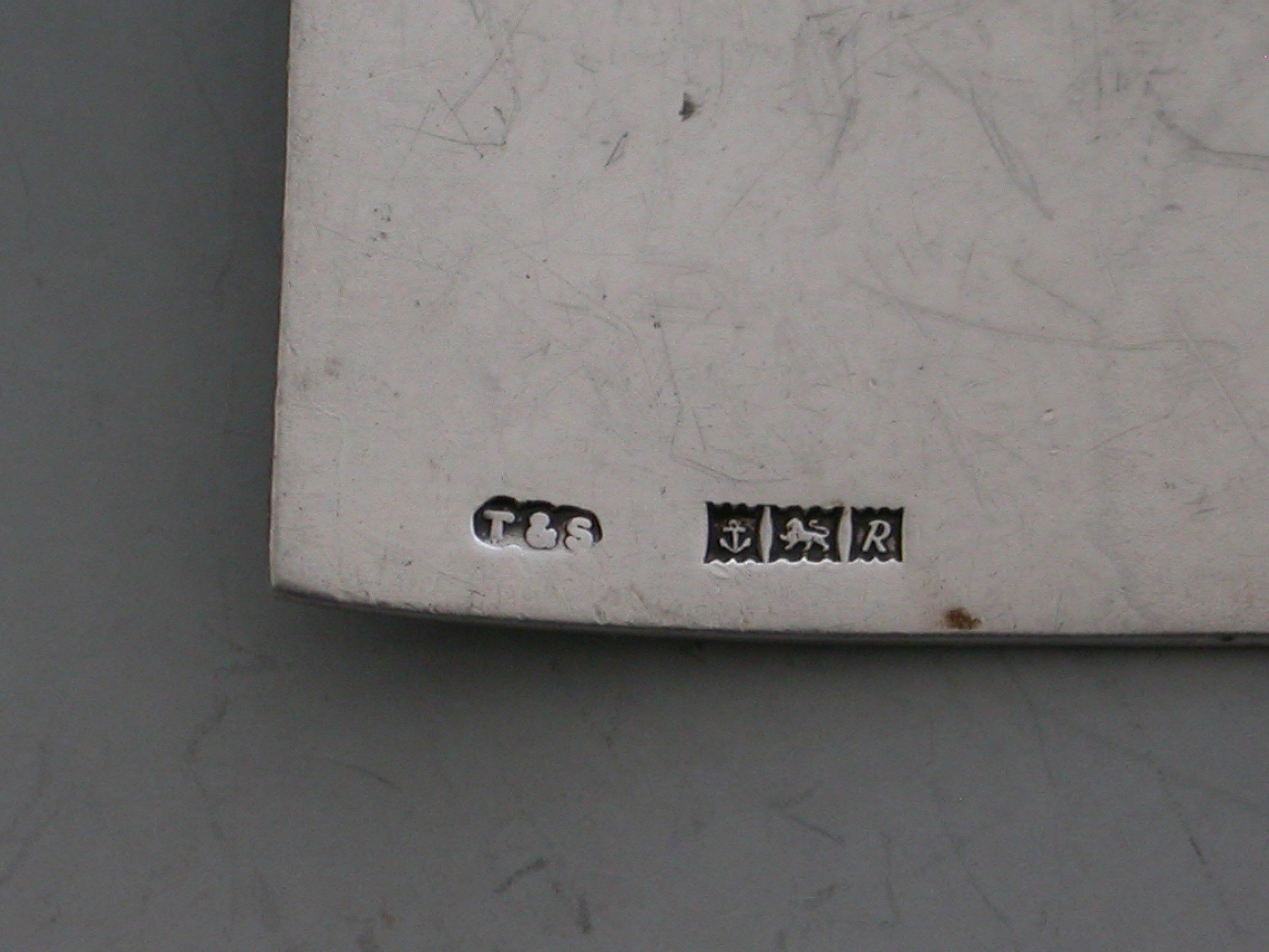 A good quality set of four mid 20th century heavy cast silver and enamel Wine Labels of rectangular form, the borders deeply chased with a scrolled design, royal blue enamel titles for Gin, Whisky, Sherry and Brandy.