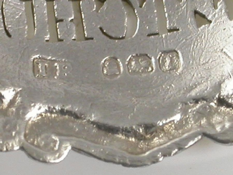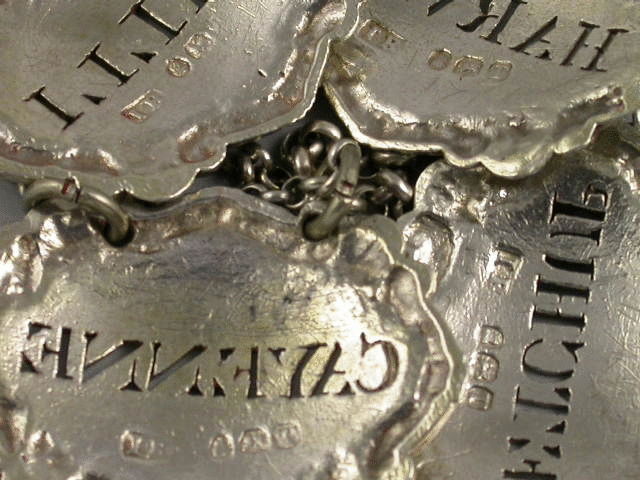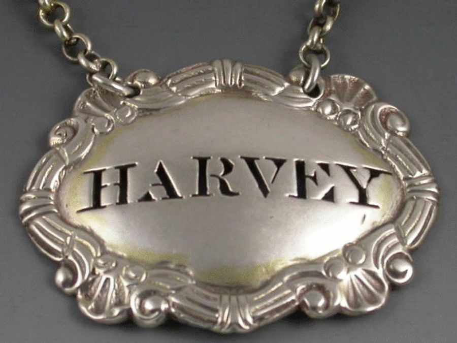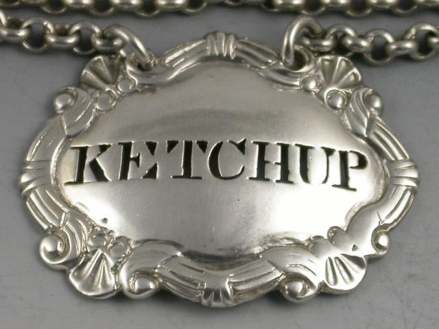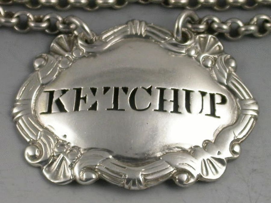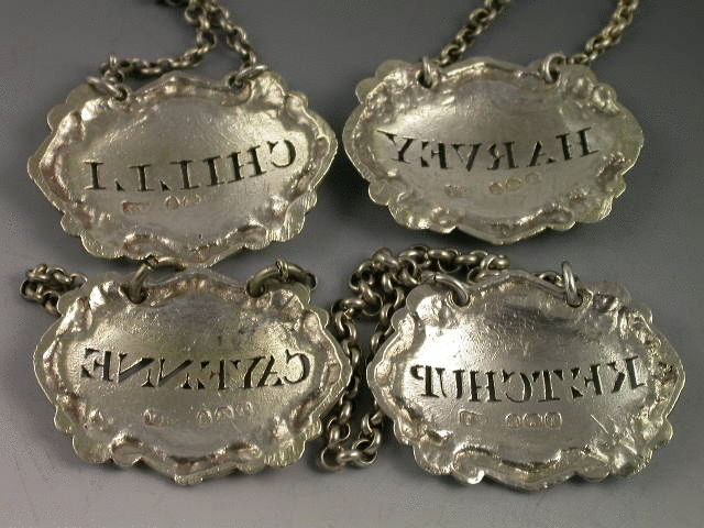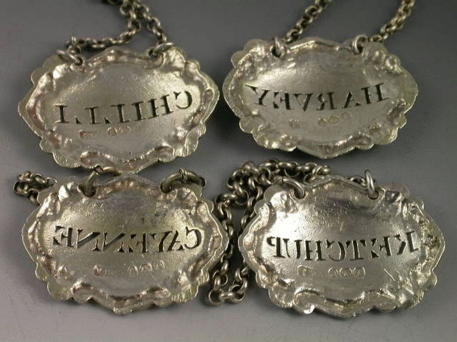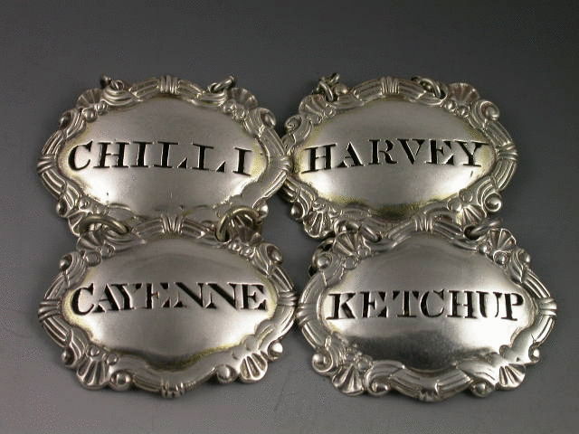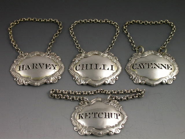 A good set of 4 George III silver Sauce Labels of shaped oval form with raised ‘reed and tie’, shell and scroll borders, pierced for HARVEY, CHILLI, CAYENNE and KETCHUP. Originally gilded, with just traces remaining.