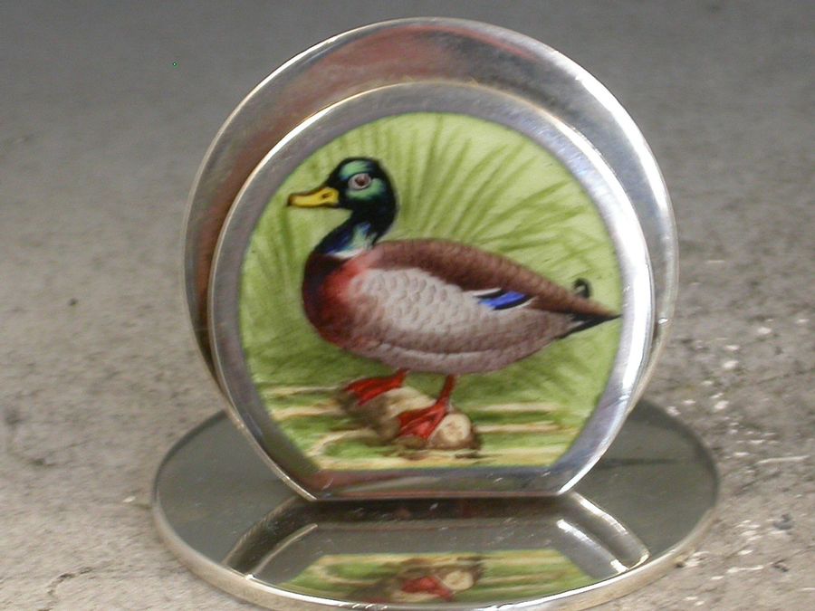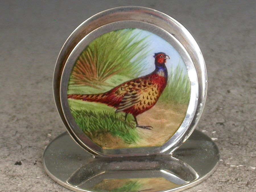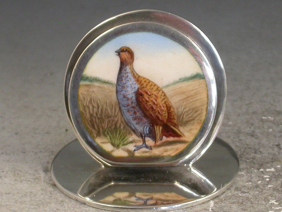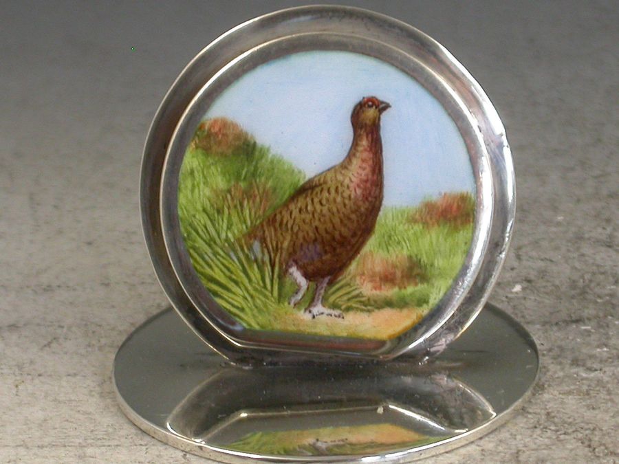 A very fine set of four Edwardian silver and enamel Game Bird Menu Holders of sprung double-disc form on flat circular bases. The faces finely enamelled with portraits of a cock pheasant, a drake mallard, an English partridge and a red grouse, in landscape scenes.
