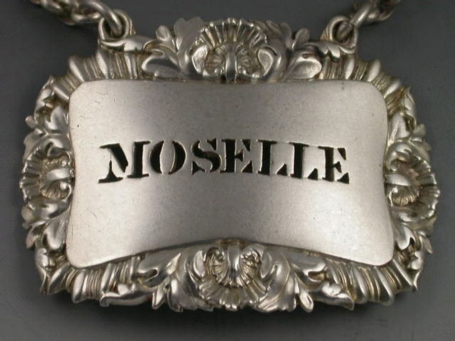 A good quality set of four early Victorian heavy die-stamped or possibly cast, silver Wine Labels, of curved shaped rectangular form with shell, acanthus leaf and gadrooned borders. Pierced for FRONTIGNAC, BUCELLAS, MOSELLE and HOCK. (Note the miss spelling of Frontiniac)
