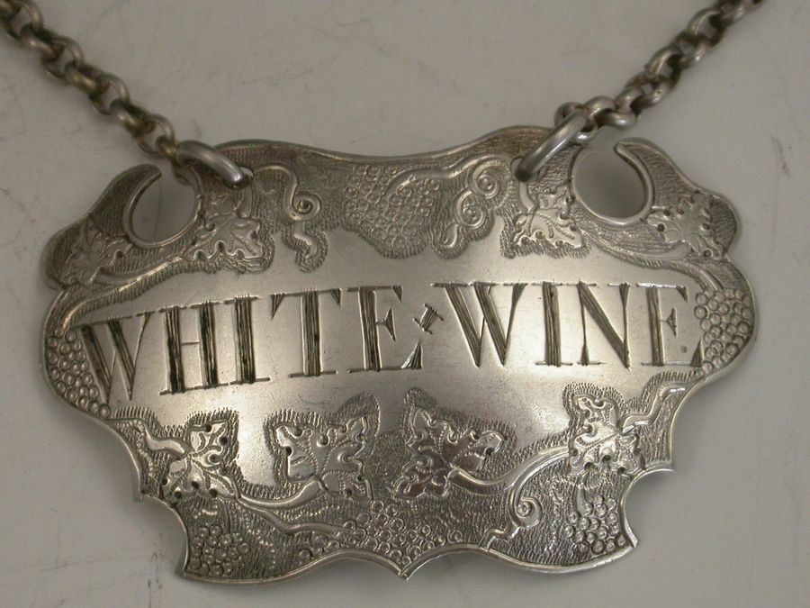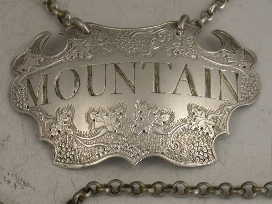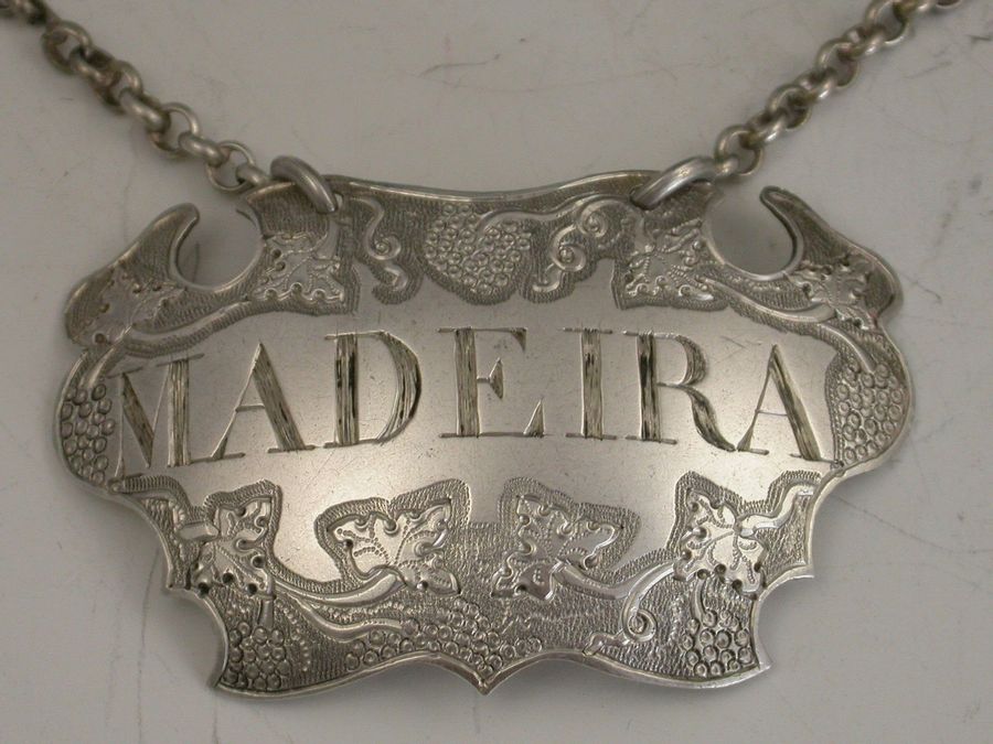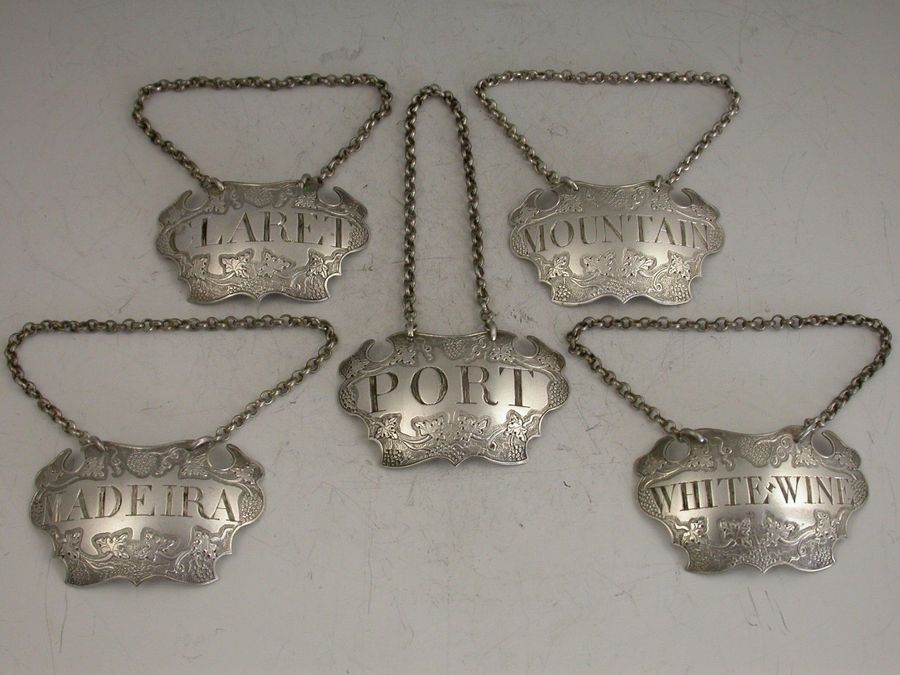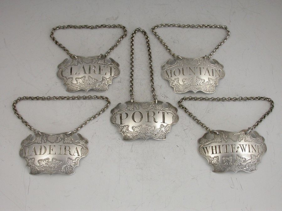 A very fine and rare set of five George II silver Wine Labels of engraved escutcheon form, decorated with vine leaves and grapes on a matt background, incised for Port, Claret, White * Wine, Mountain and Madeira.