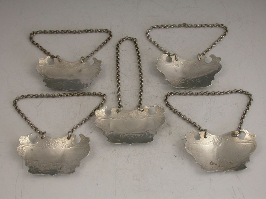 Set 5 George II Antique Silver Escutcheon Wine Labels