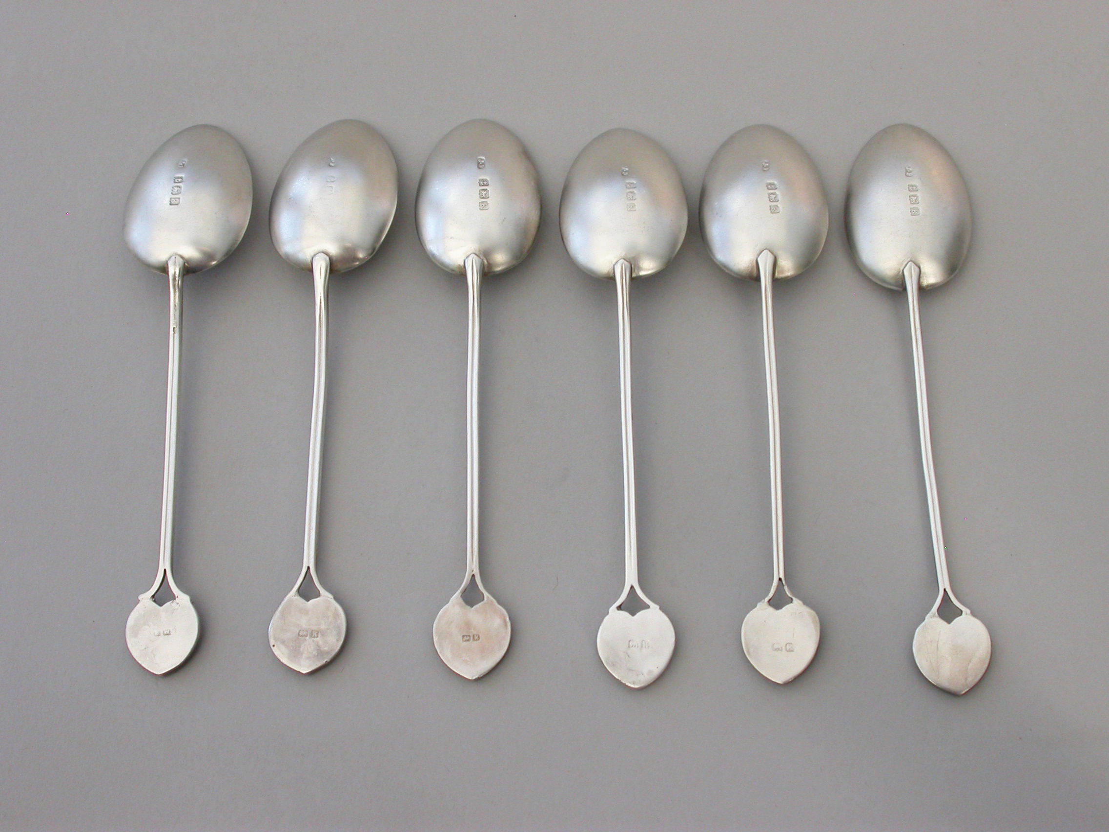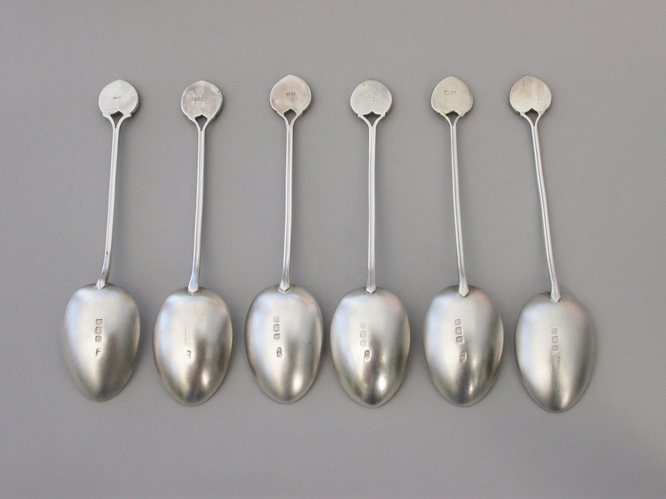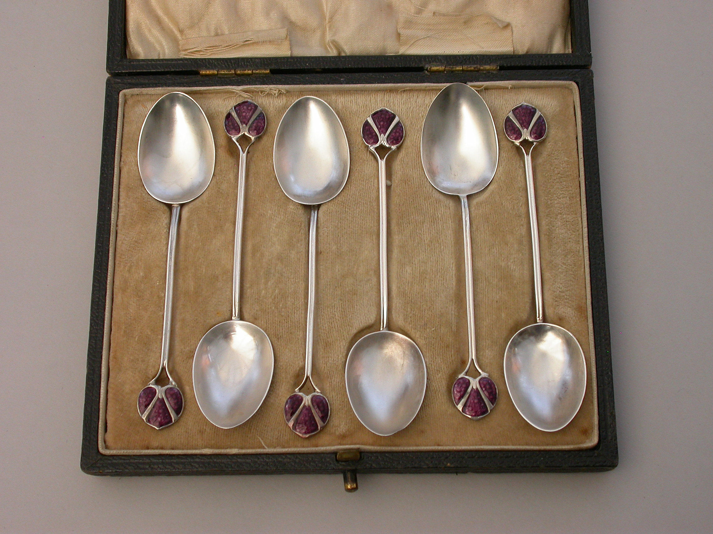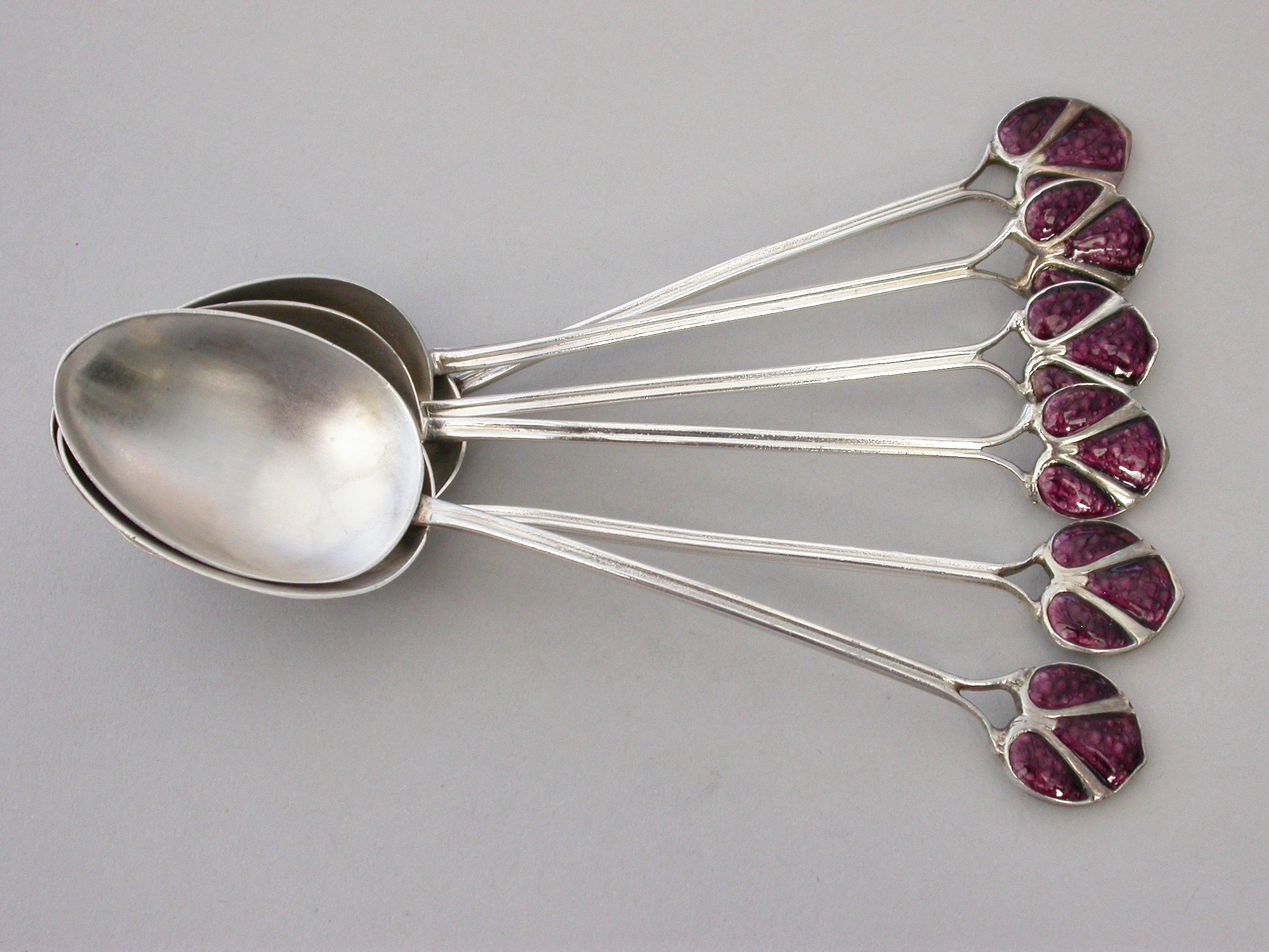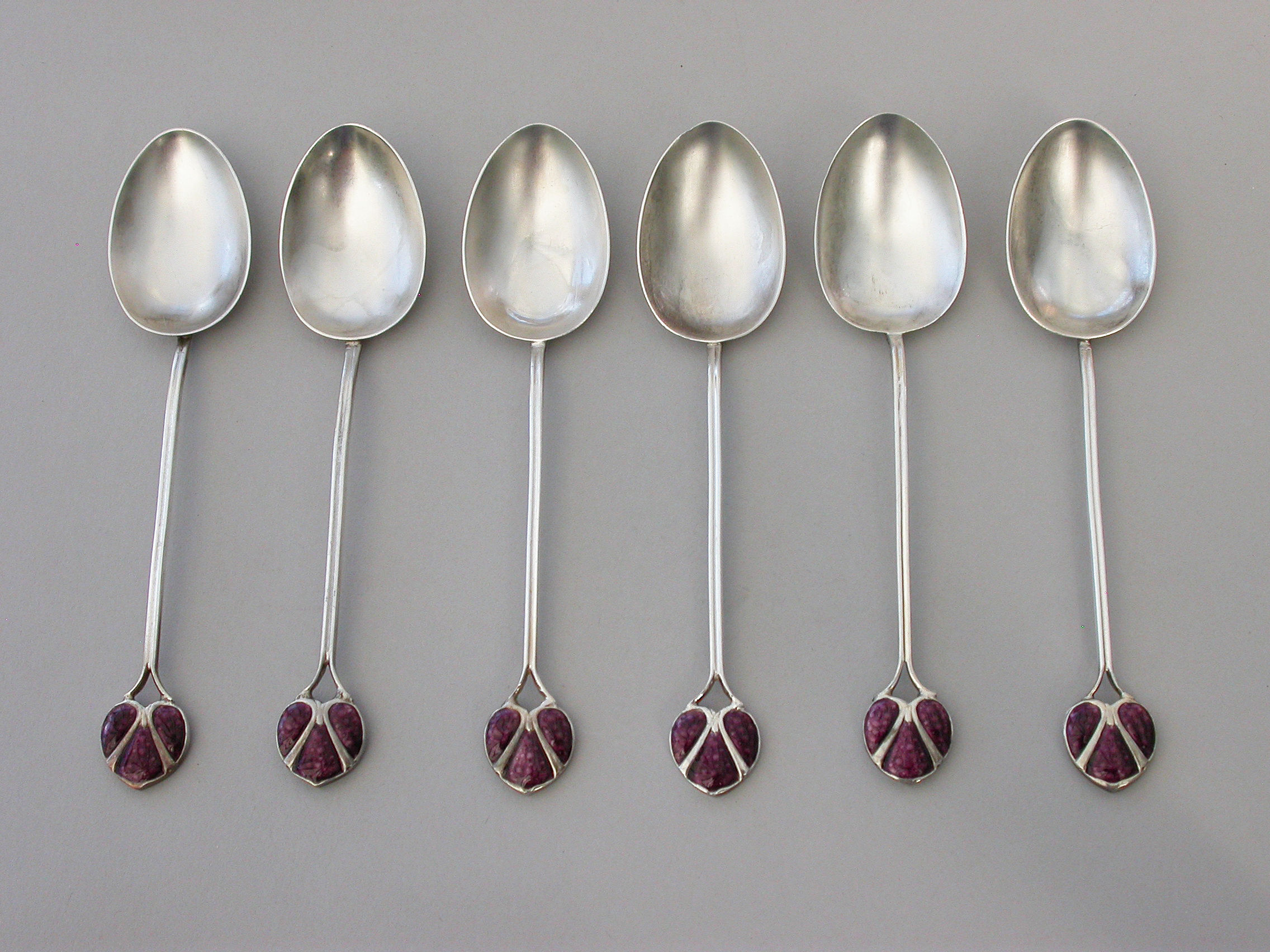 Set 6 Arts & Crafts Silver & Enamel Anthemion Teaspoons