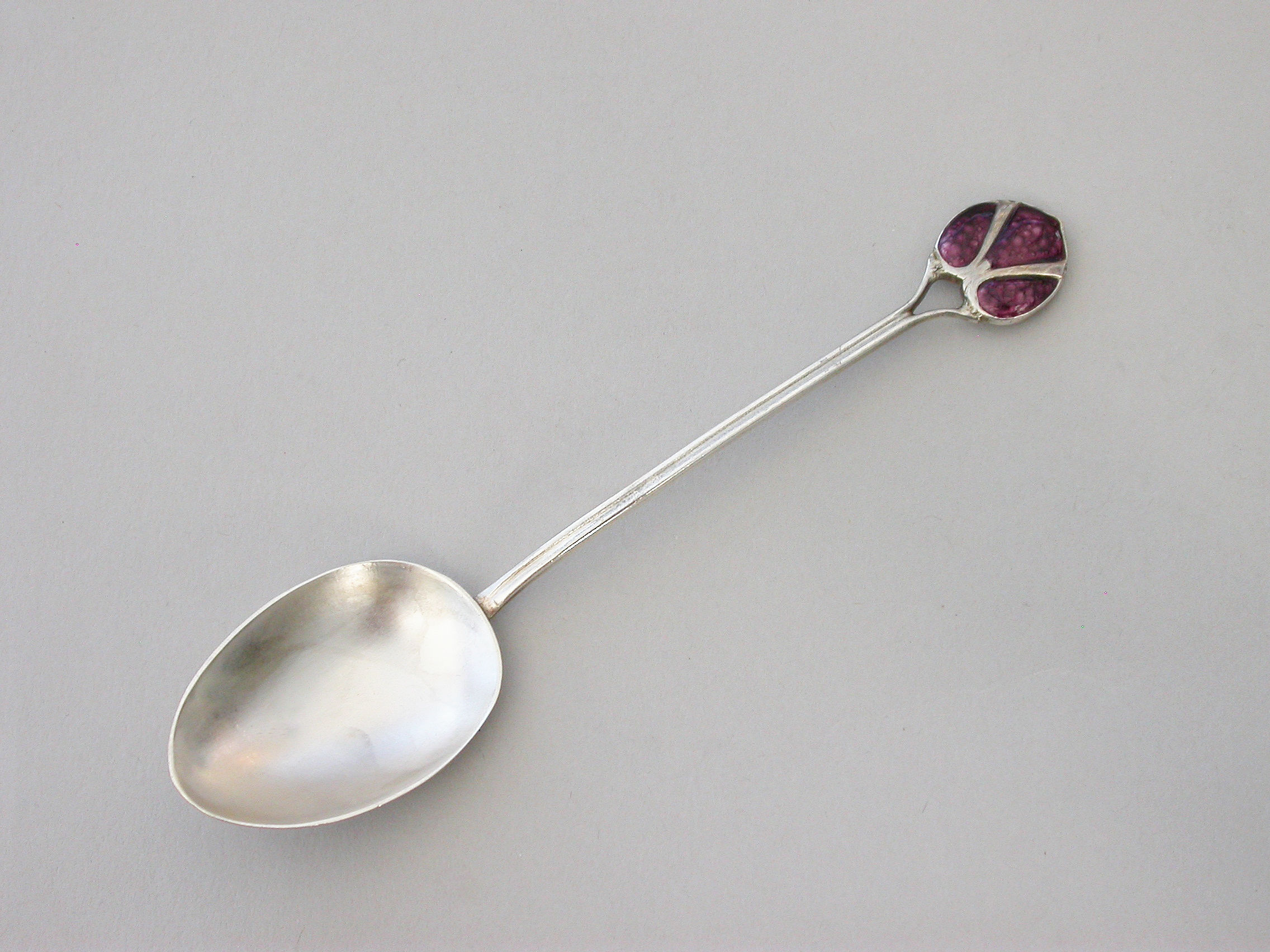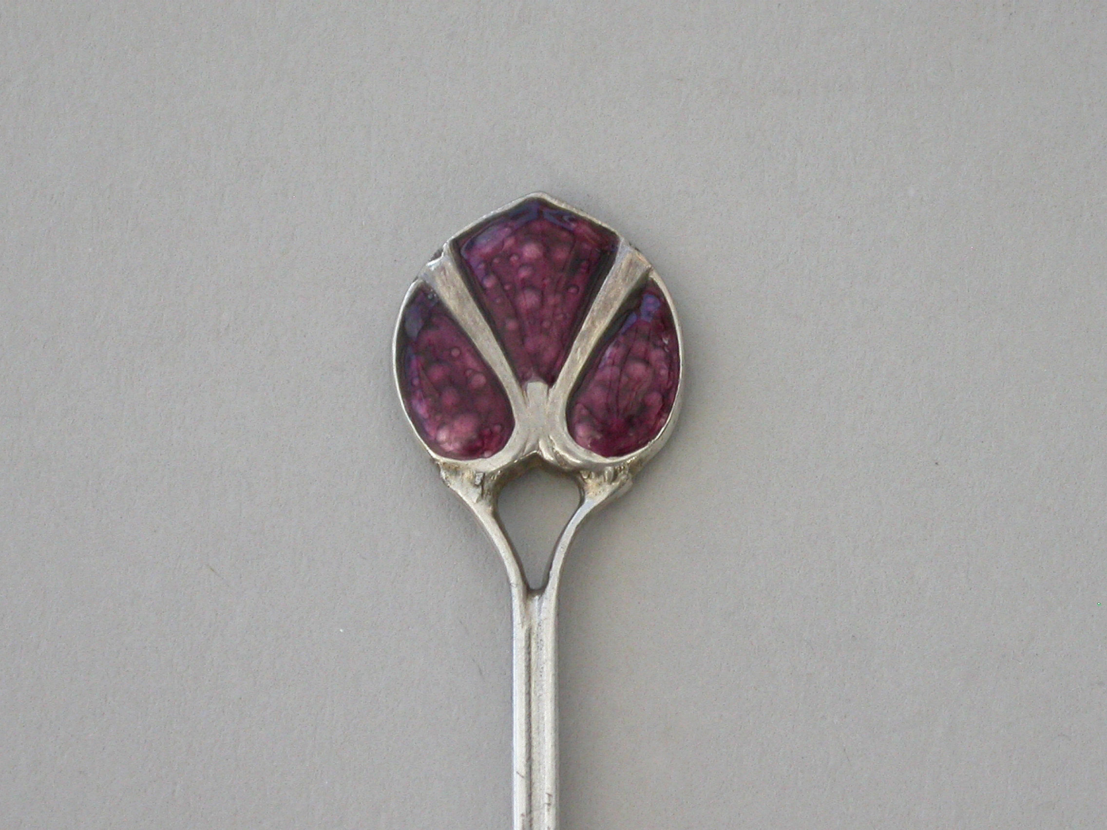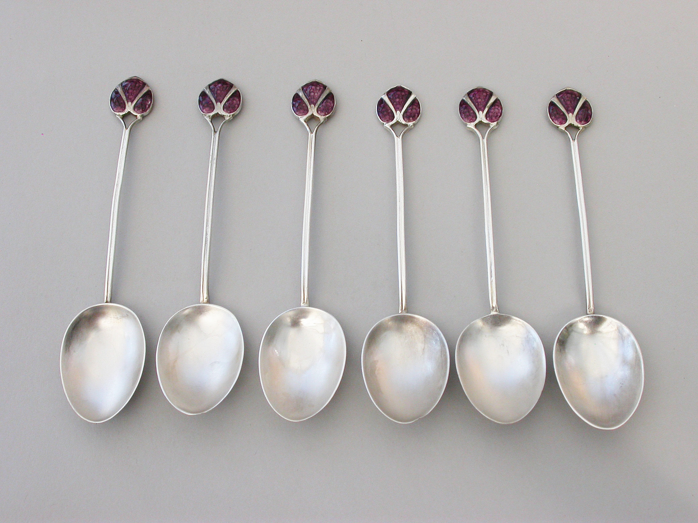 A set of six early 20th century Arts & Crafts style Teaspoons with anthemion shape purple enamel finials.