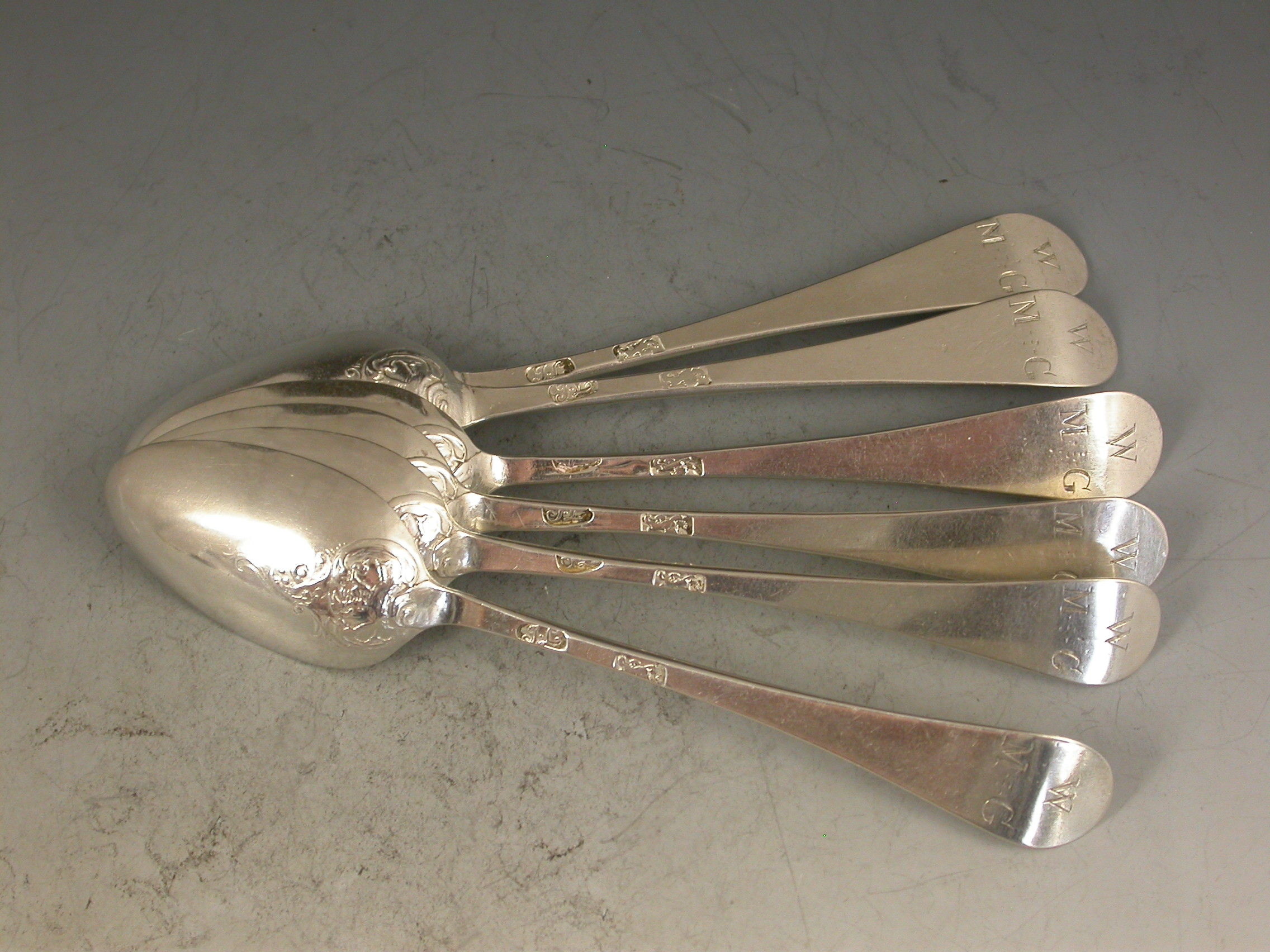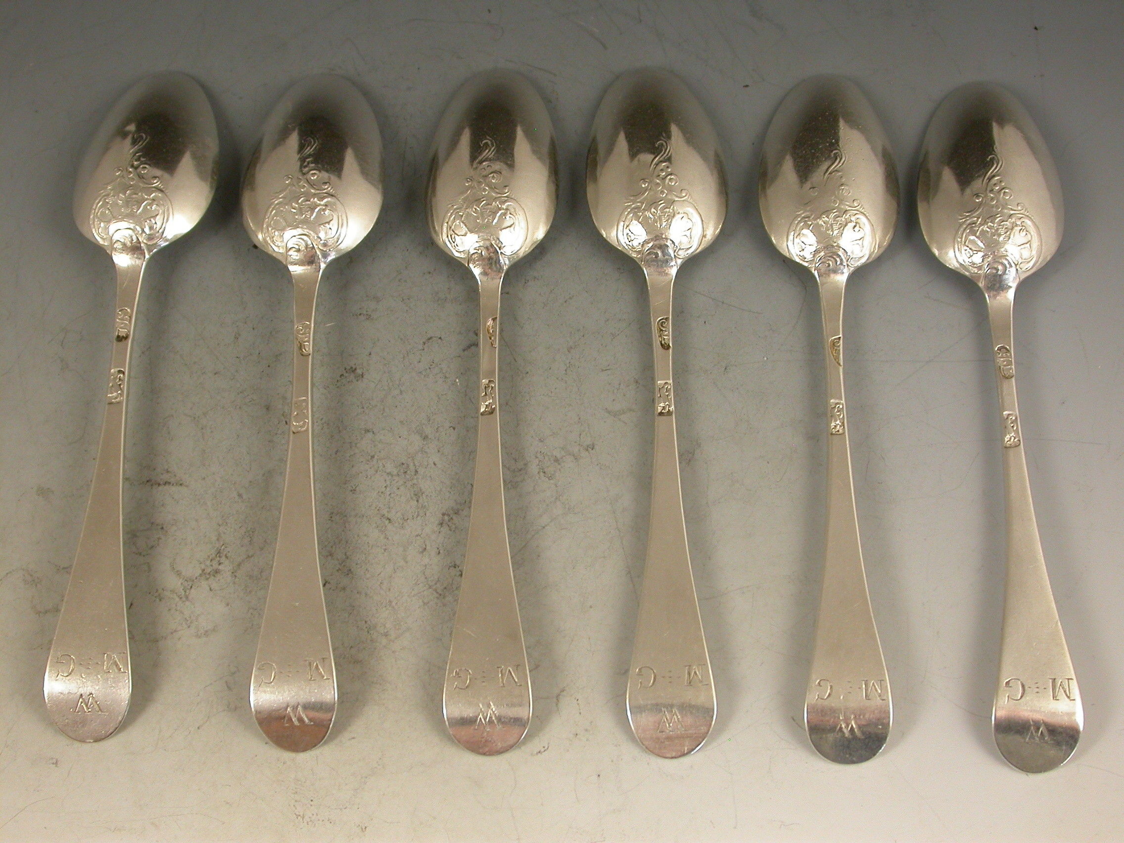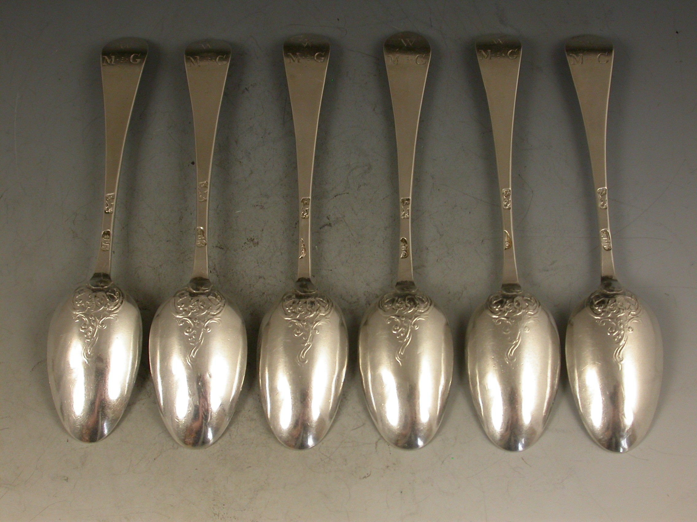 A good set of six early George III silver Hanoverian pattern 'Fancy Back' Teaspoons, the handles engraved with contemporary initials and the backs of the bowls chased with shells and scrolls.