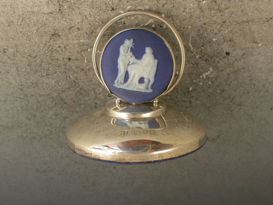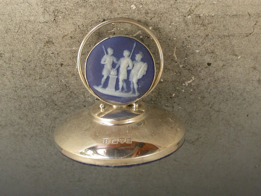 A good set of six Edwardian silver Menu Holders formed from Wedgwood blue Jasperware bosses decorated with classical scenes and set in circular silver mounts on weighted pedestal bases.