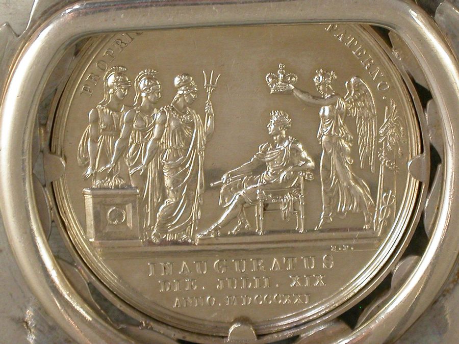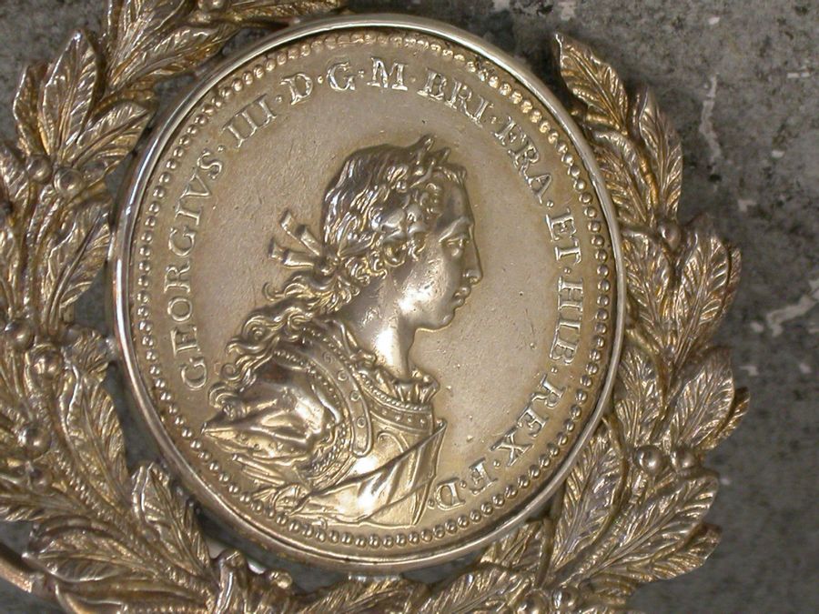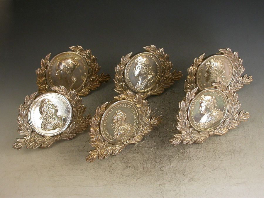 A fine quality large heavy set of six Edwardian silver Menu Holders formed from Medallions surrounded by wreaths, on 'D' shaped stands. The Medallions depicting Queen Anne, George I, George II, George III, George IV and Queen Victoria.