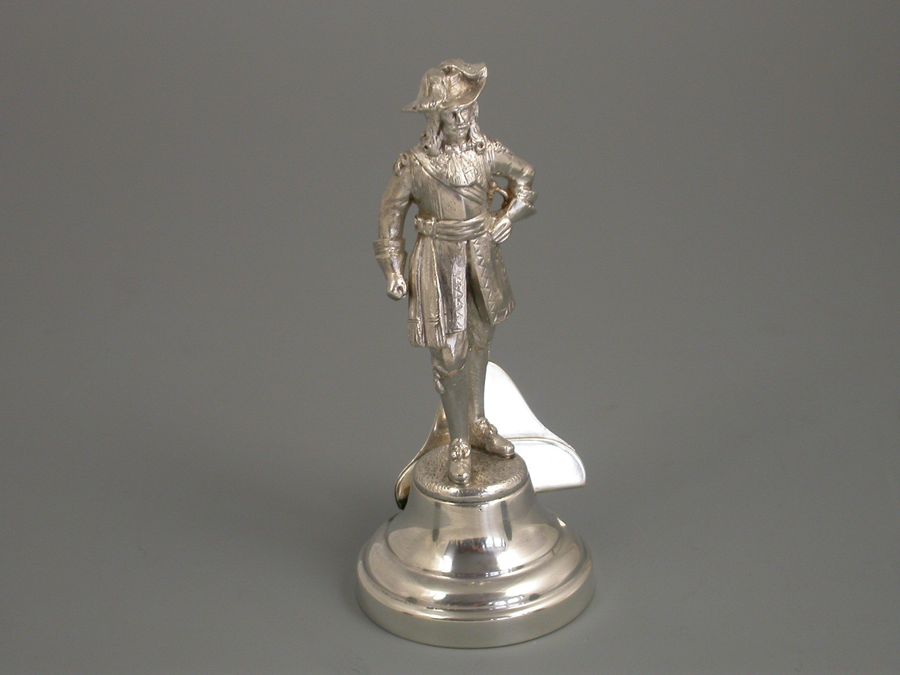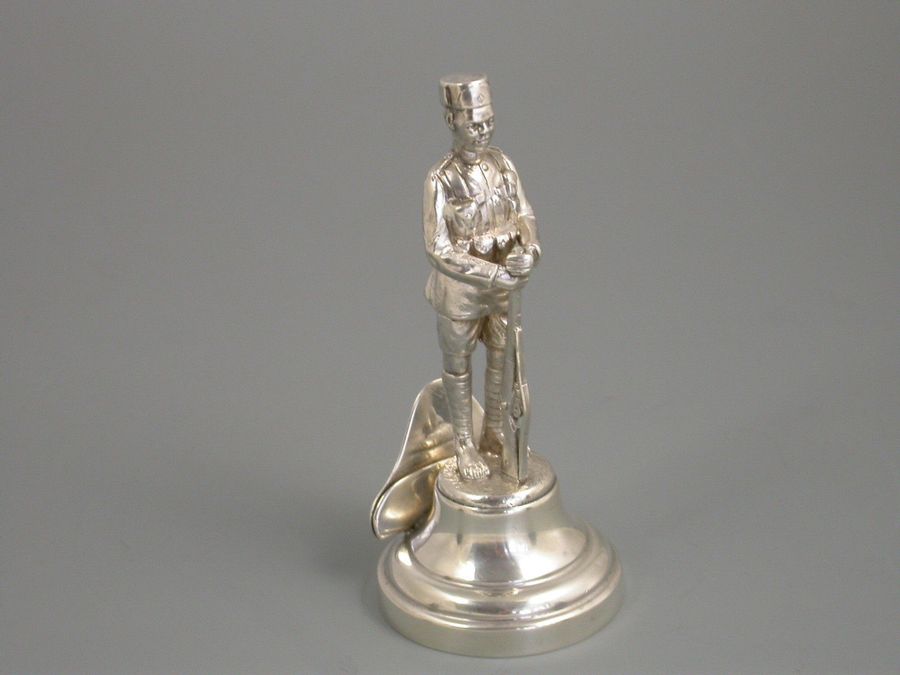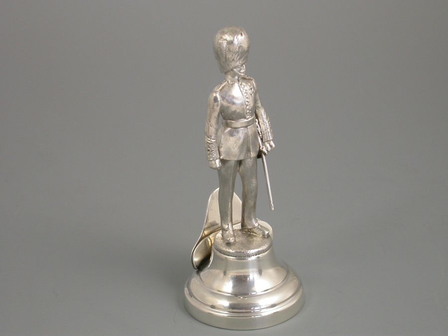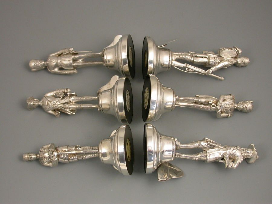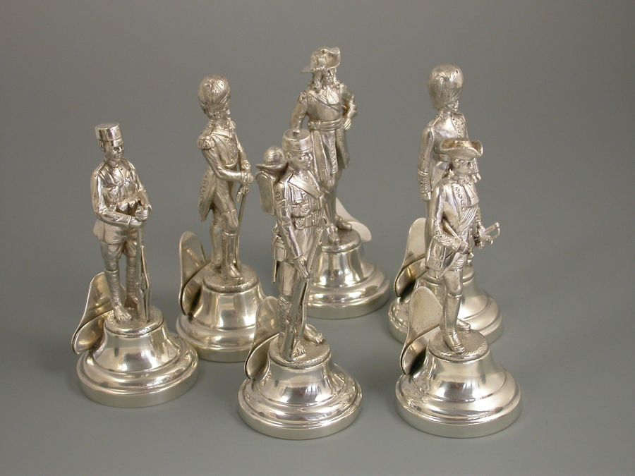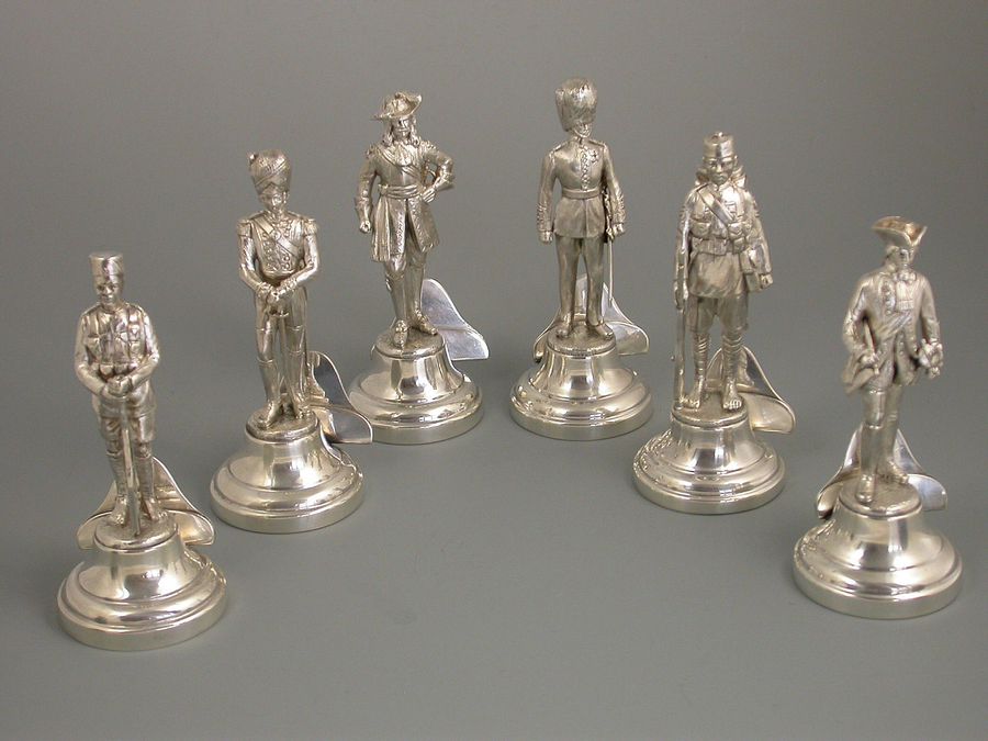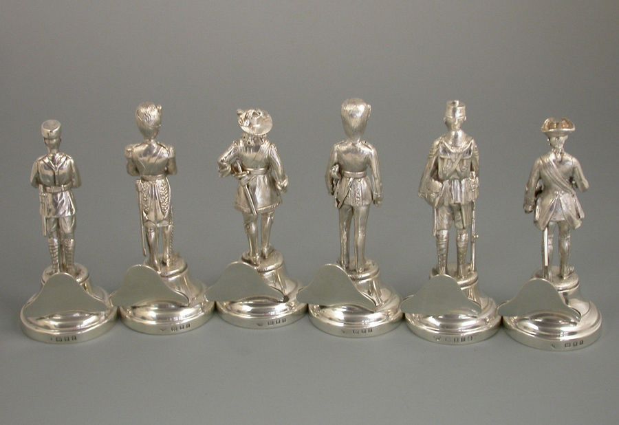 A fine quality and rare set of six George V silver Menu Holders each formed as a different Military Soldier, standing on circular filled pedestal bases set with ivory discs. Depicting a Grenadier, a Cavalier, a Red Coat, a Guardsman, a Colonial Asian Solider and a Colonial Indian Soldier.