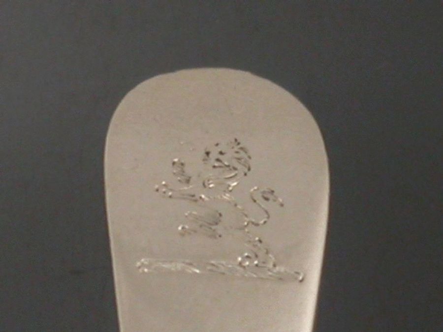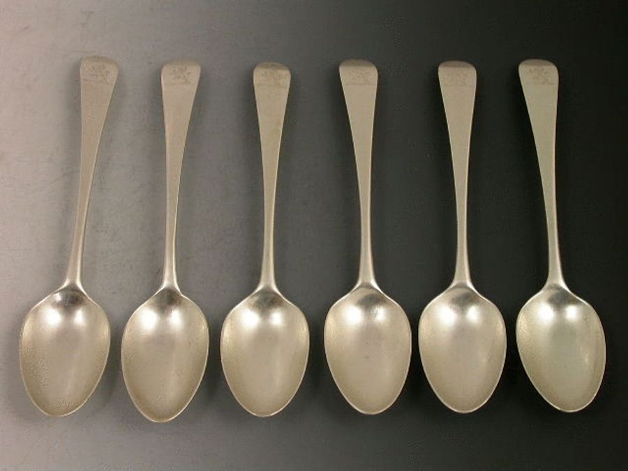 A good set of six Georgian plain Old English pattern Tea Spoons, engraved with contemporary crests depicting rampant lions.