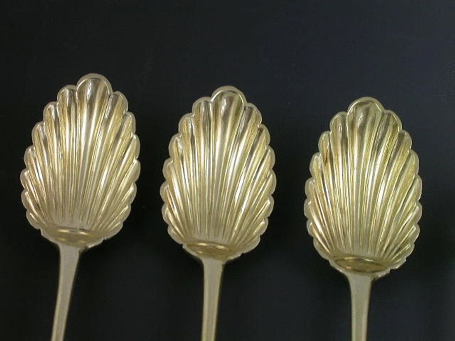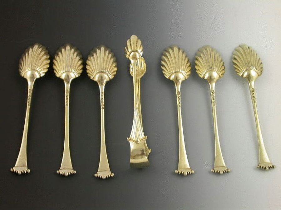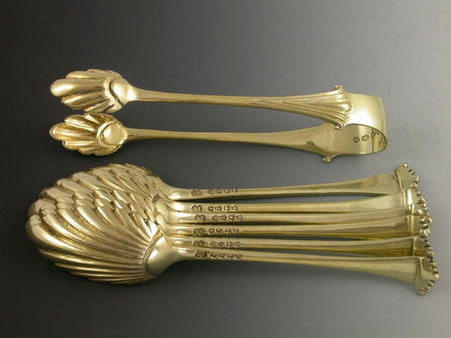 A fine set of six Victorian silver gilt Tea Spoons with Sugar Tongs en-suite, of Onslow pattern, with fluted bowls in the Georgian style.