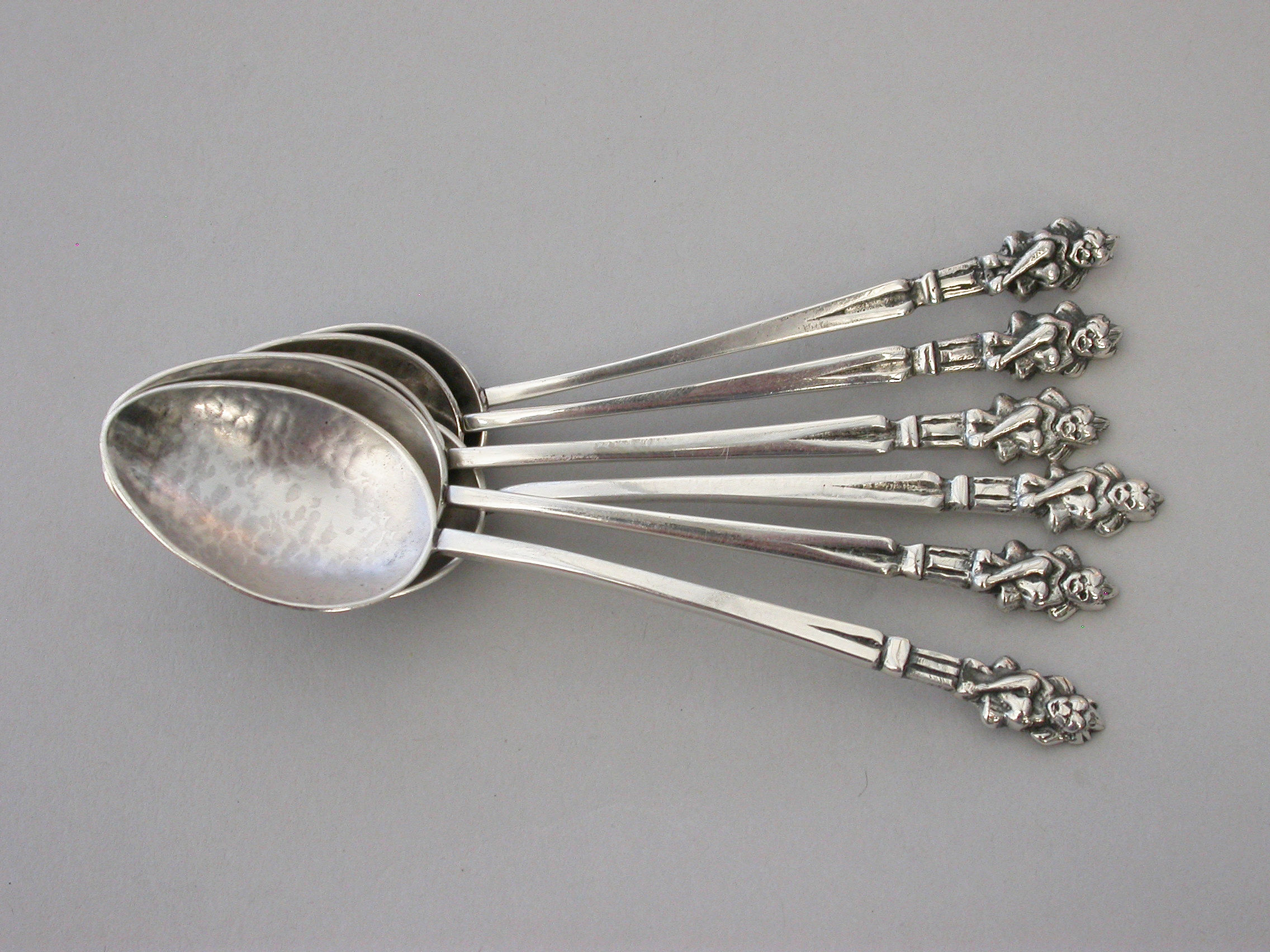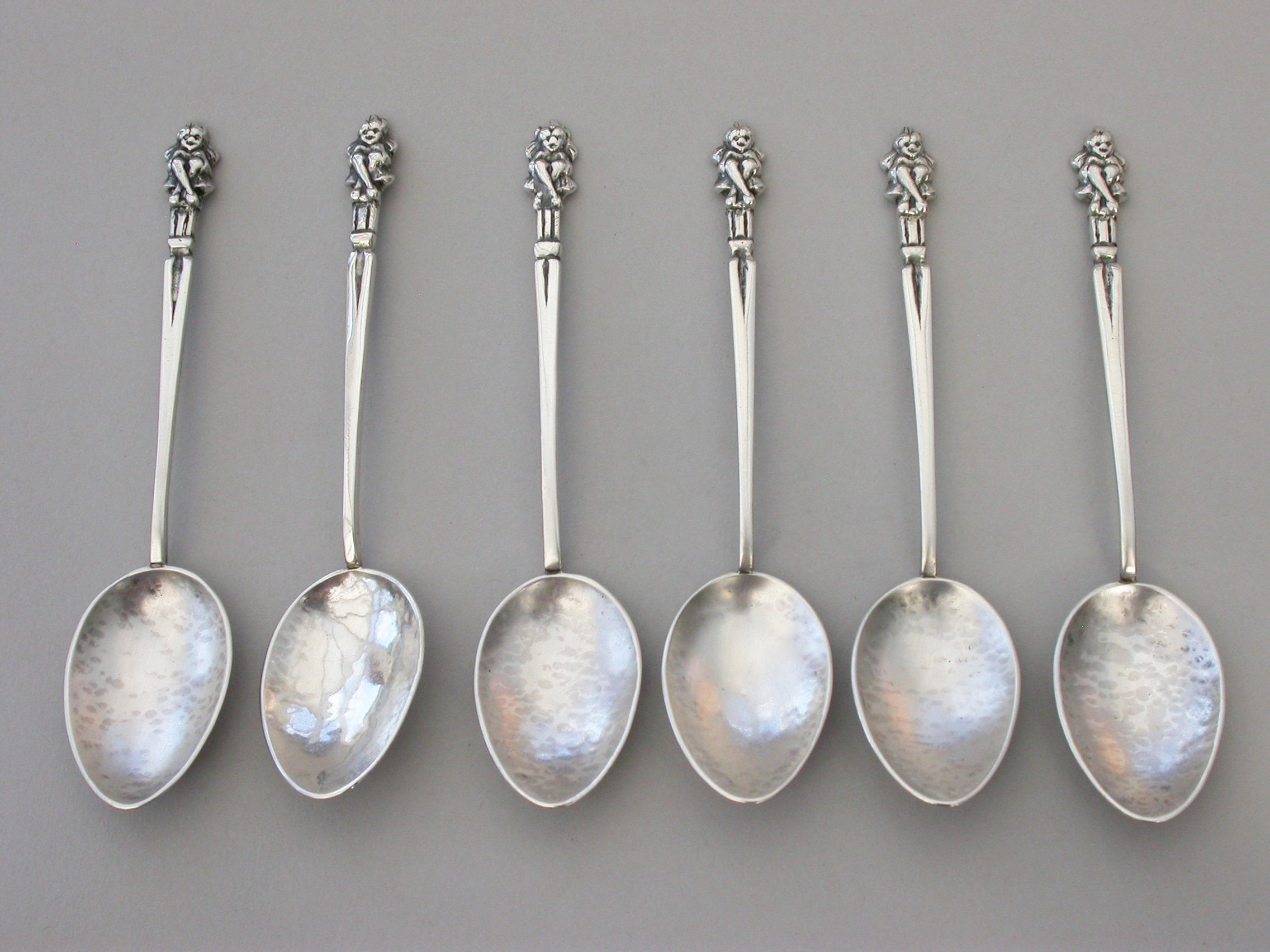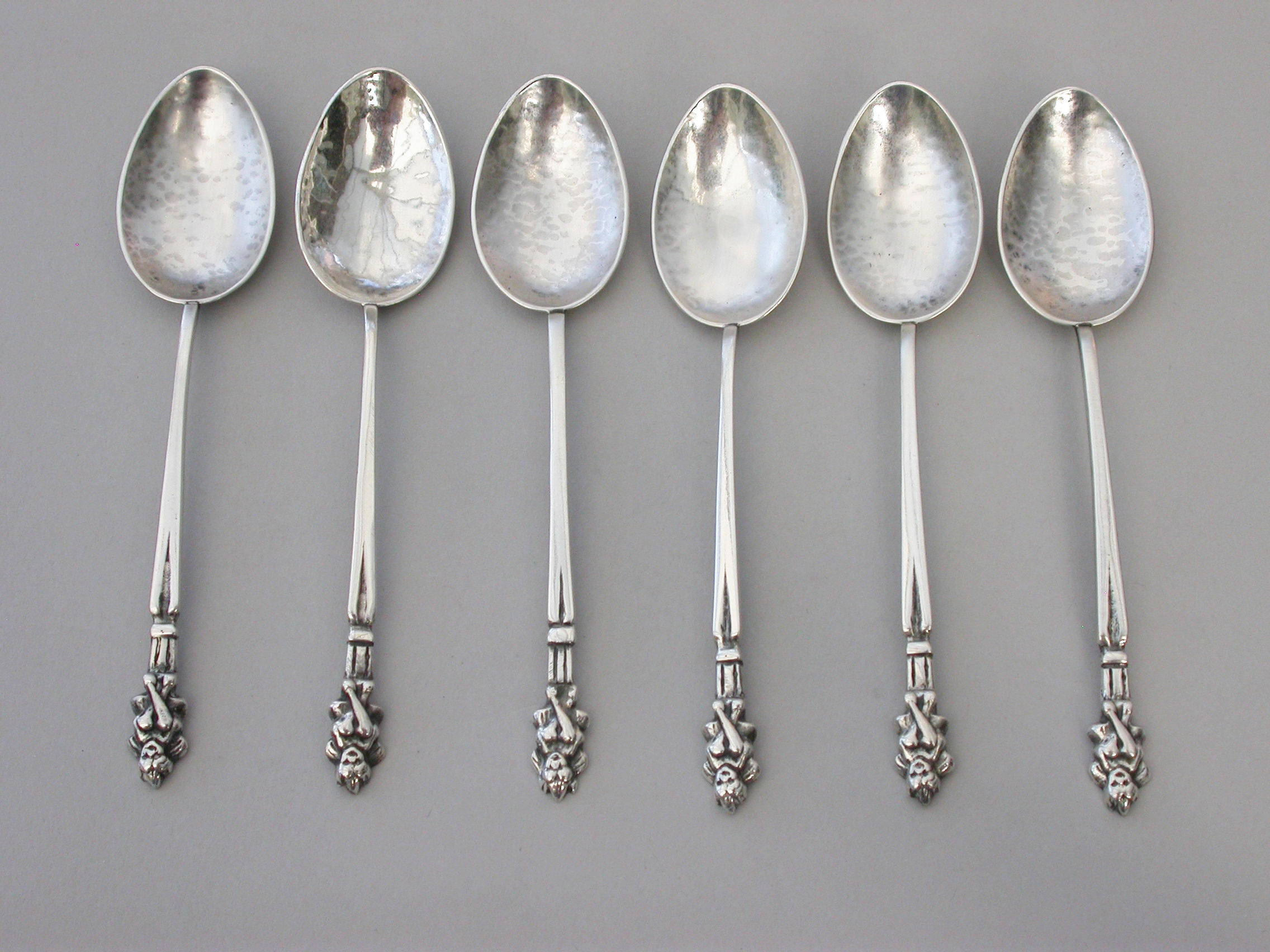 A set of six early 20th century hammered silver Teaspoons, the tapering stems with ""Pixie finials"".