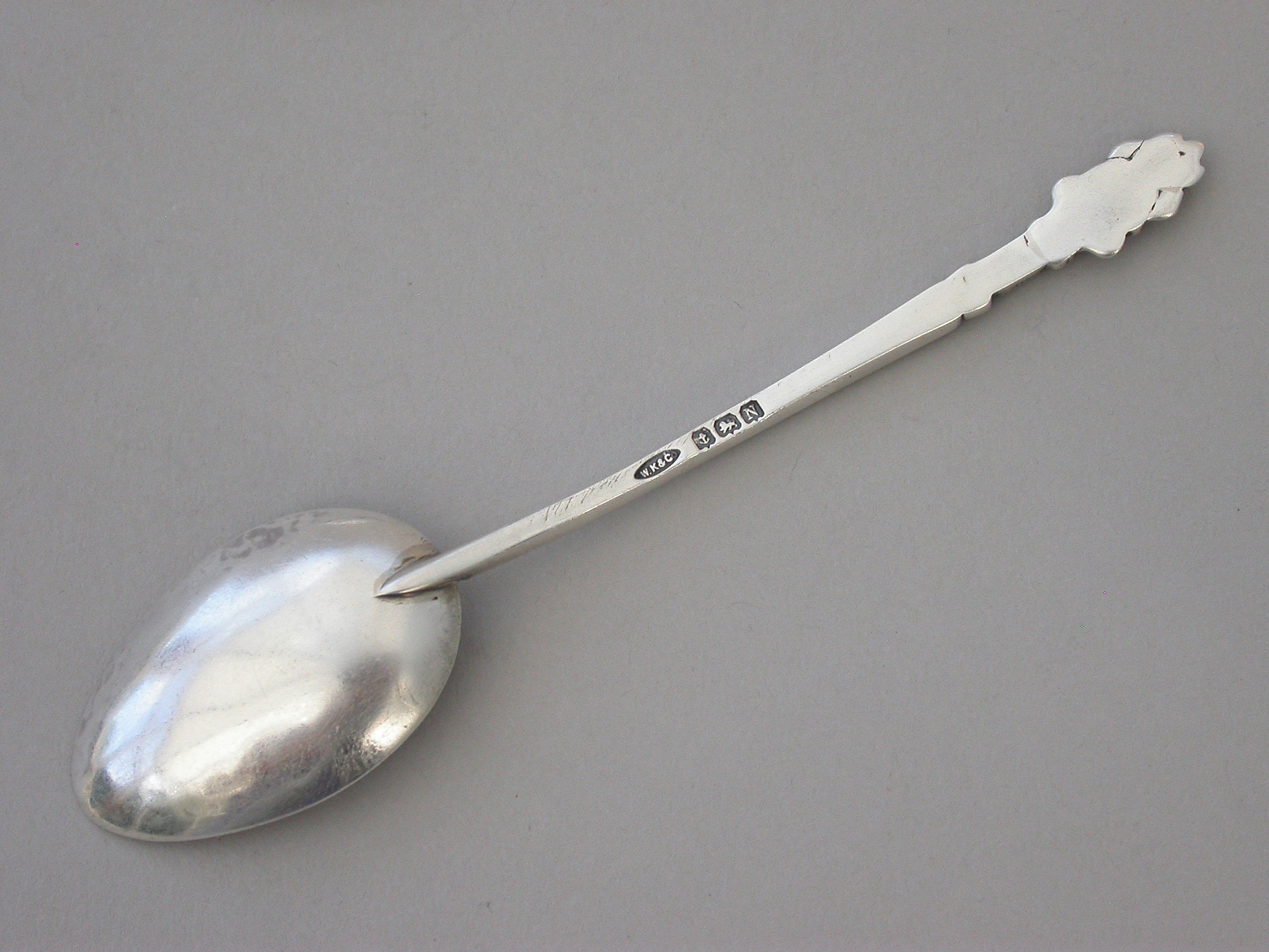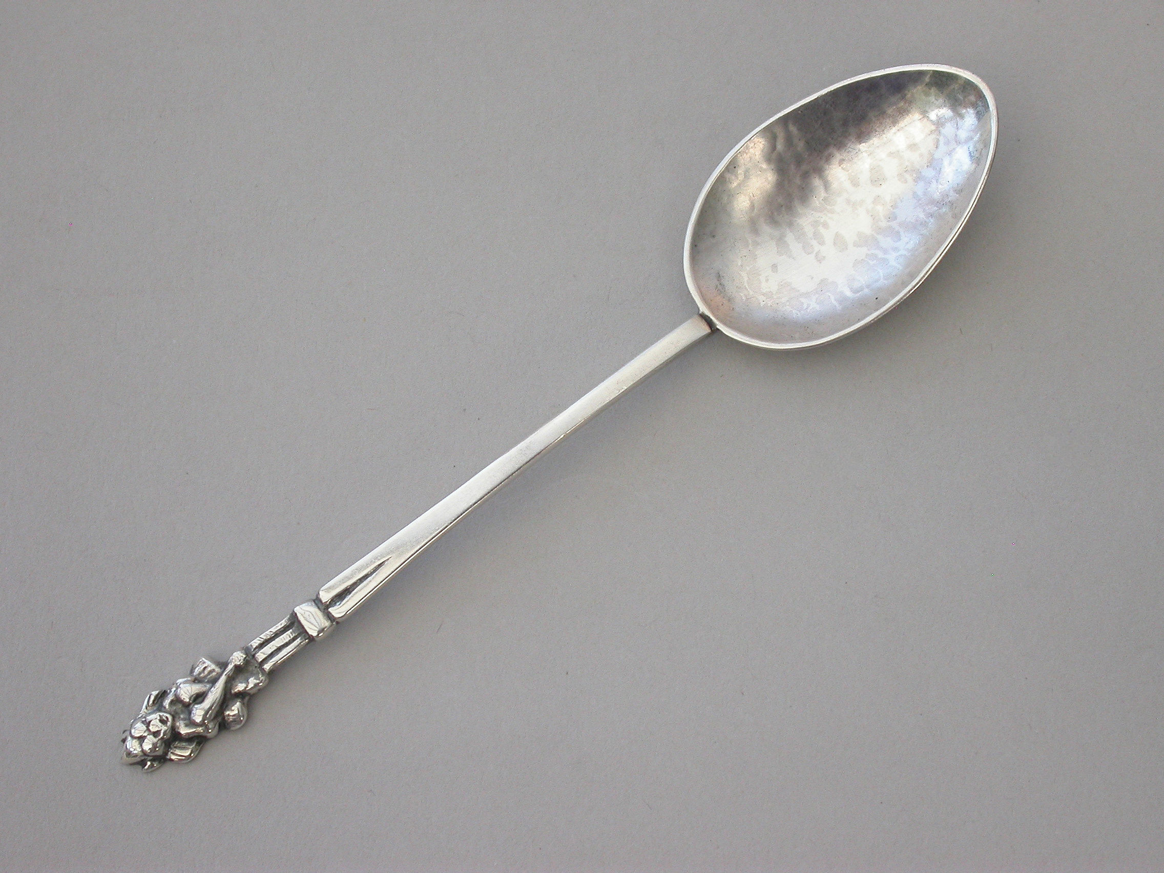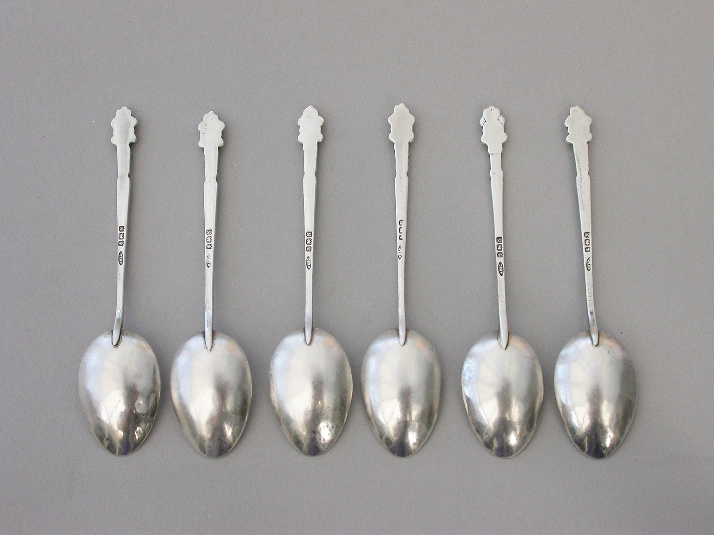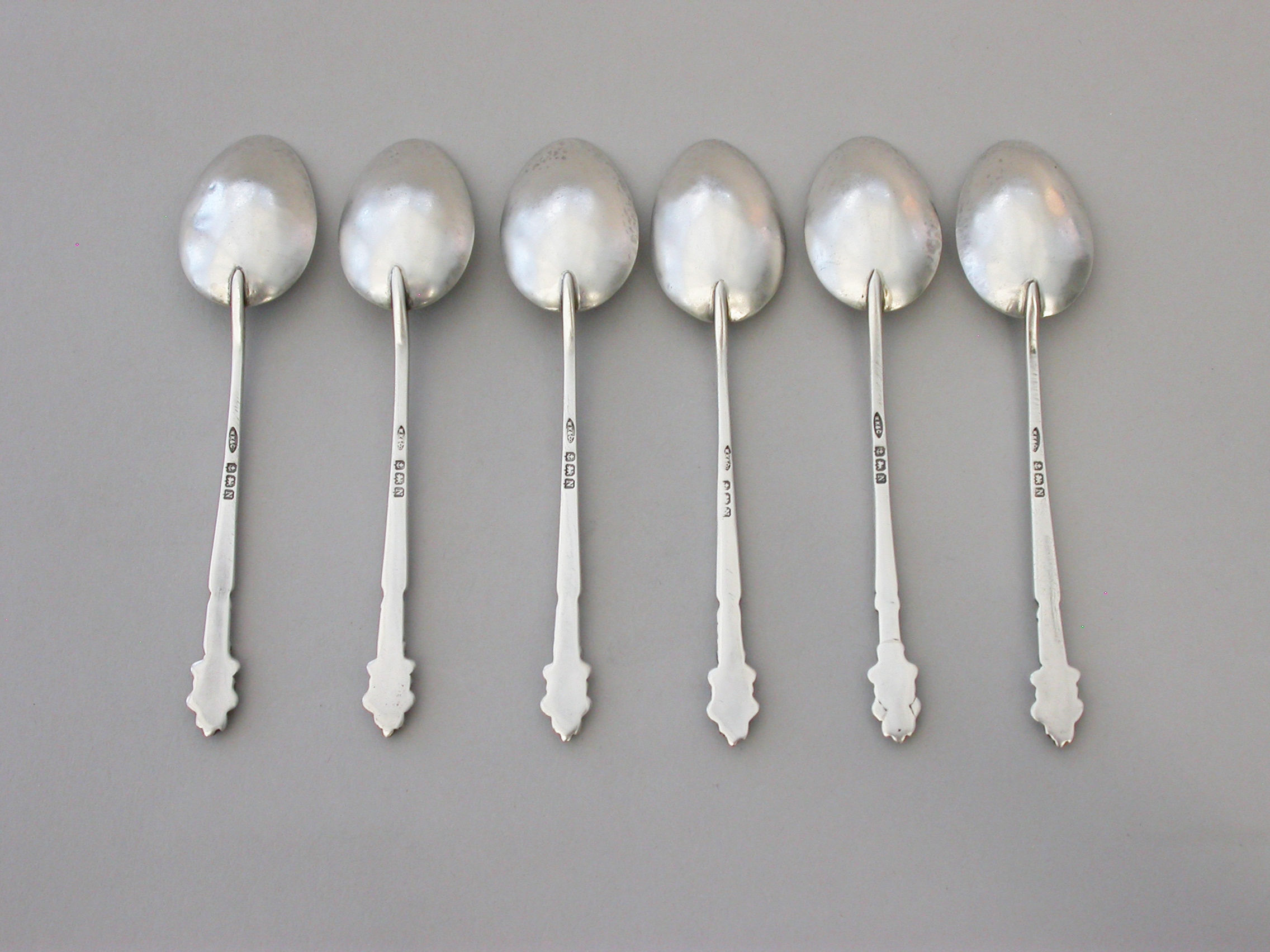 A set of six early 20th century hammered silver Teaspoons, the tapering stems with ""Pixie finials"".