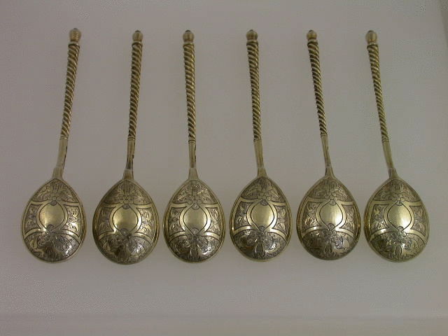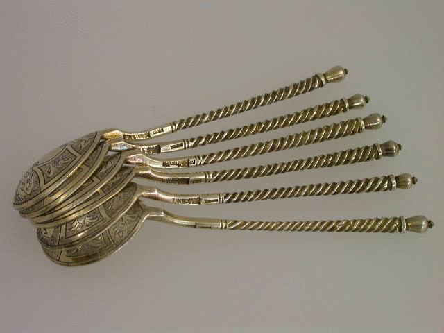 A good set of six Russian silver gilt Teaspoons with decorative engraving to the back of the bowls and twisted shafts.