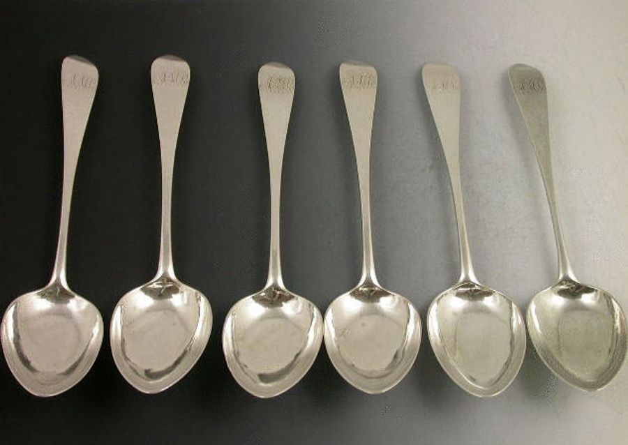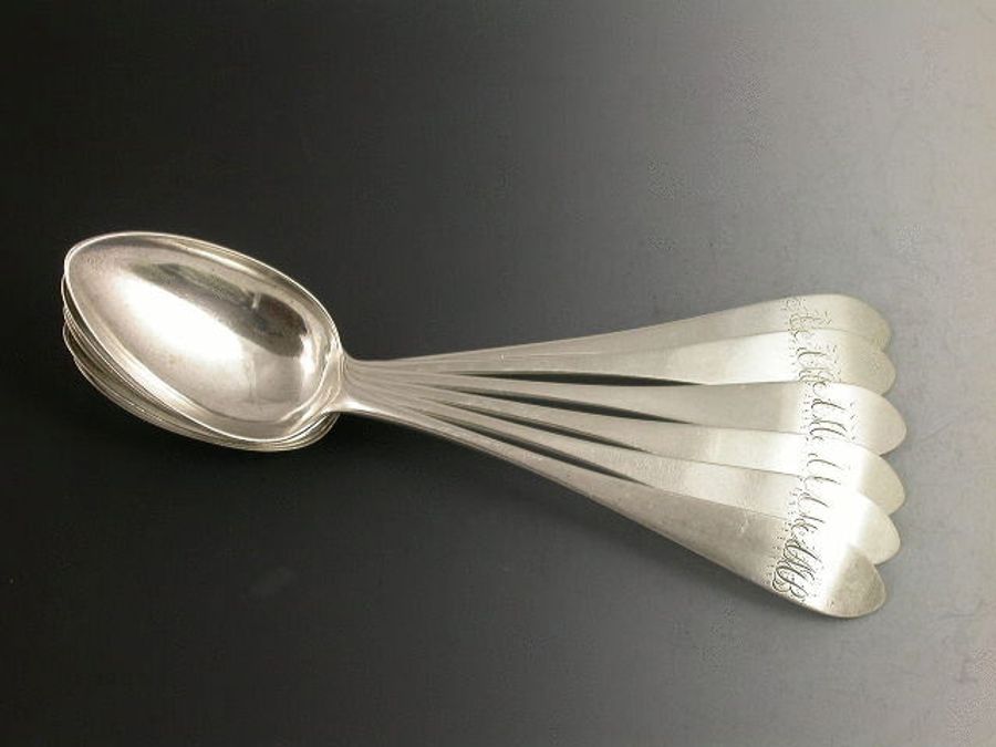 A good set of six Scottish Provincial silver Dessert Spoons of plain Celtic point design, the handles engraved with initials AMB.