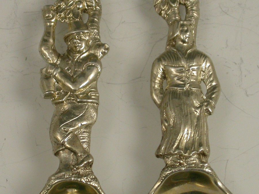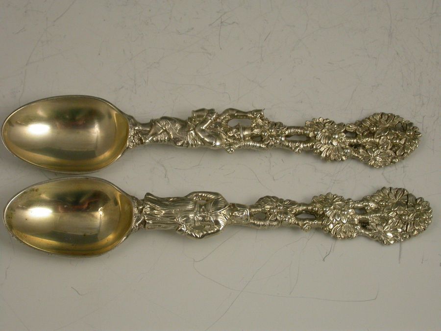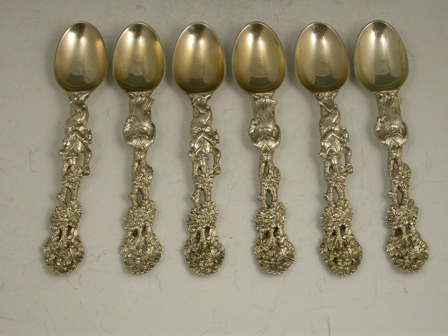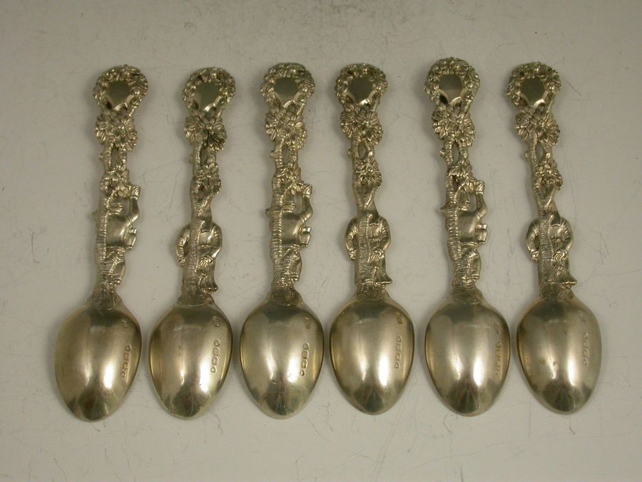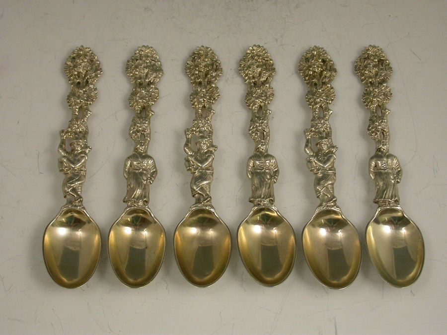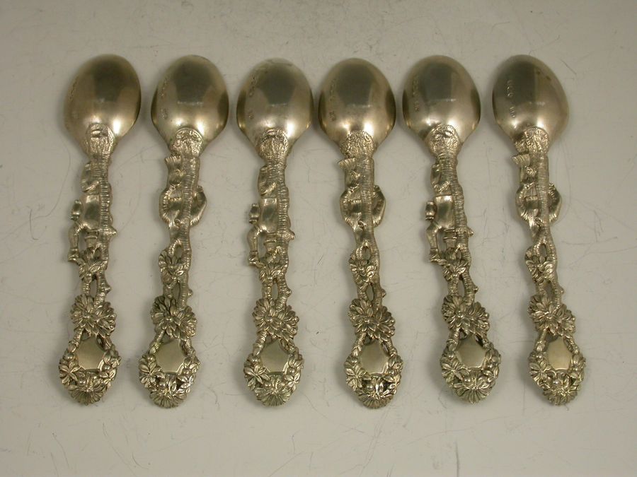 A fine quality set of six Victorian cast silver naturalistic Teaspoons, the handles formed as tree trunks with Dutch Teniers type figures leaning against them (three male & three female).