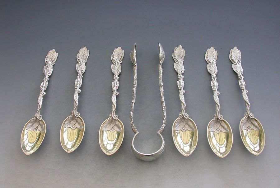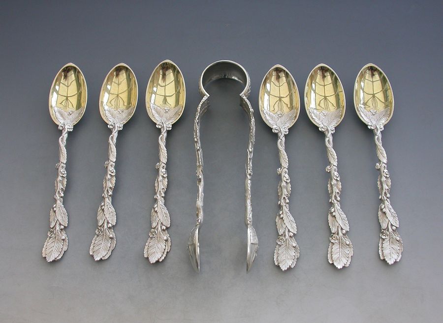 A fine quality set of six Victorian cast silver naturalistic Teaspoons, the handles formed from inter-twinned leaves and flower headed, silver gilt bowls. Complete with matching pair of Sugar Tongs.