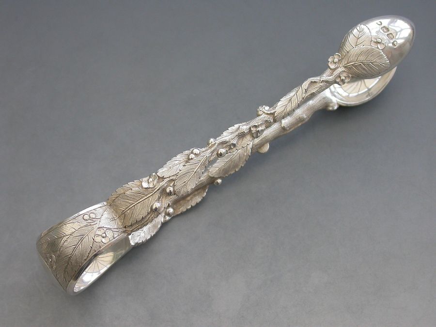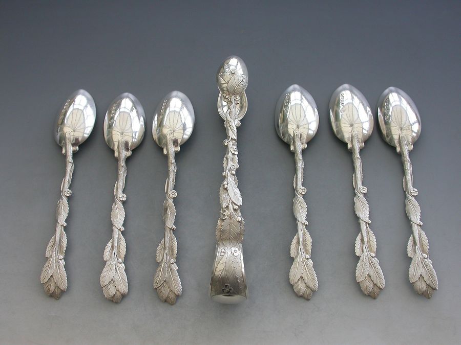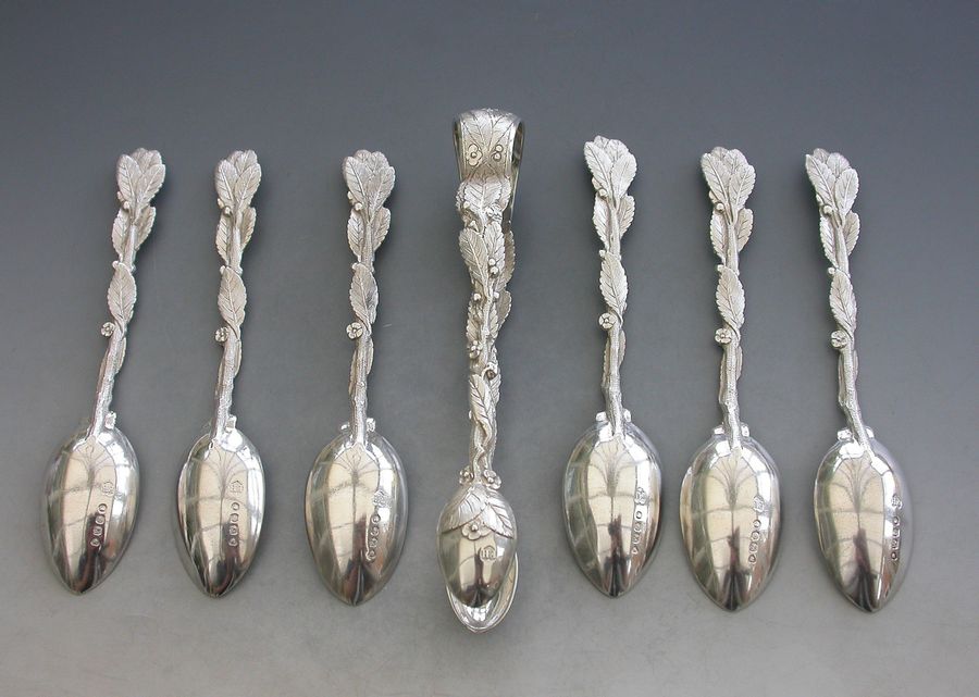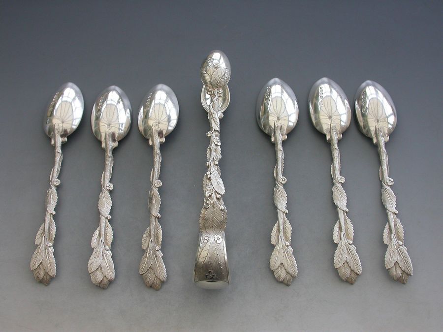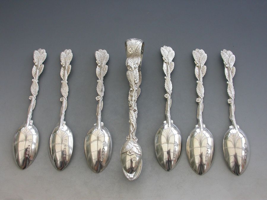 Set 6 Victorian Cast Silver Naturalistic Teaspoons plus matching Tongs