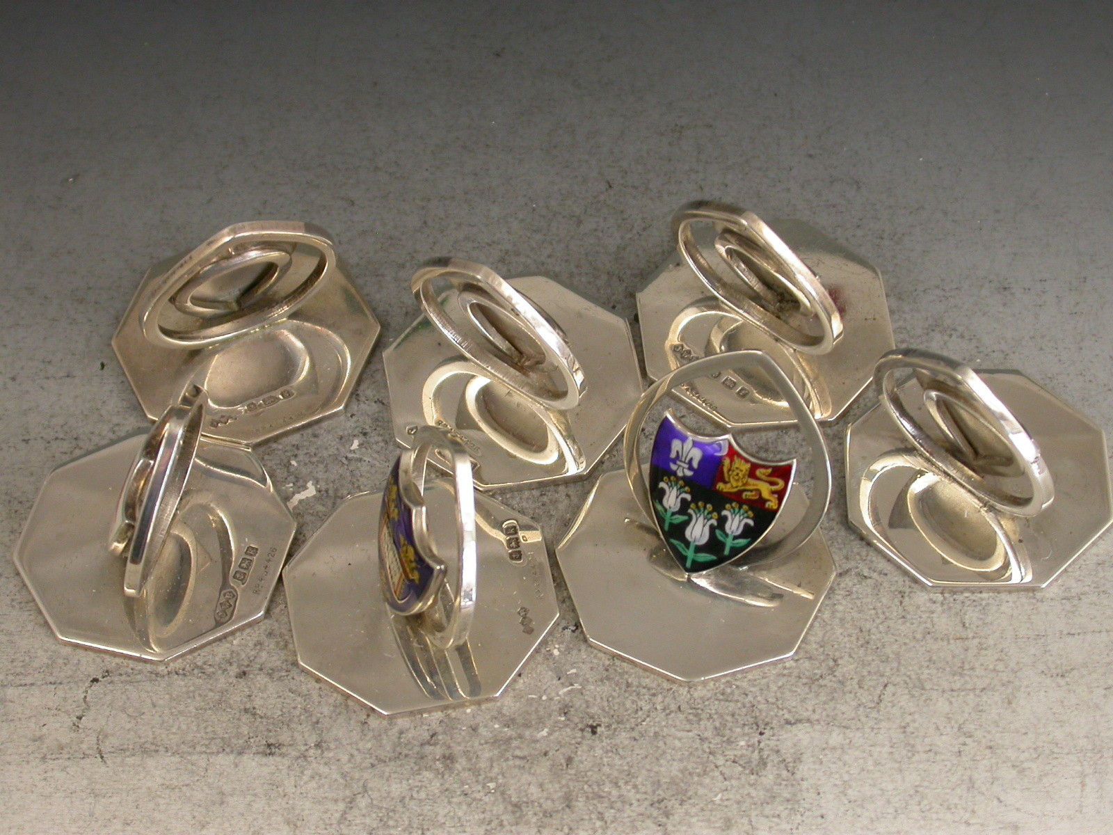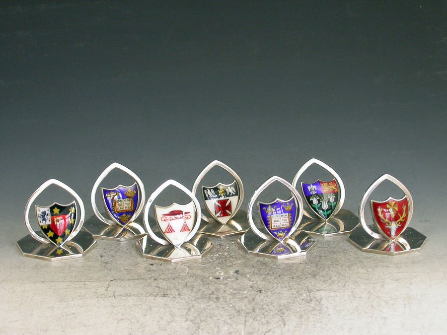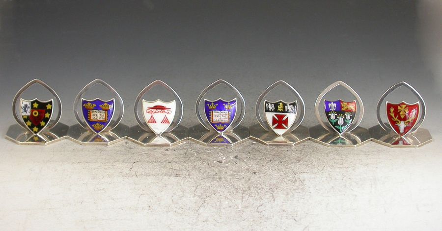 Set 7 Edwardian Silver & Enamel 'Oxford & Cambridge' University College Menu Holders