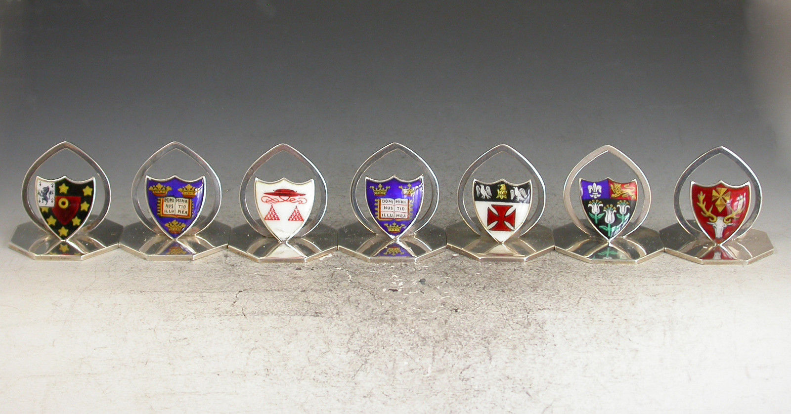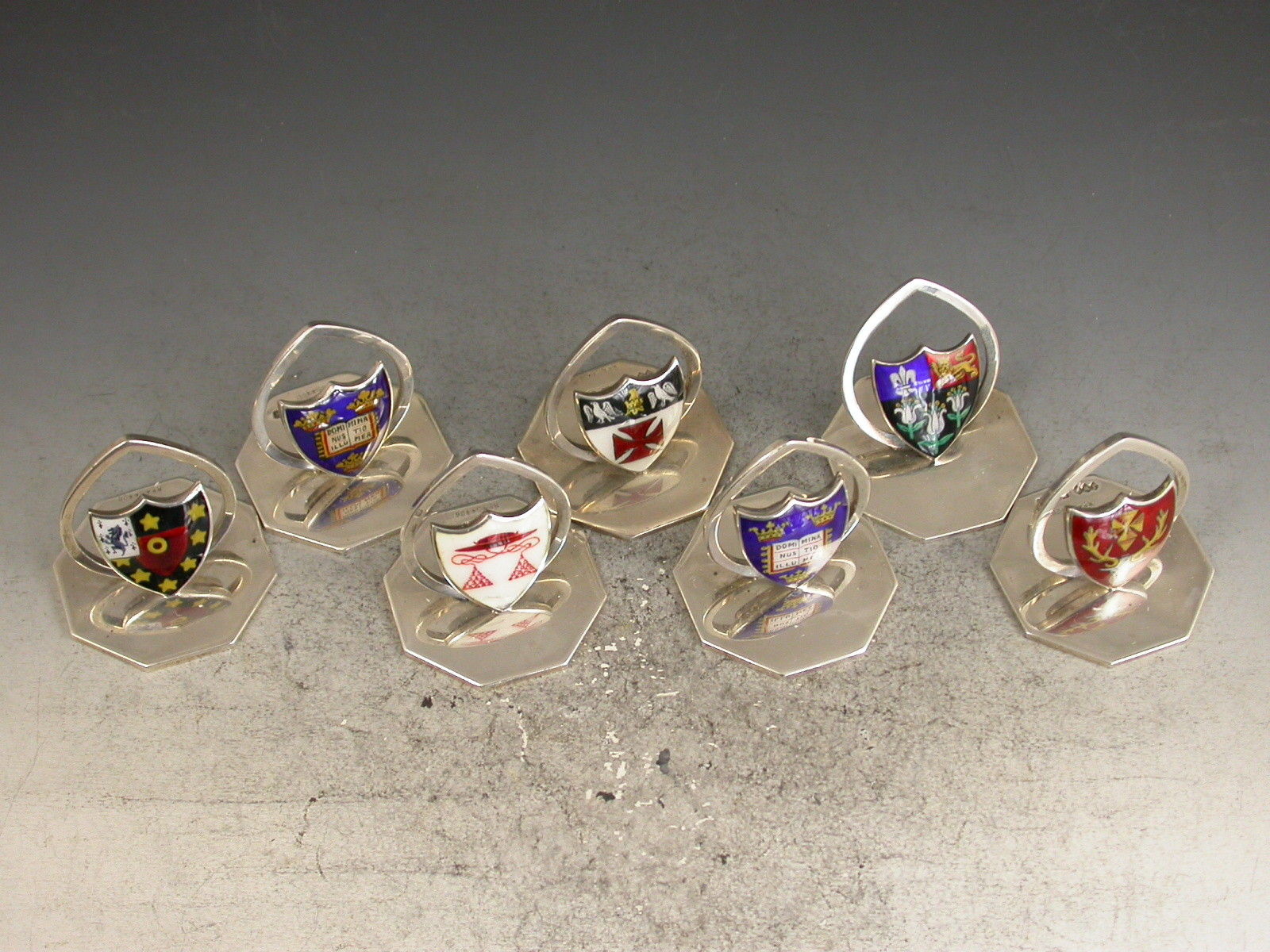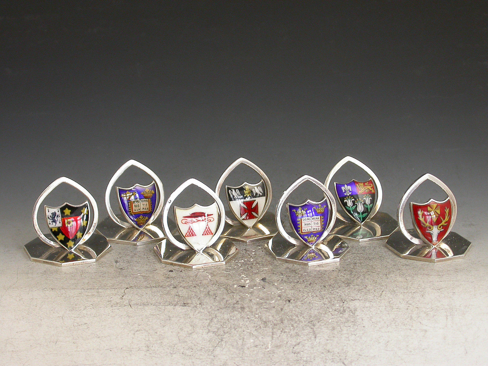A fine and rare assembled set of seven Edwardian silver and enamel Oxford and Cambridge University College Menu Holders, the shield shaped stands on octagonal bases, enamelled with the Coats of Arms of Oxford University (2), St Johns College Oxford, Hertford College Oxford, Kings College Cambridge, Eton College School and a red Cardinal's Hat possibly for Christchurch College Oxford.