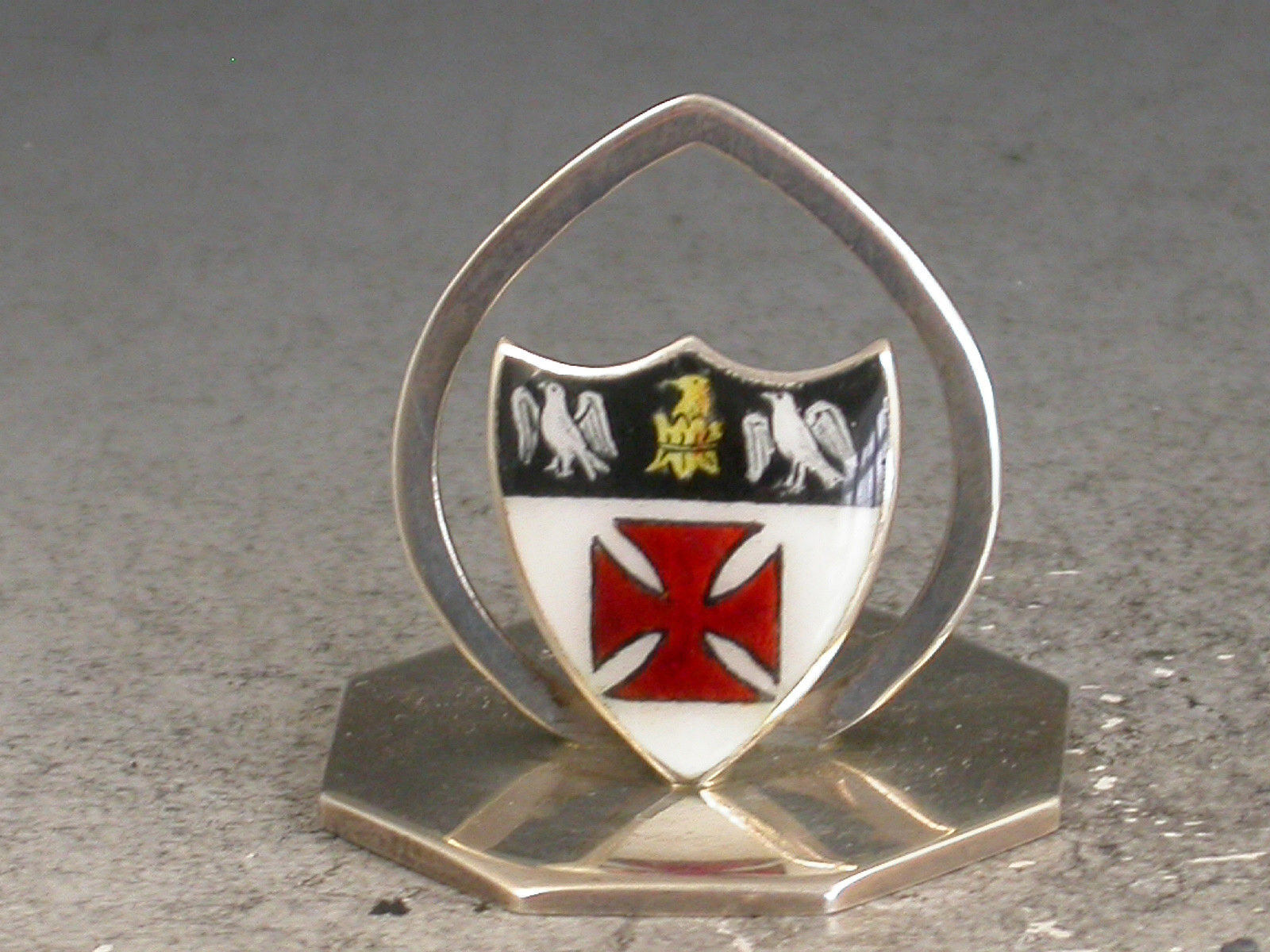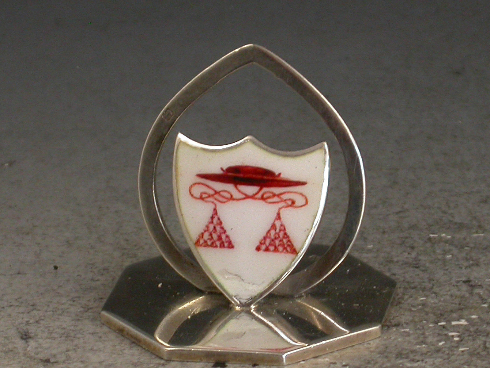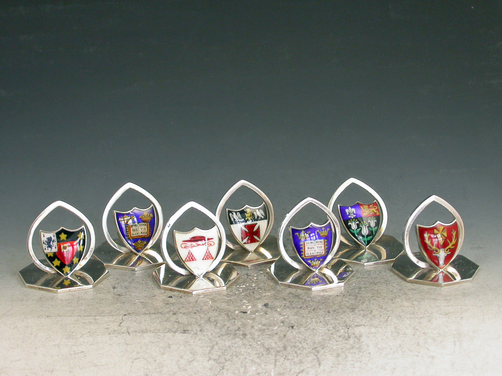 A fine and rare assembled set of seven Edwardian silver and enamel Oxford and Cambridge University College Menu Holders, the shield shaped stands on octagonal bases, enamelled with the Coats of Arms of Oxford University (2), St Johns College Oxford, Hertford College Oxford, Kings College Cambridge, Eton College School and a red Cardinal's Hat possibly for Christchurch College Oxford.