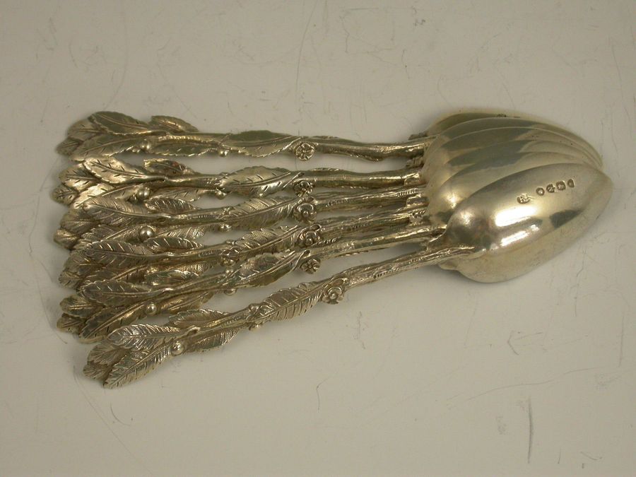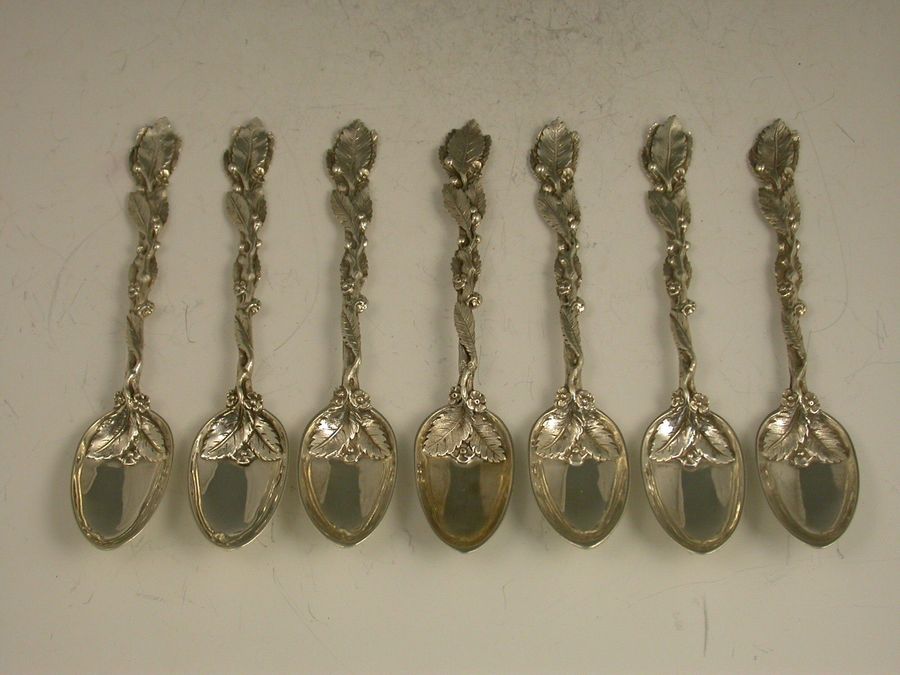Set 7 Victorian Cast Silver Naturalistic Leaf Teaspoons