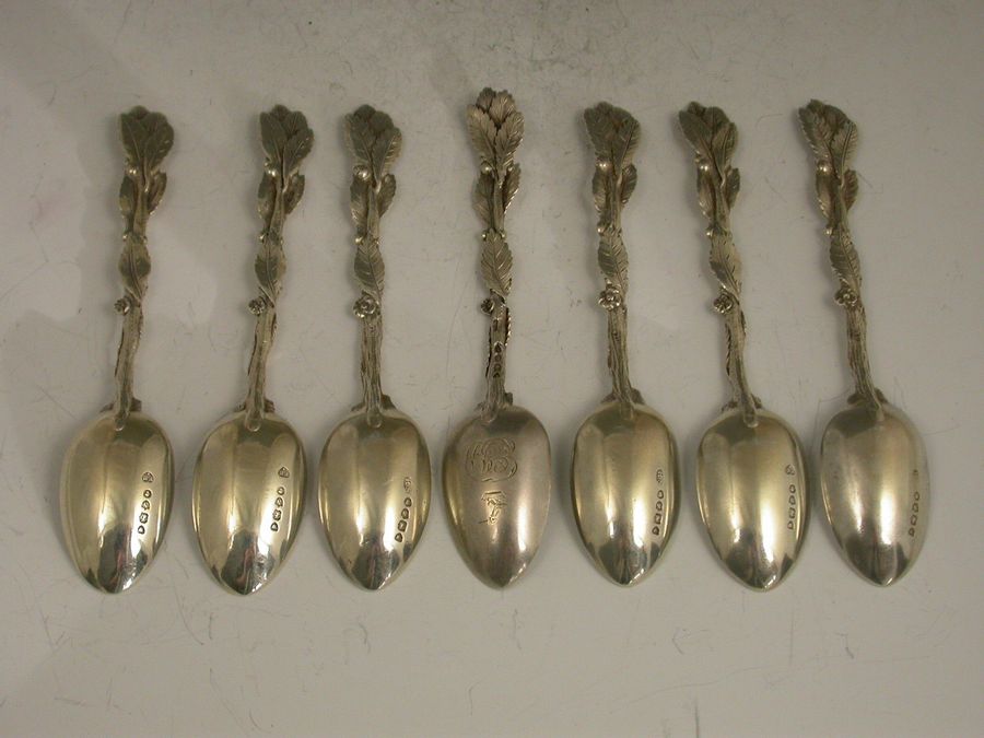 A good set of seven Victorian cast silver naturalistic Teaspoons, the handles formed from intertwined leaves with flower heads.
